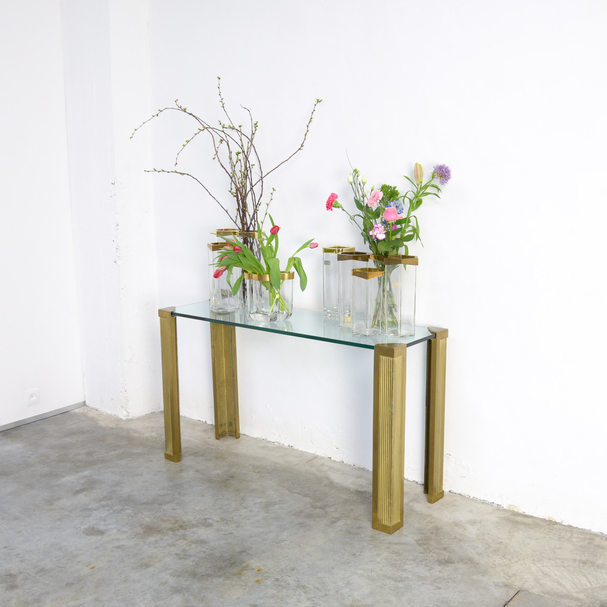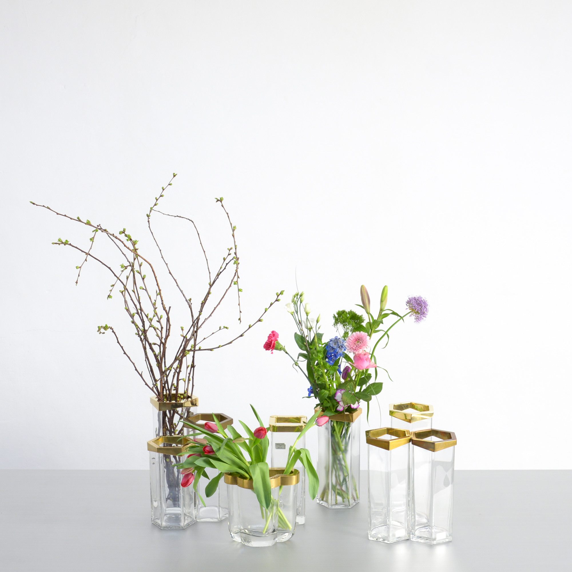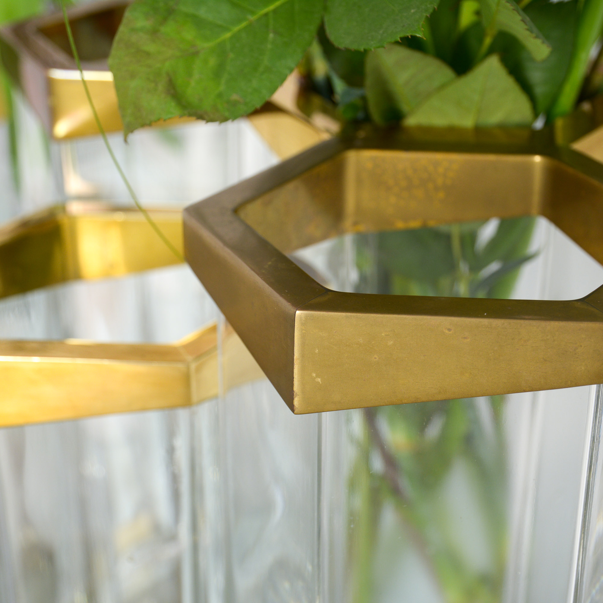 These luxury vases are made of crystal glass and brass. They have different shapes and dimensions.