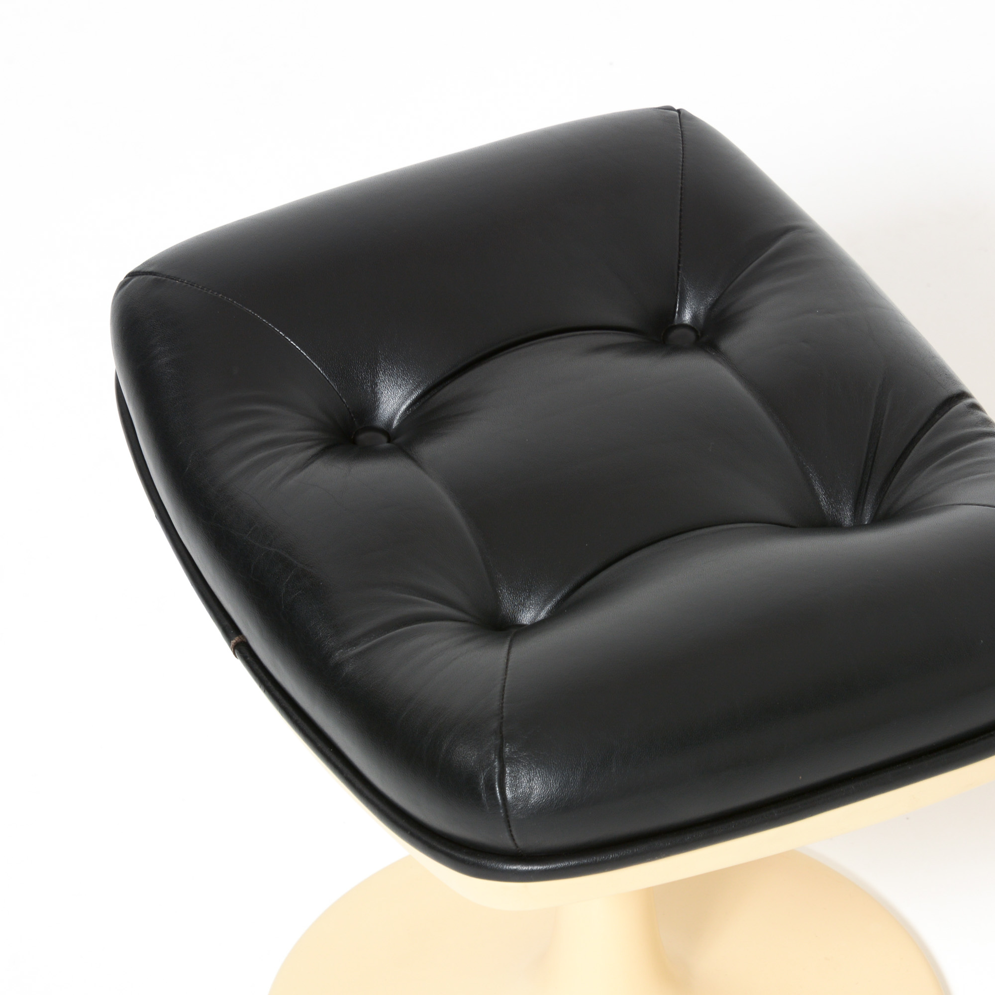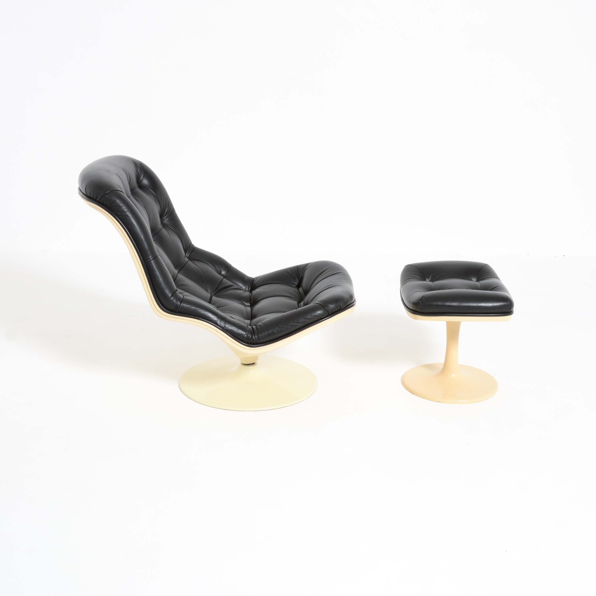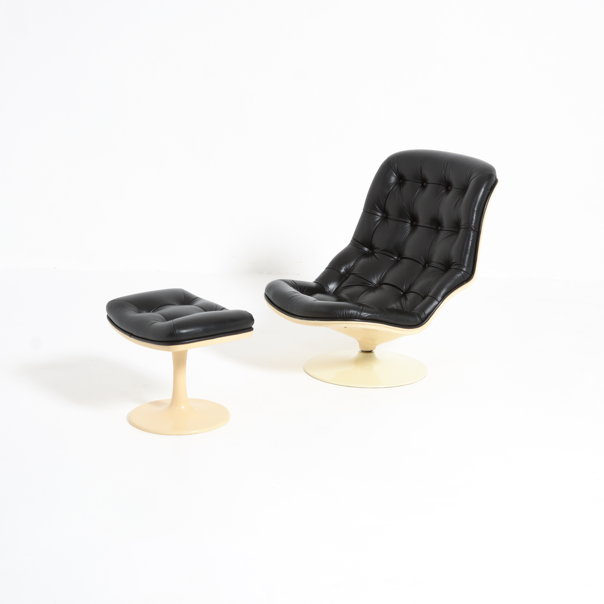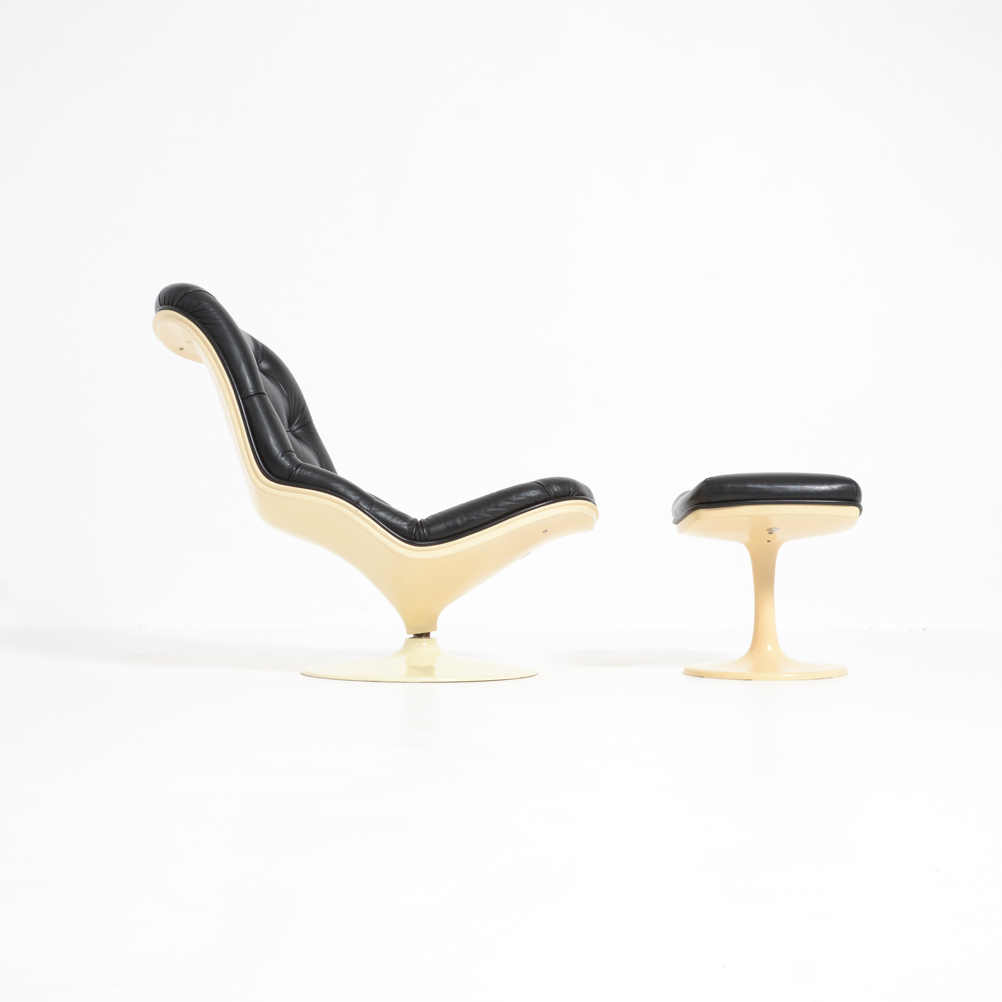 The Shelby lounge chair was designed by Georges Ch. Van Rijk for Beaufort. We offer you a lounge chair with ottoman, made of crème polyester and black leather.