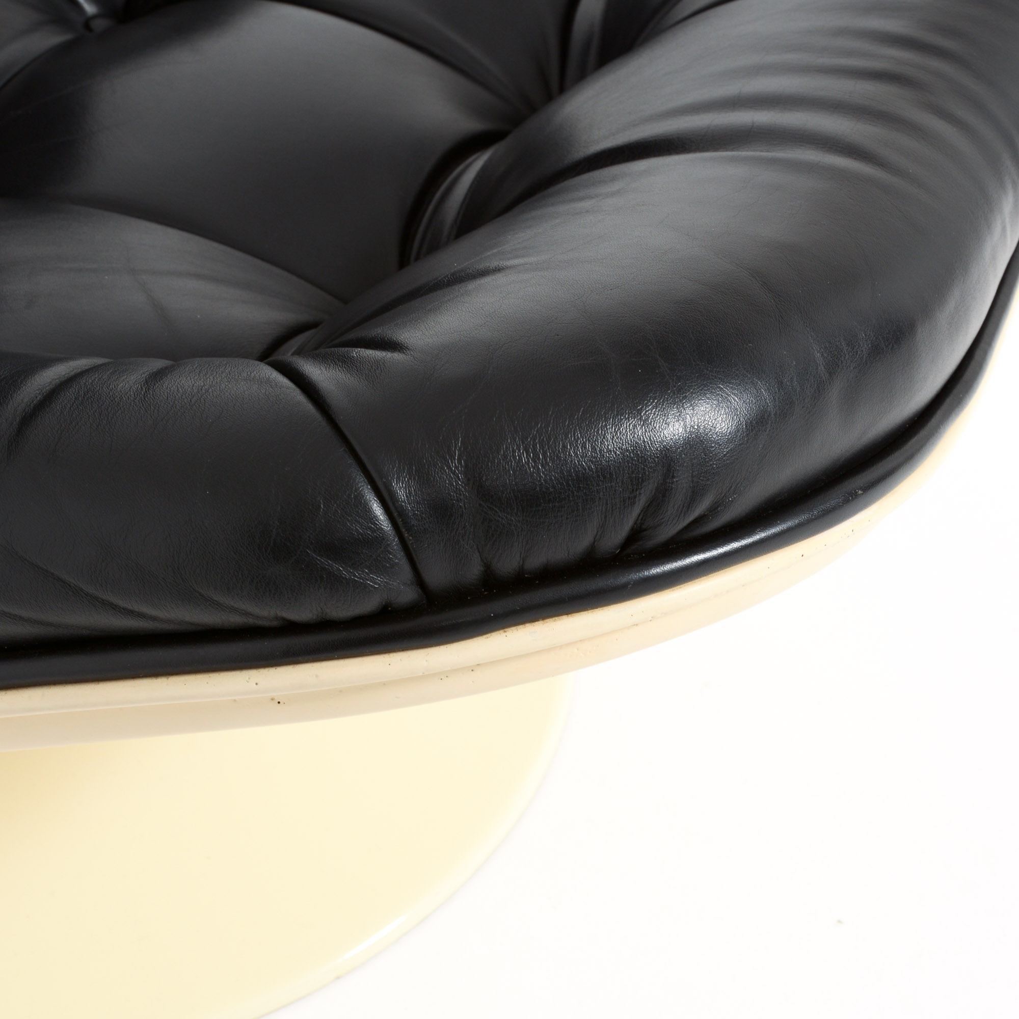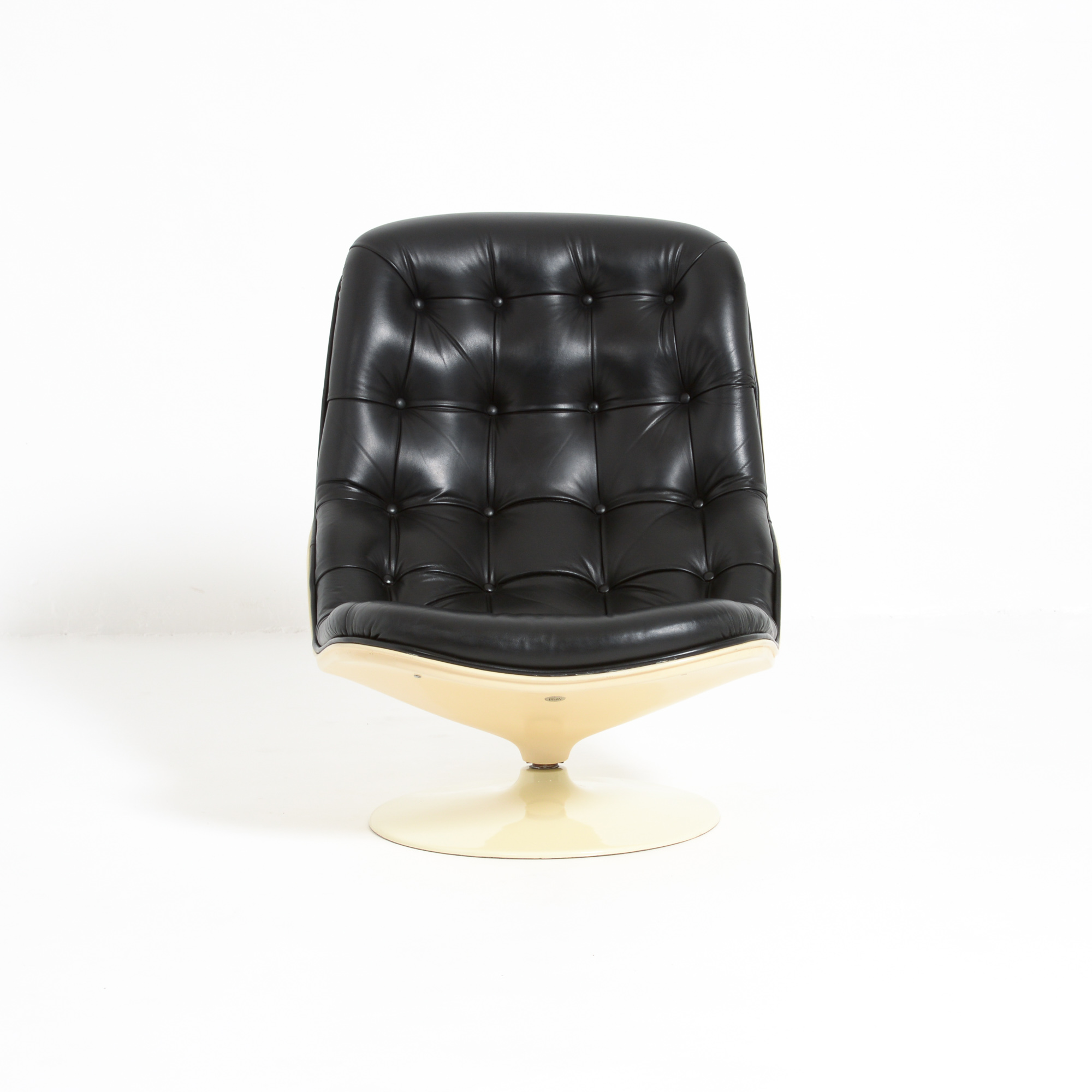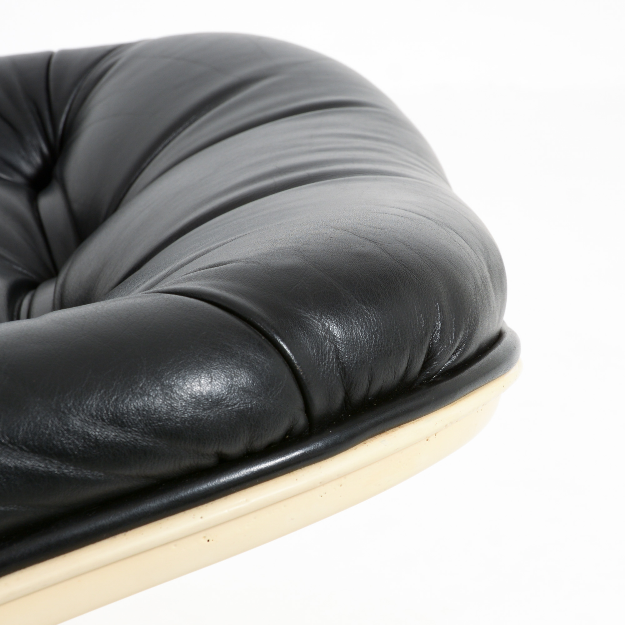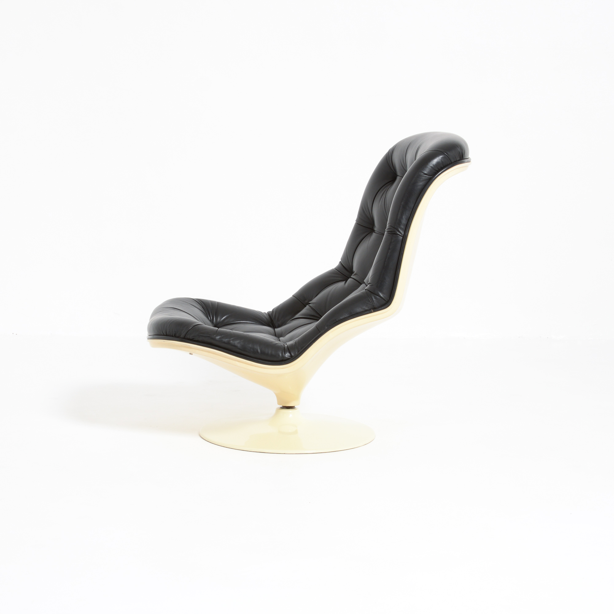 The Shelby lounge chair was designed by Georges Ch. Van Rijk for Beaufort. We offer you a lounge chair with ottoman, made of crème polyester and black leather.