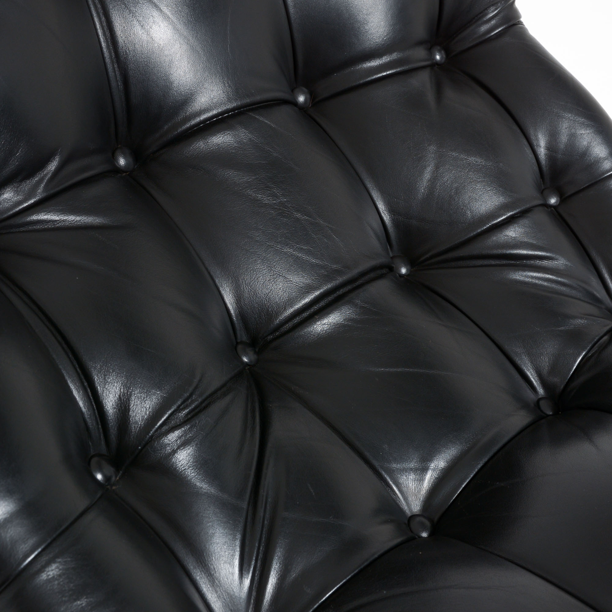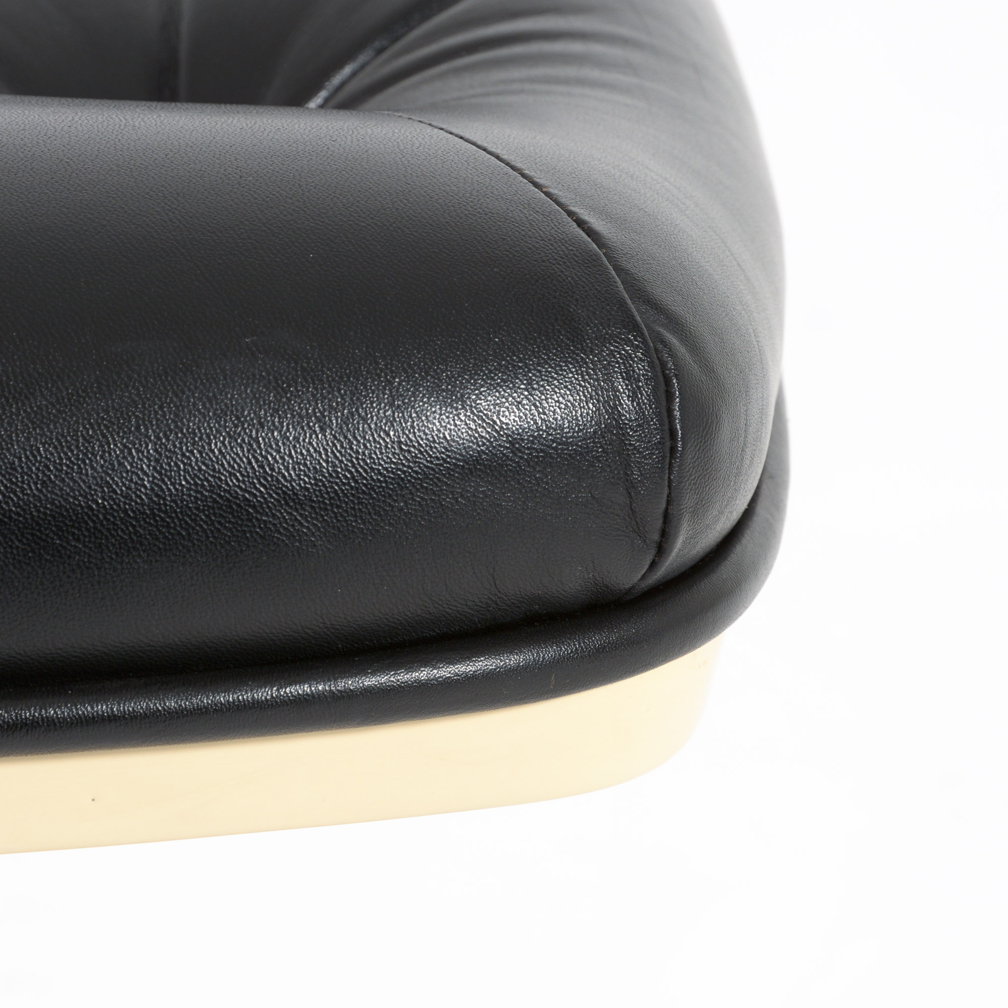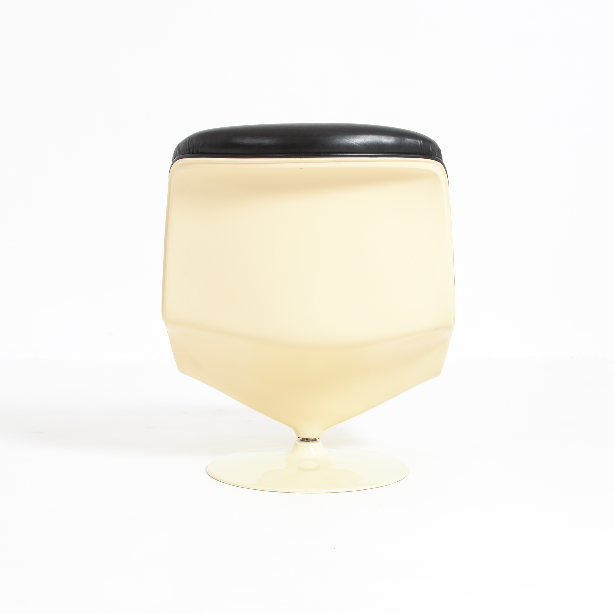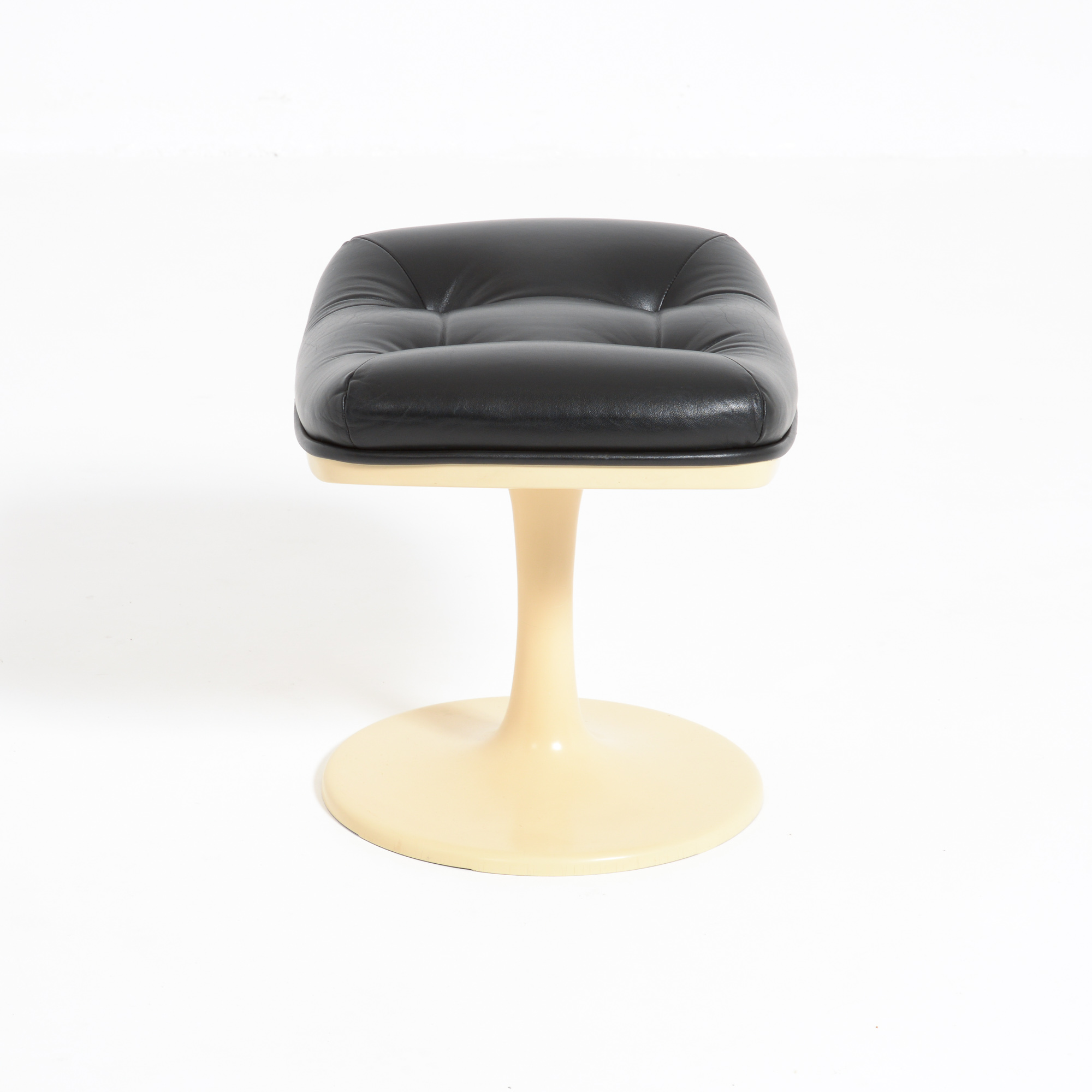 The Shelby lounge chair was designed by Georges Ch. Van Rijk for Beaufort. We offer you a lounge chair with ottoman, made of crème polyester and black leather.