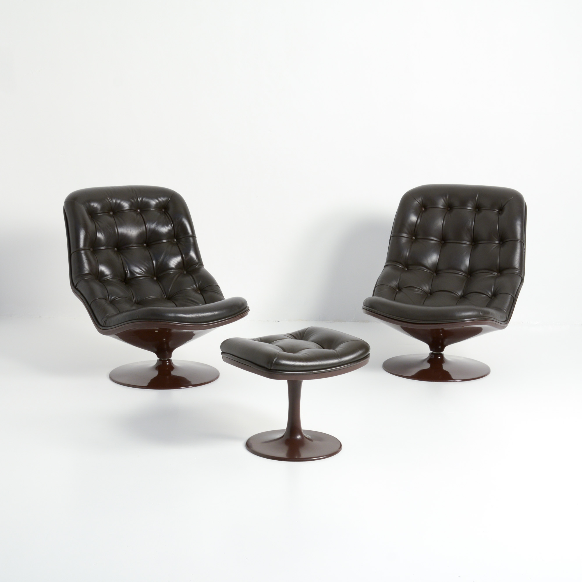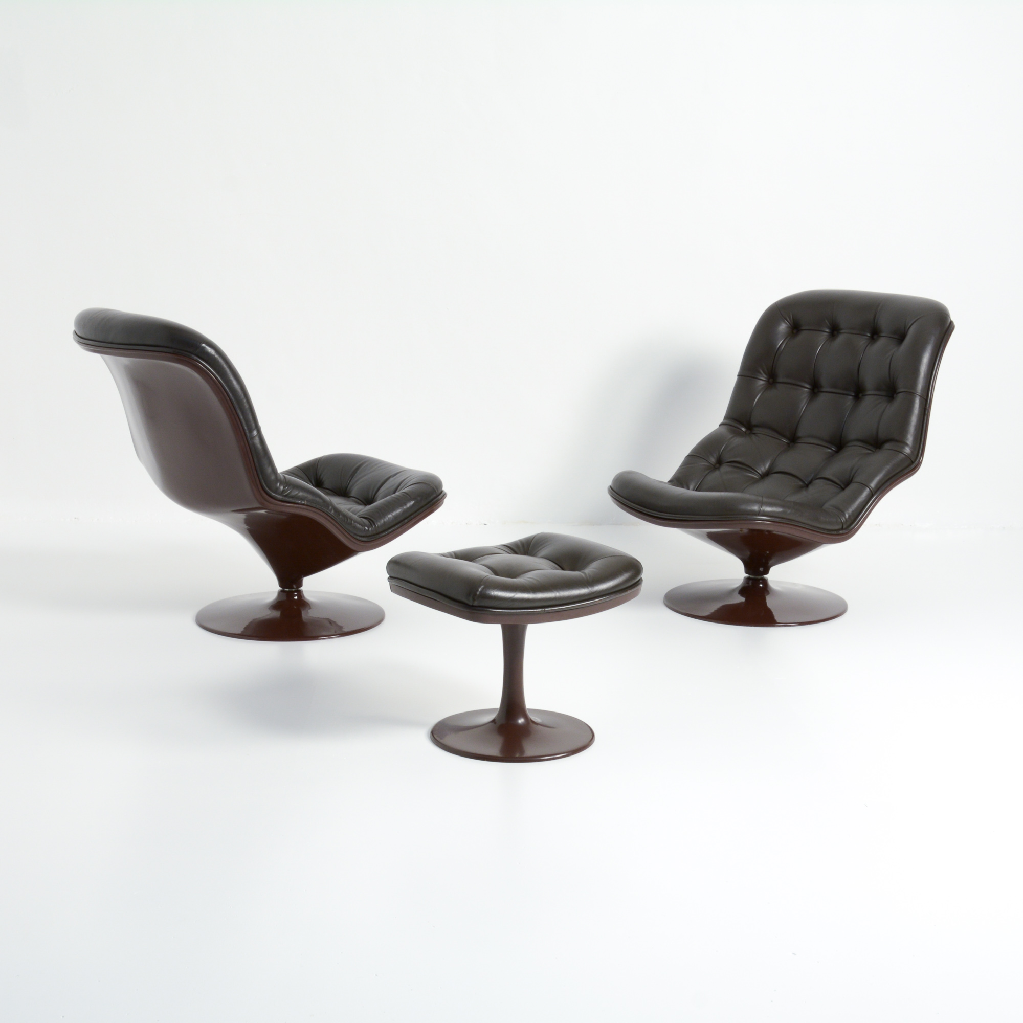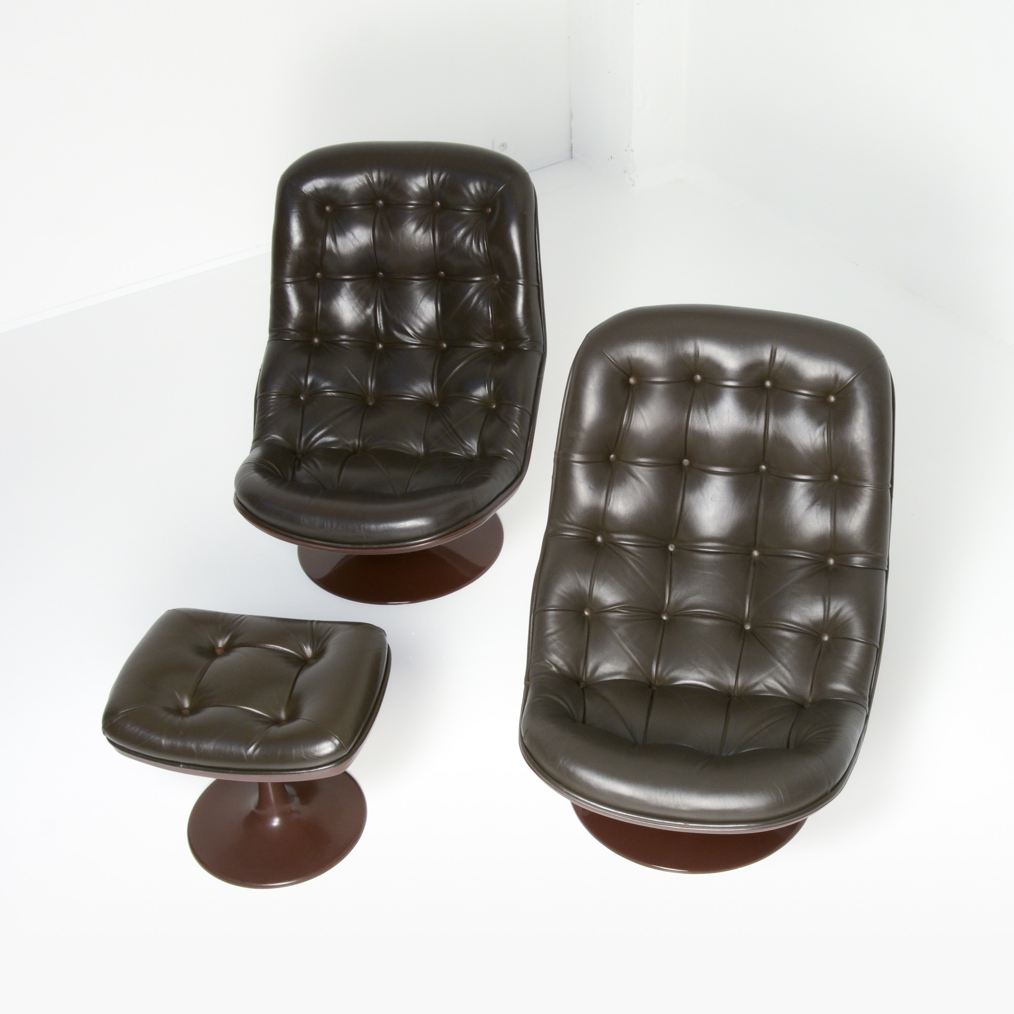Both chairs and ottoman are in a very good authentic condition. They are marked and dated 1971.