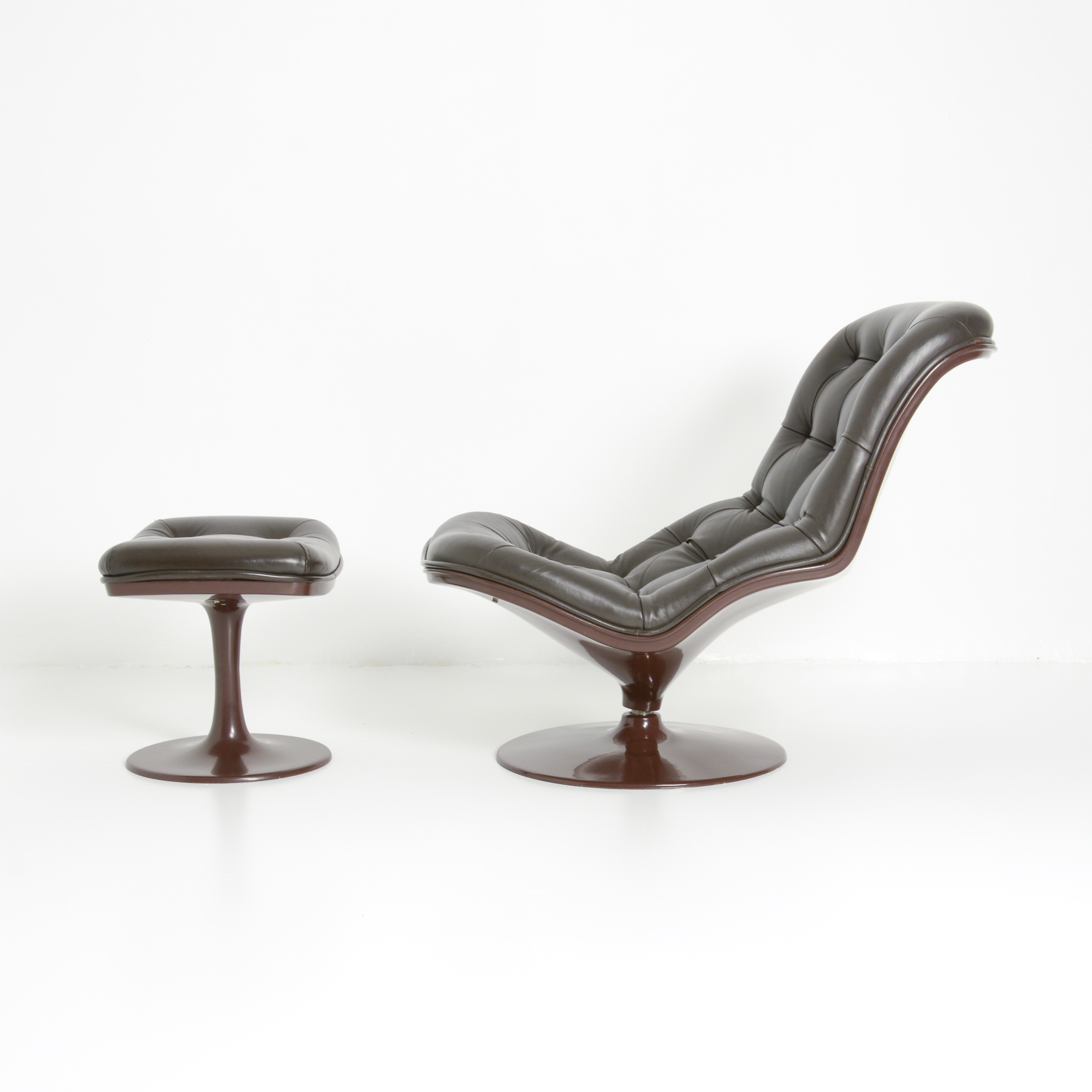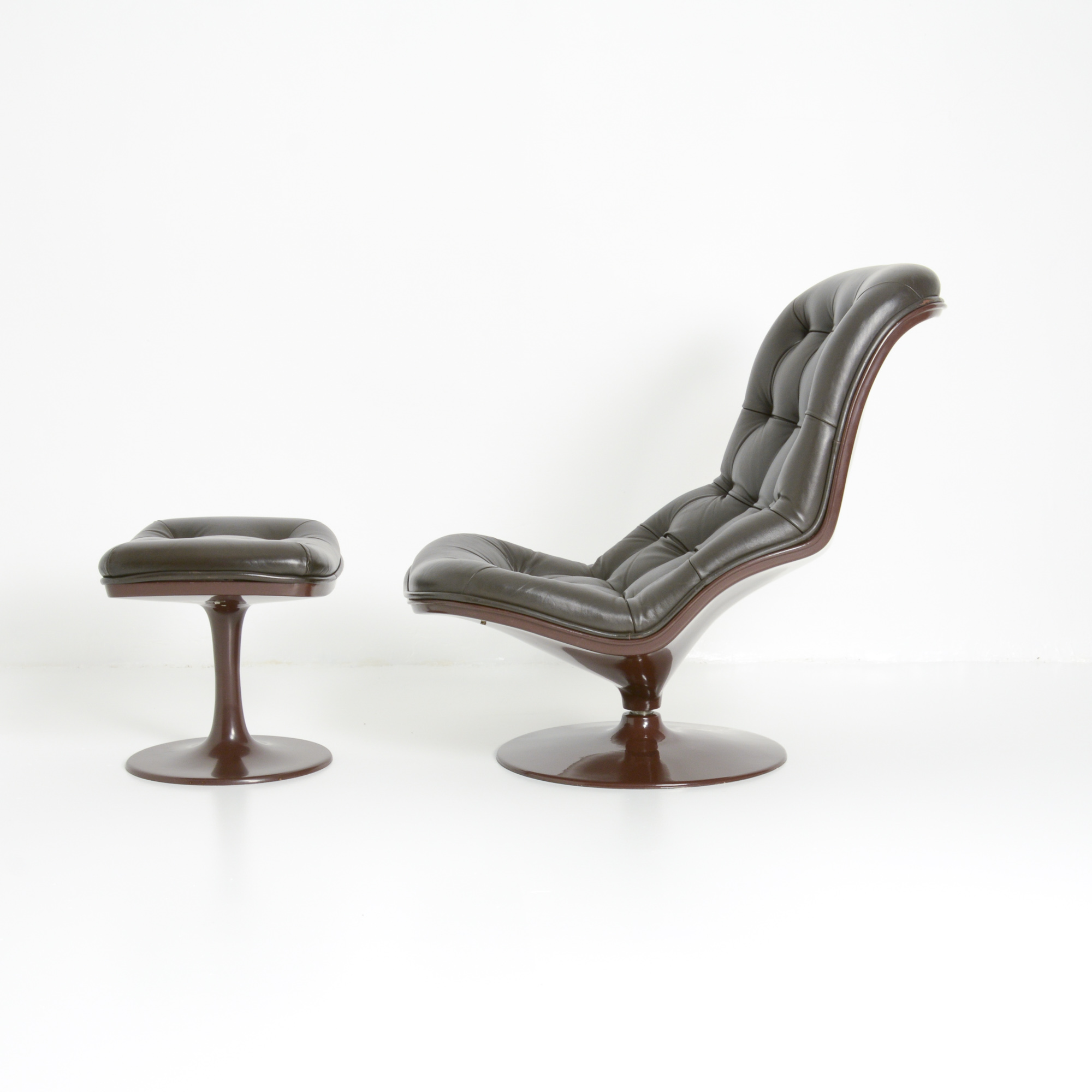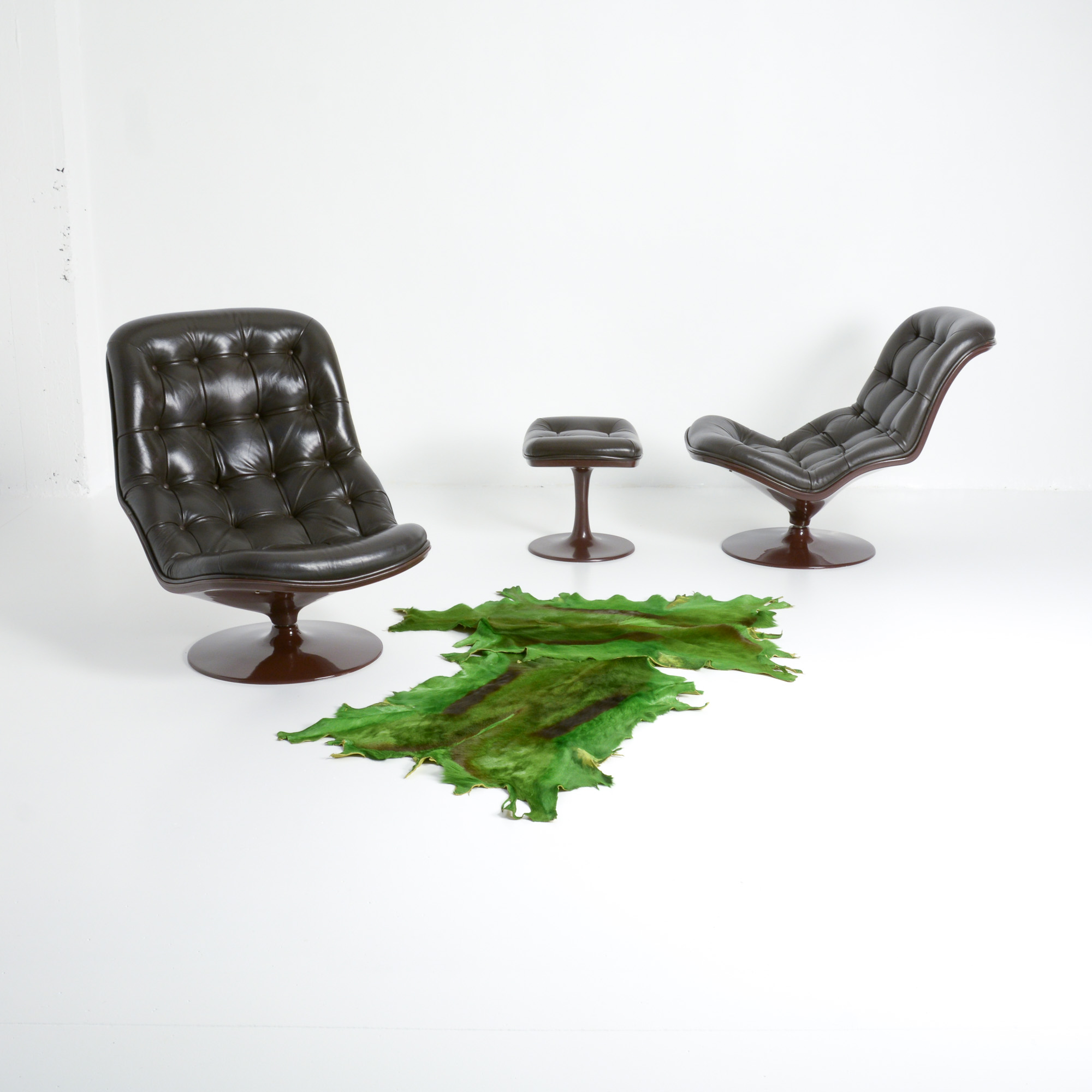 Both chairs and ottoman are in a very good authentic condition. They are marked and dated 1971.