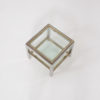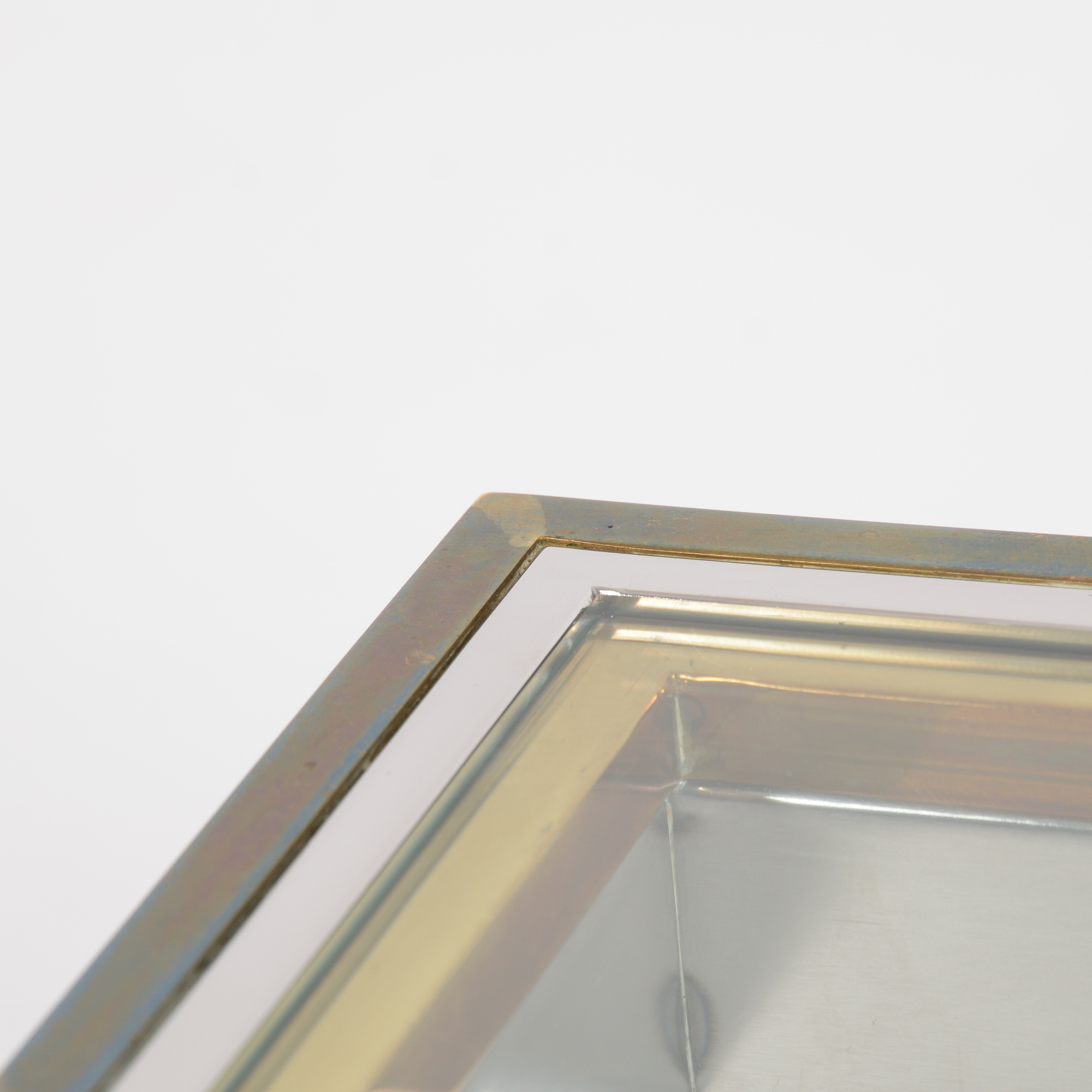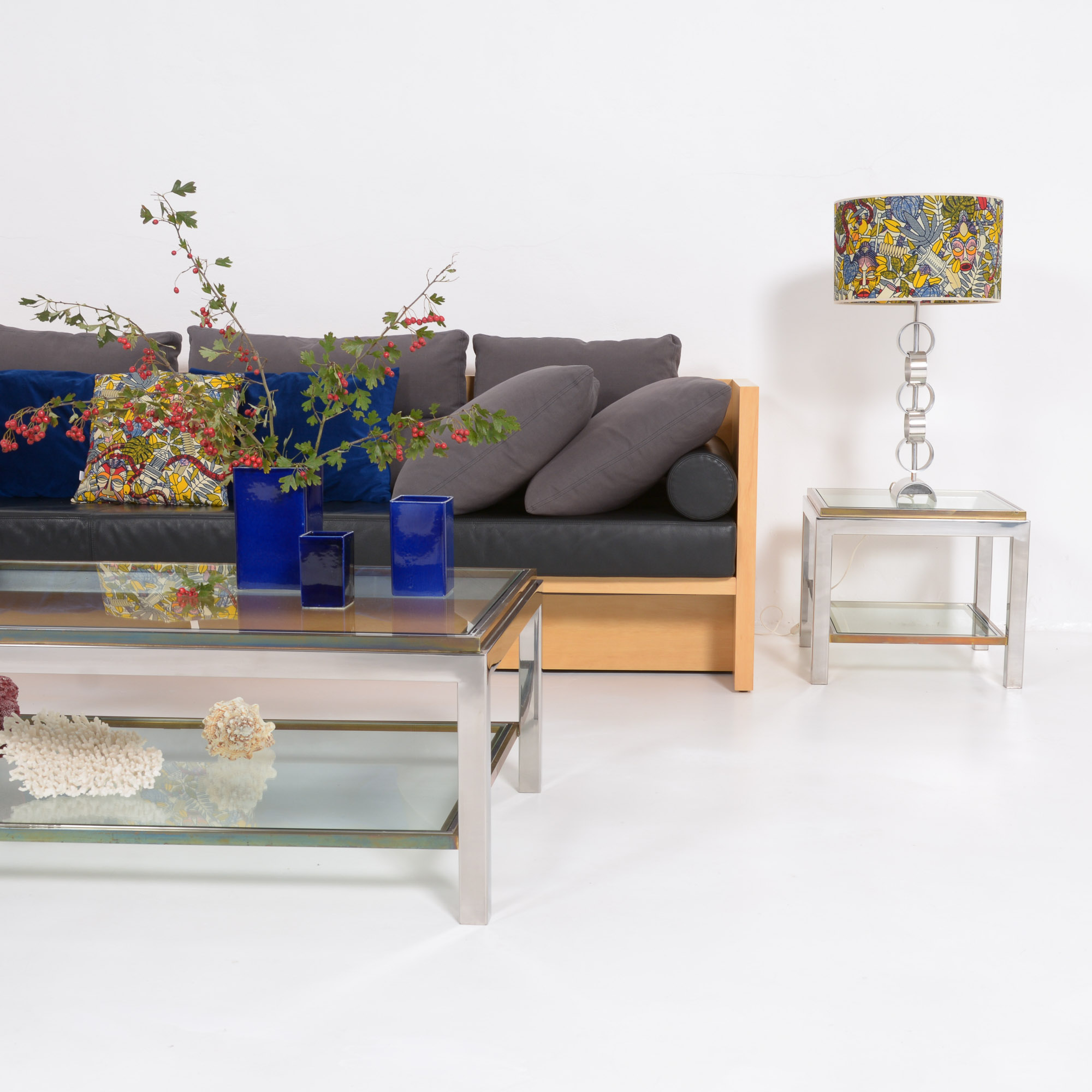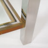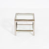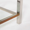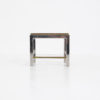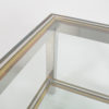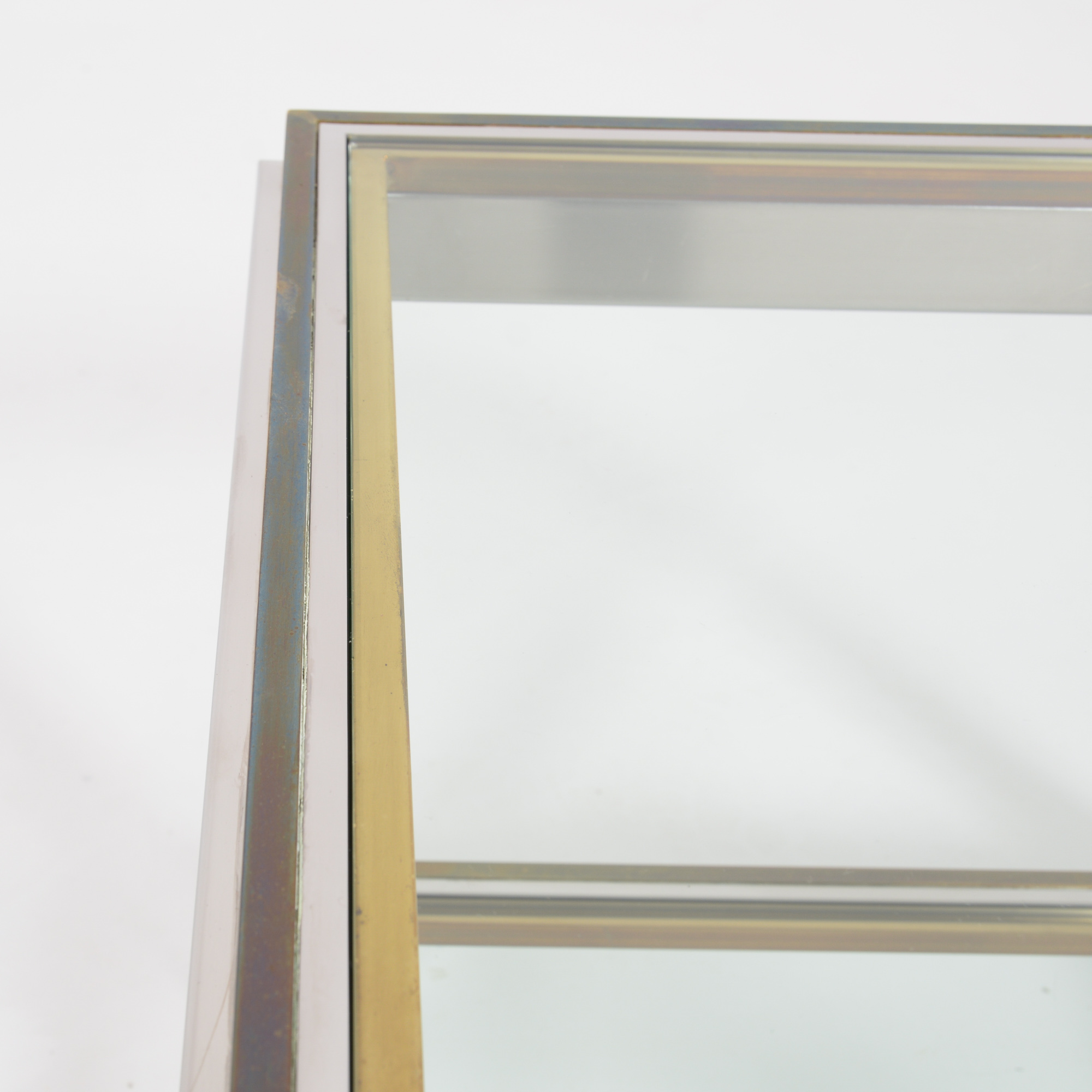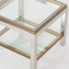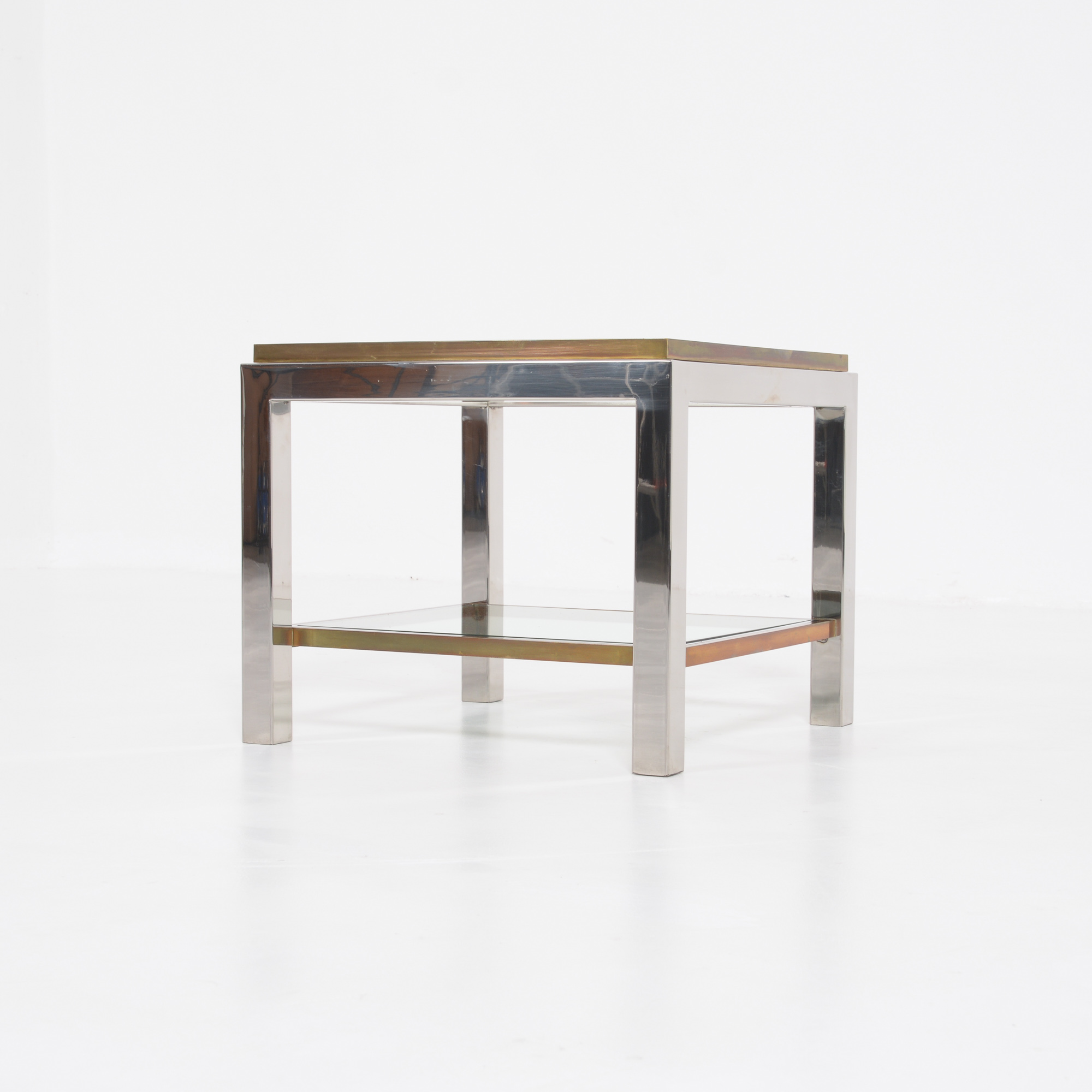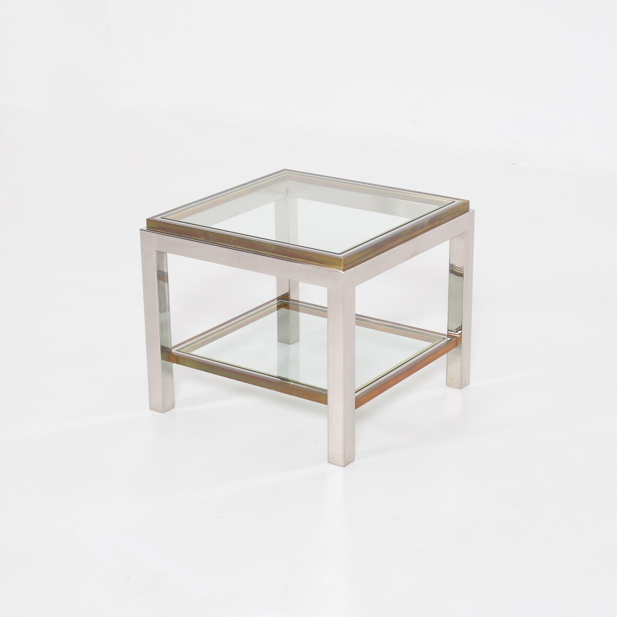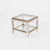 This two tier square side table is made of chromed metal, finished with copper details and two clear cristal glass tops.