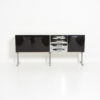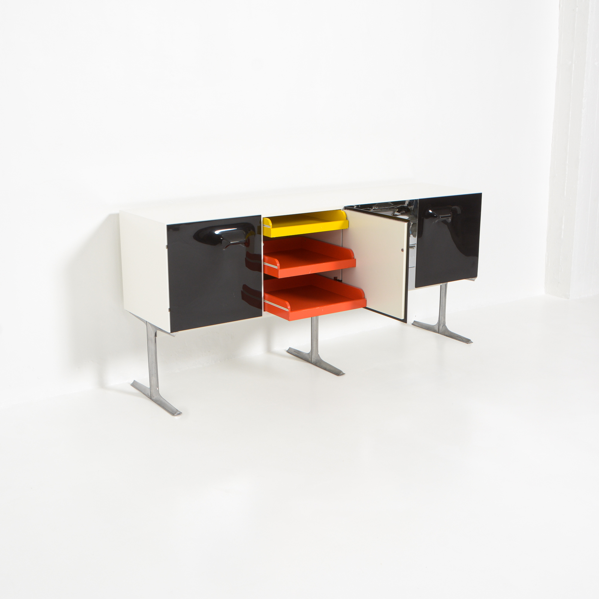 This exclusive and rare sideboard was designed by Raymond Loewy for Doubinsky Frères 2000 in France in the 1960s. This sideboard features 3 ABS plastic dark brown doors and 4 chromed ABS plastic drawers. The inside is very colorful with yellow and orange drawers and well organized with 2 bottle holders, 4 hidden drawers and 1 layer.