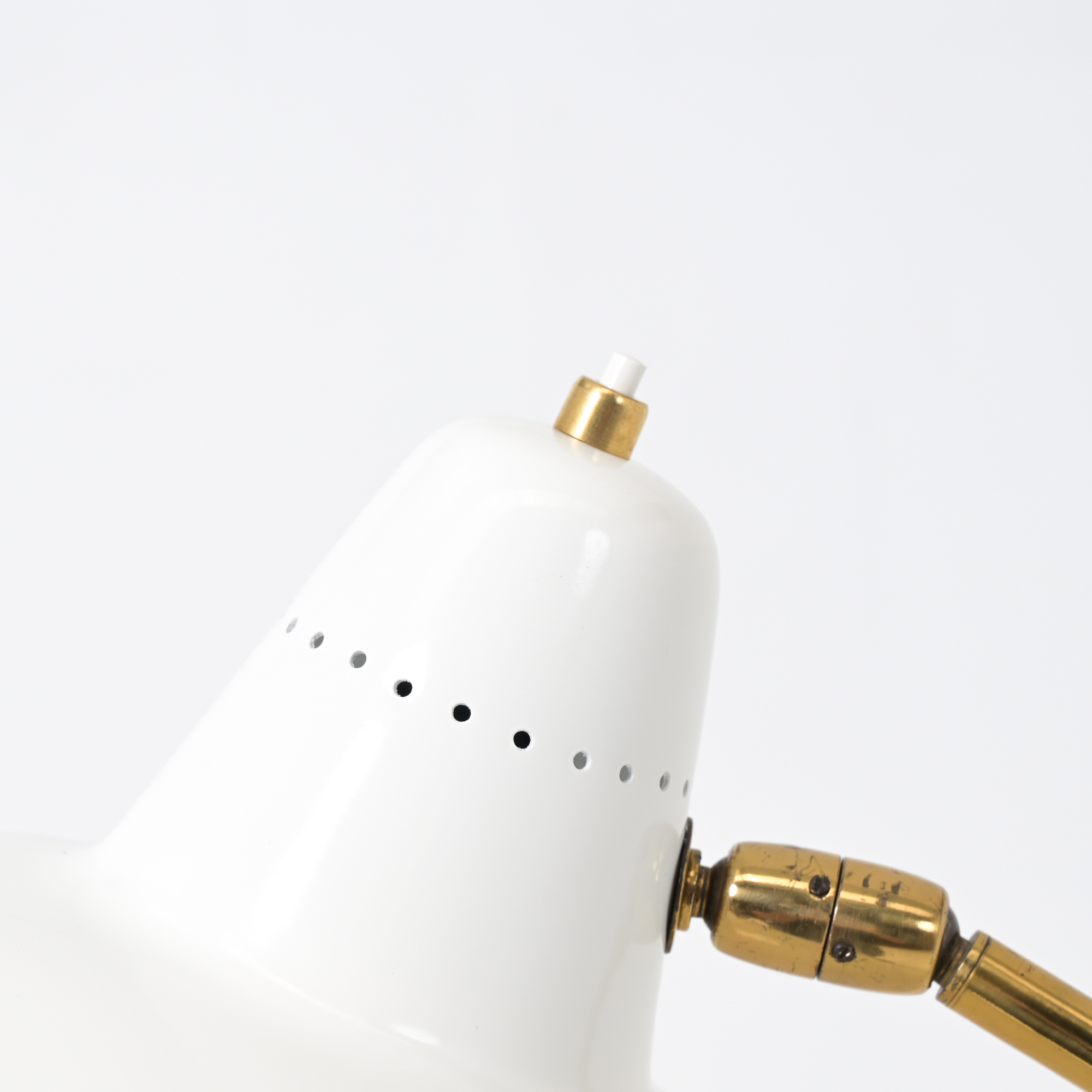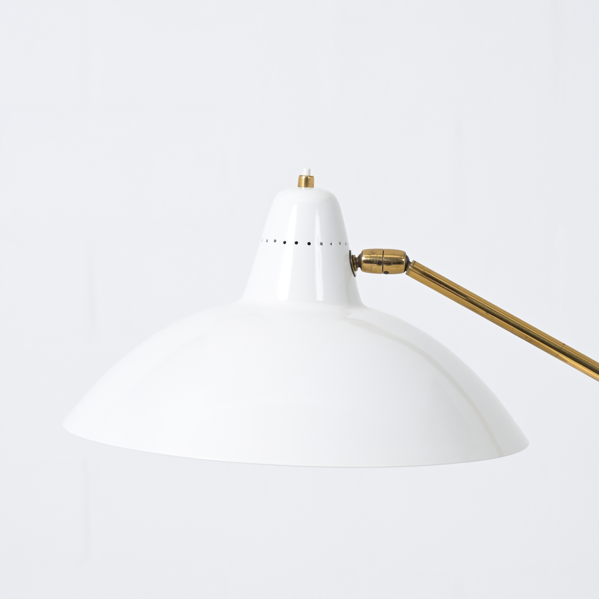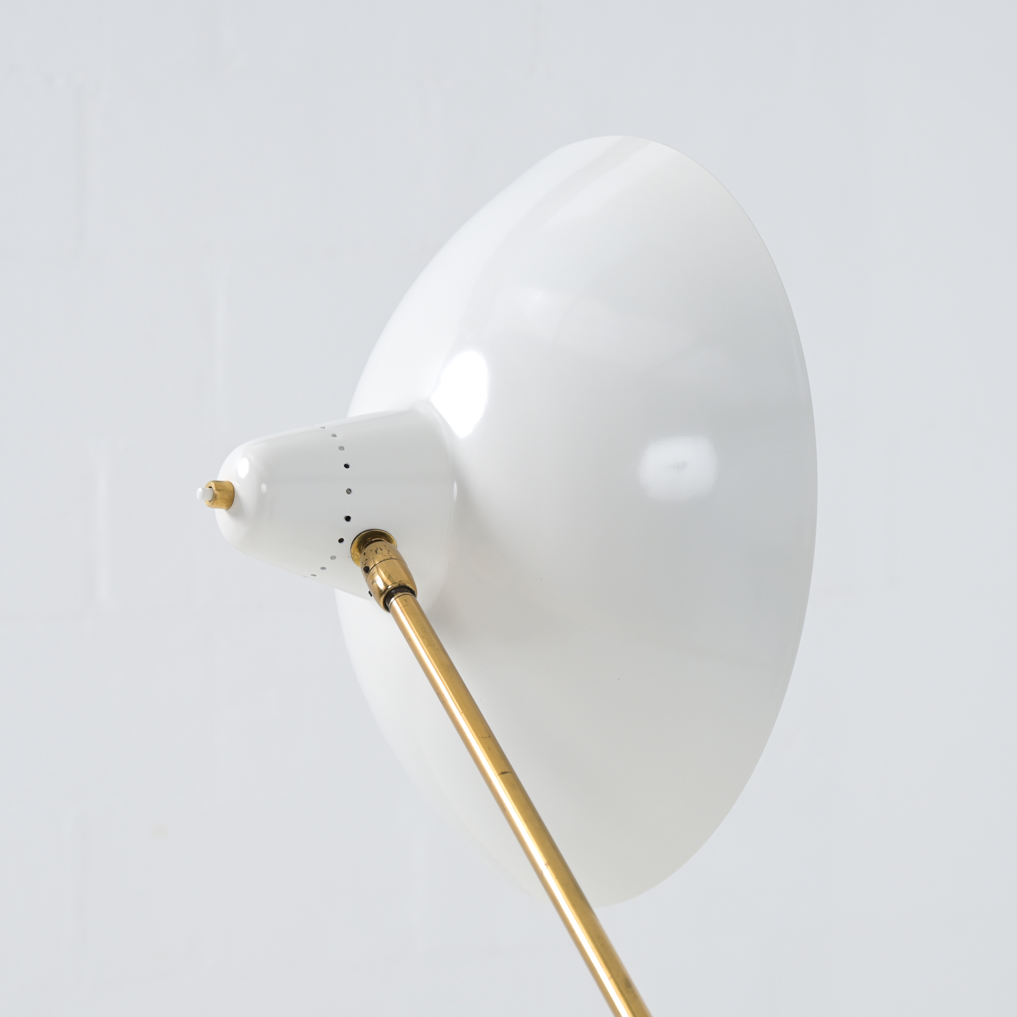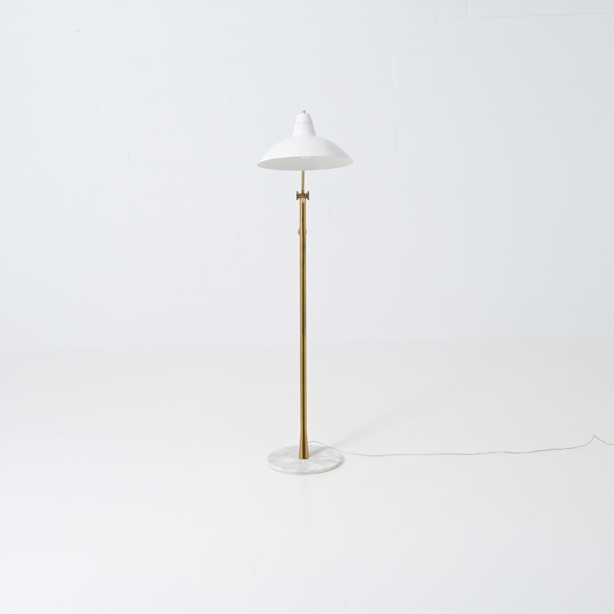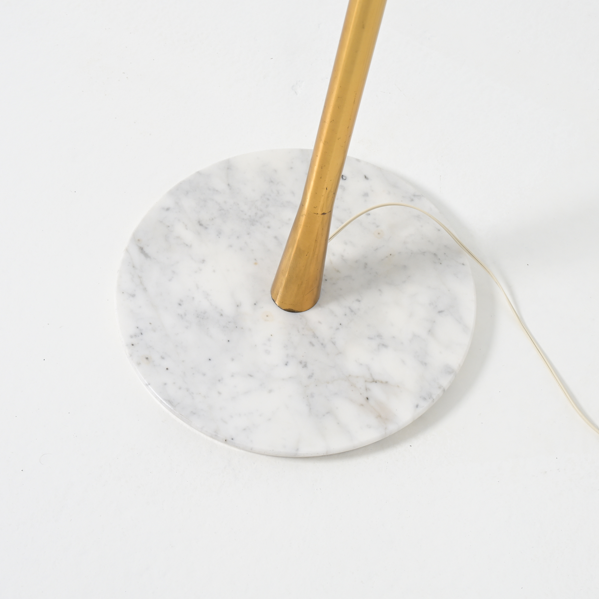 The floor lamp has a round white marble base and a brass arm with counterweight for the balance. The shade is broken white painted. This lamp can be used as a reading lamp and looks amazing. Completely original condition and fully functional. The brass has a nice patina.