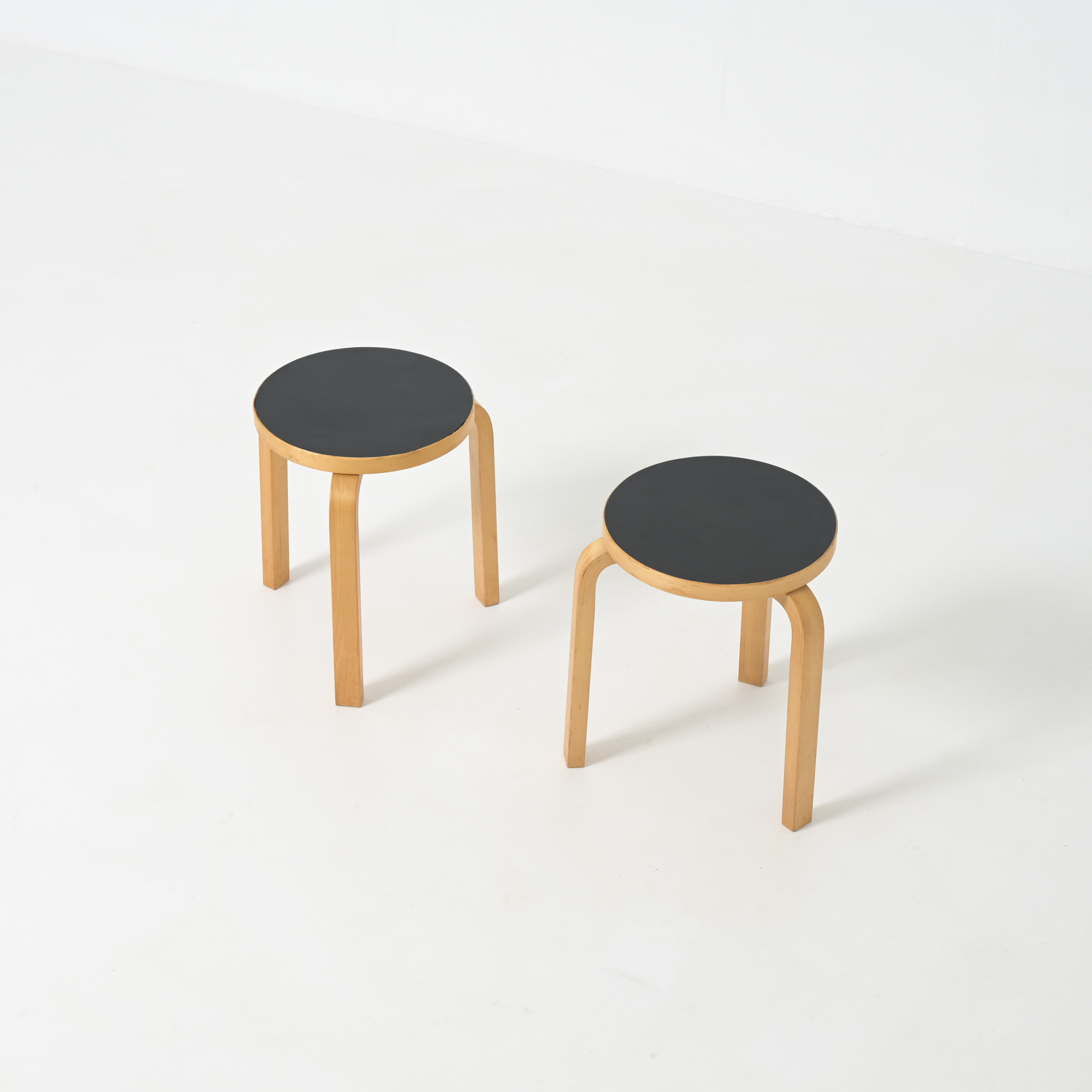 Alvar Aalto’s iconic Stool 60 is the most elemental of furniture pieces, equally suitable as a seat, a table, storage unit or display surface. We offer 2 stools made of solid birch with a black linoleum seating finish by Artek in the 1960s, of which Aalto himself was a founder in 1935.