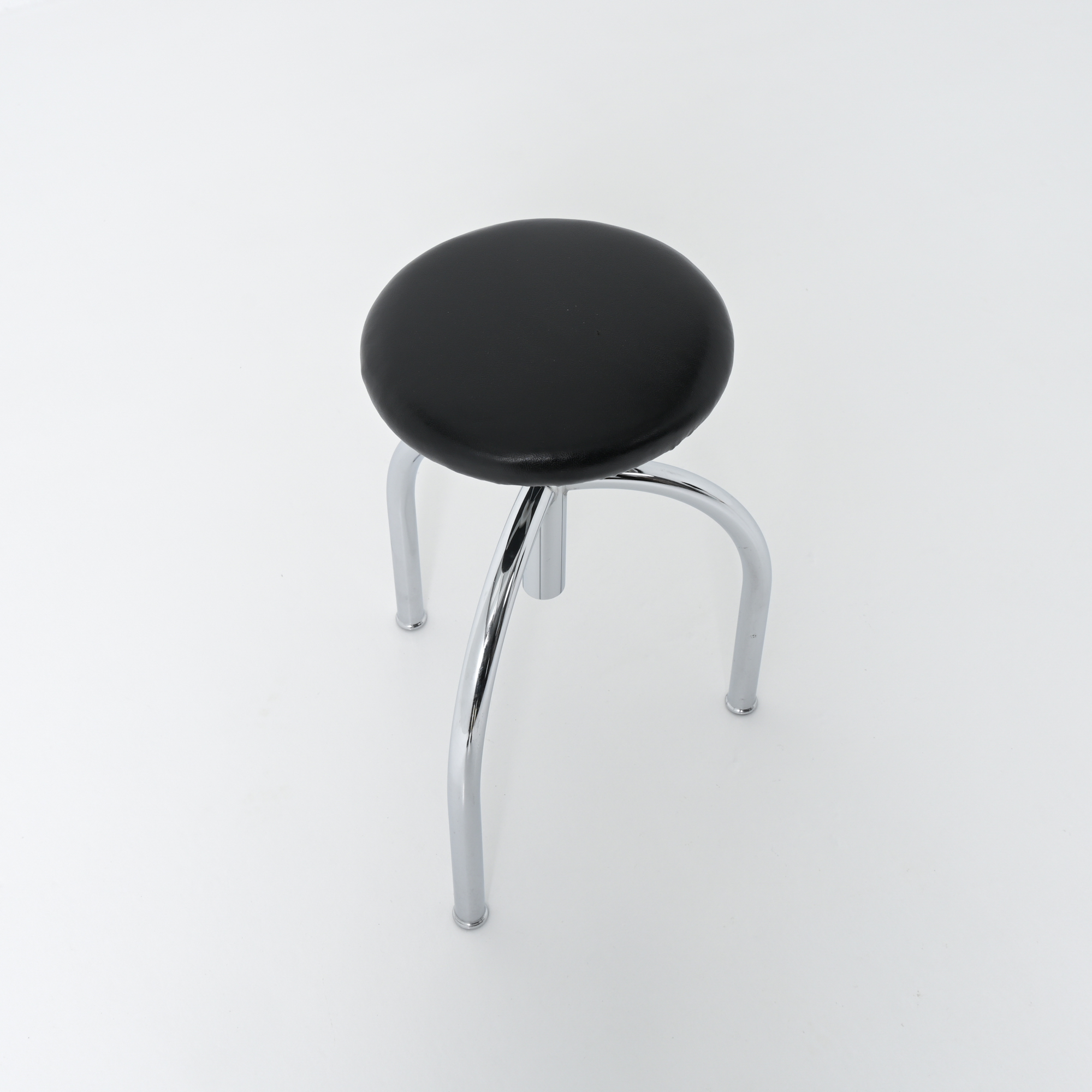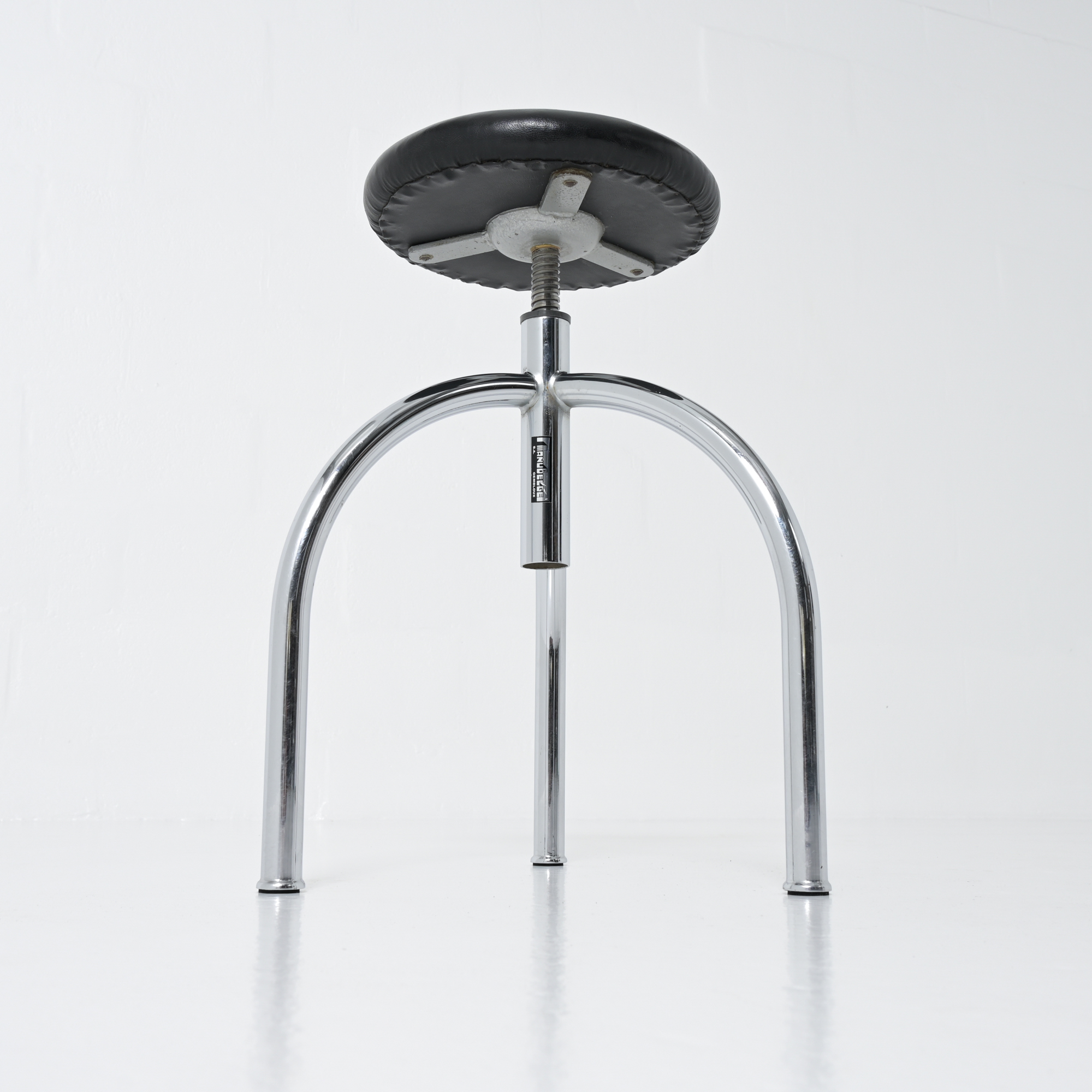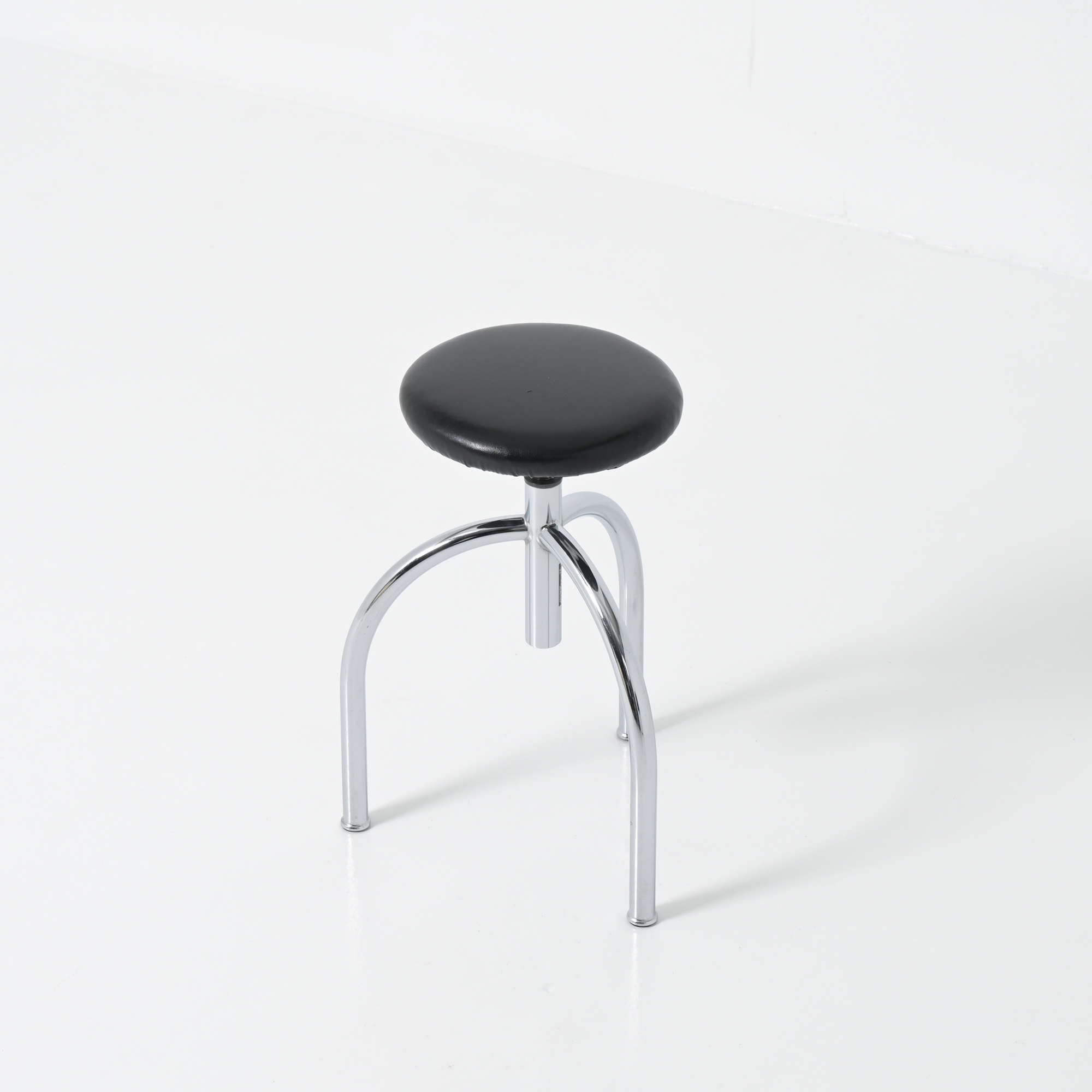 This stool has a remarkable chromed steel base. It has a height adjustable seat with a black vinyl upholstery.