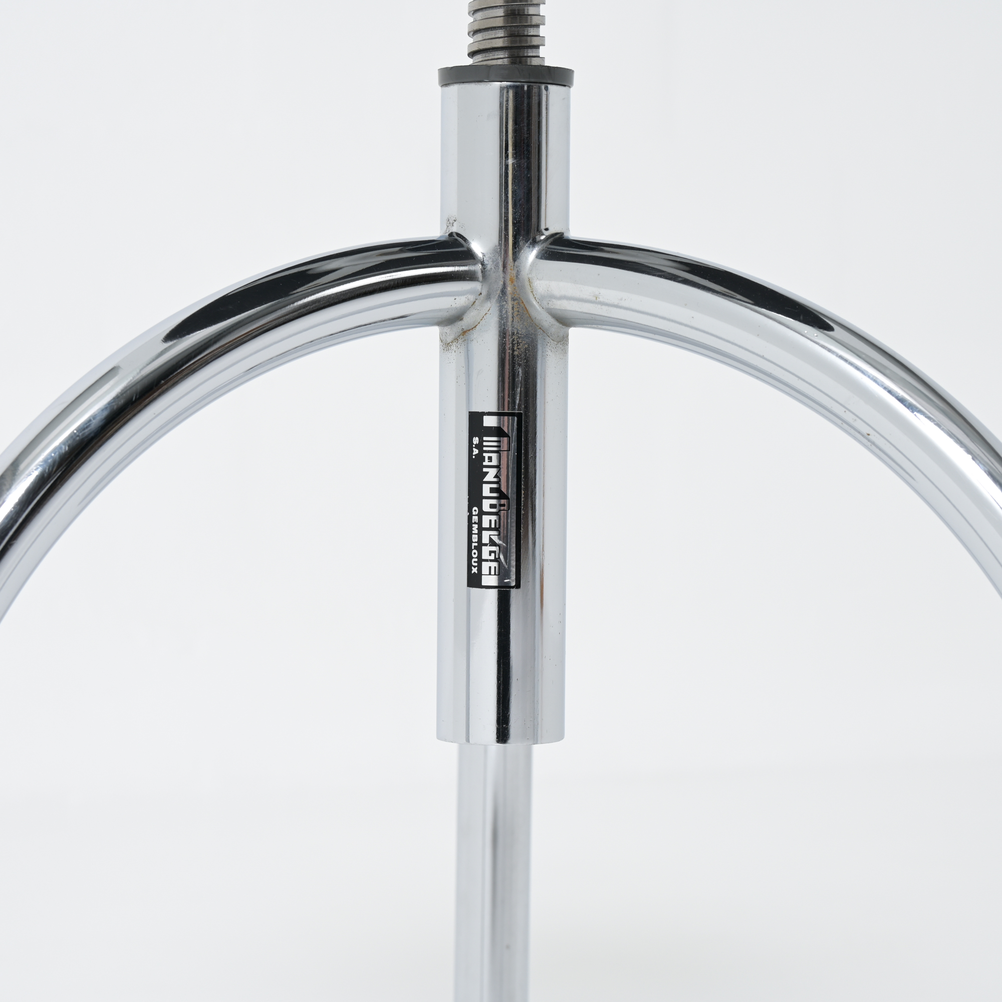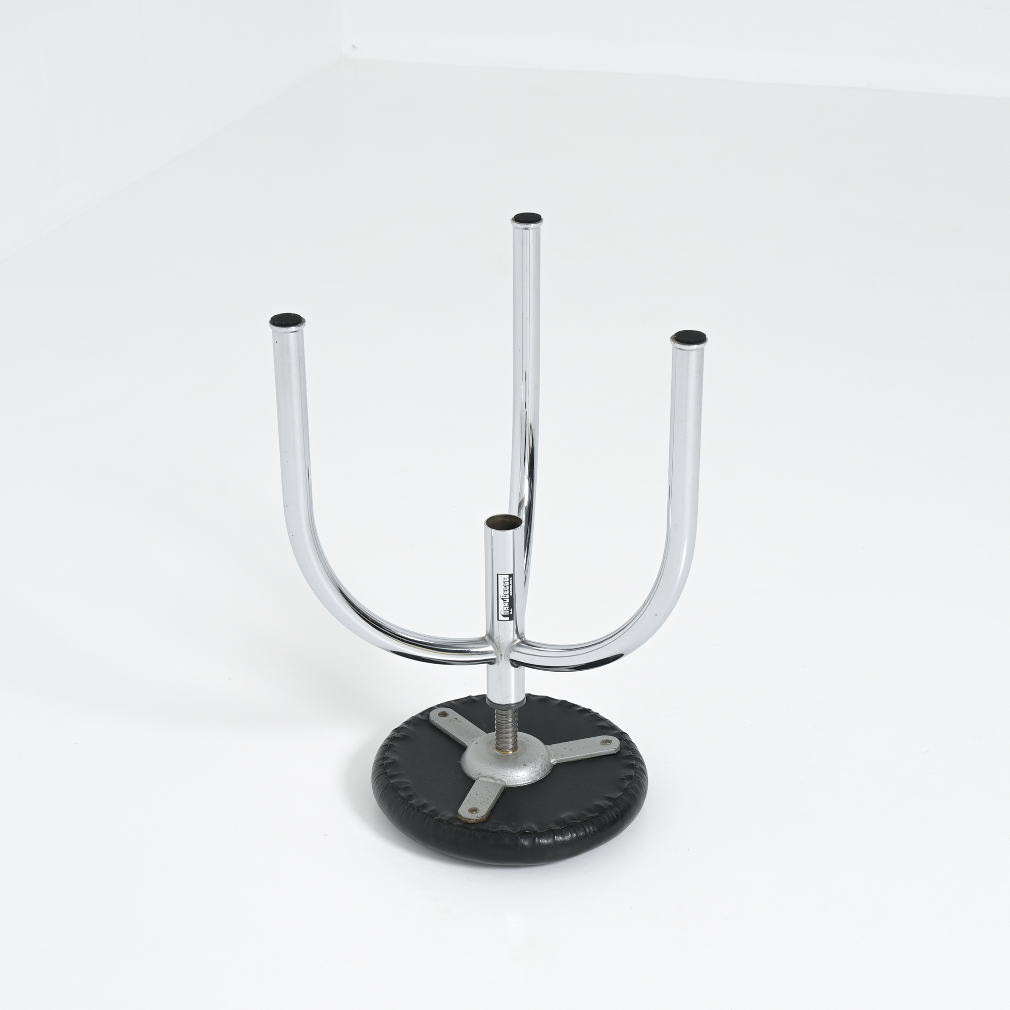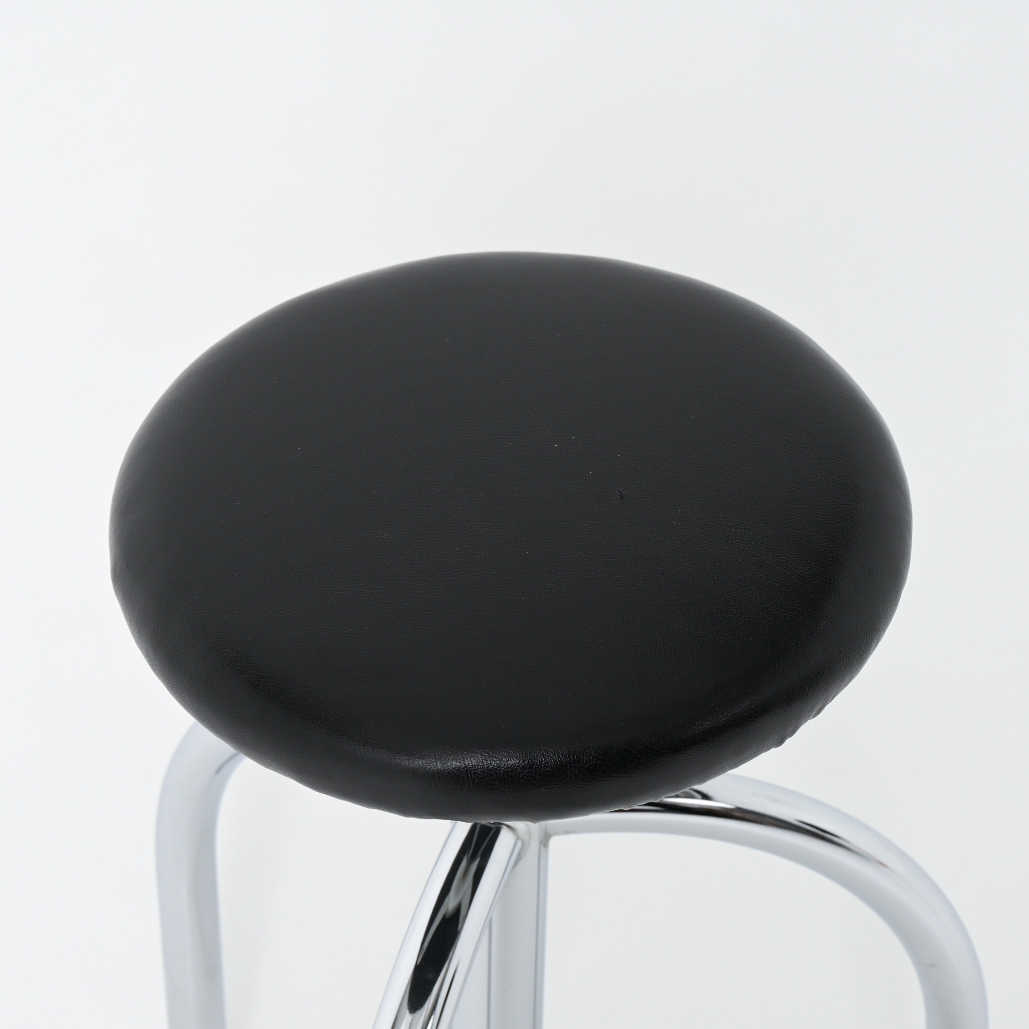 This stool has a remarkable chromed steel base. It has a height adjustable seat with a black vinyl upholstery.