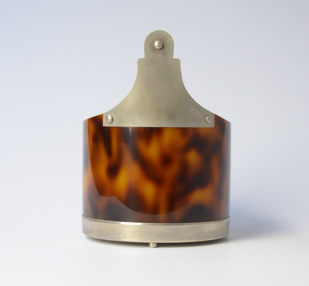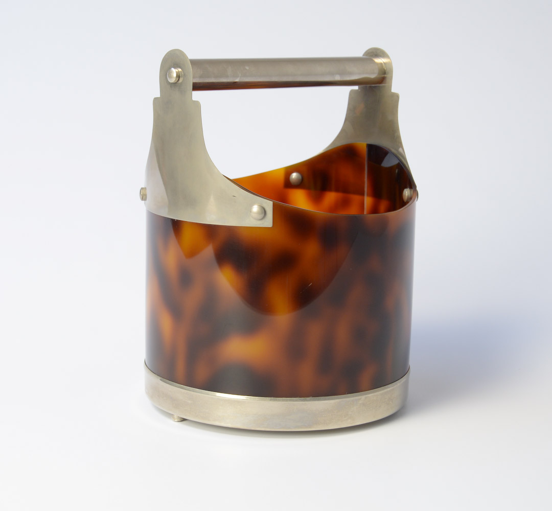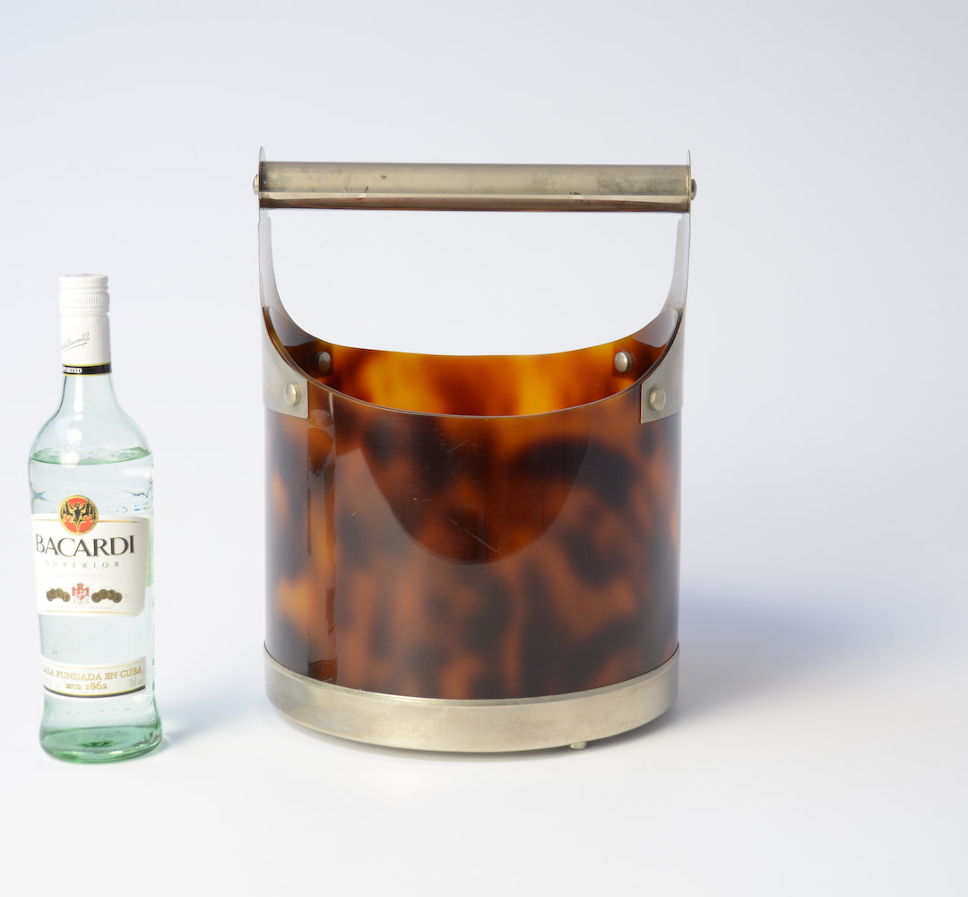 This stylish horn-look bakelite ice bucket can be dated in the 1970s.