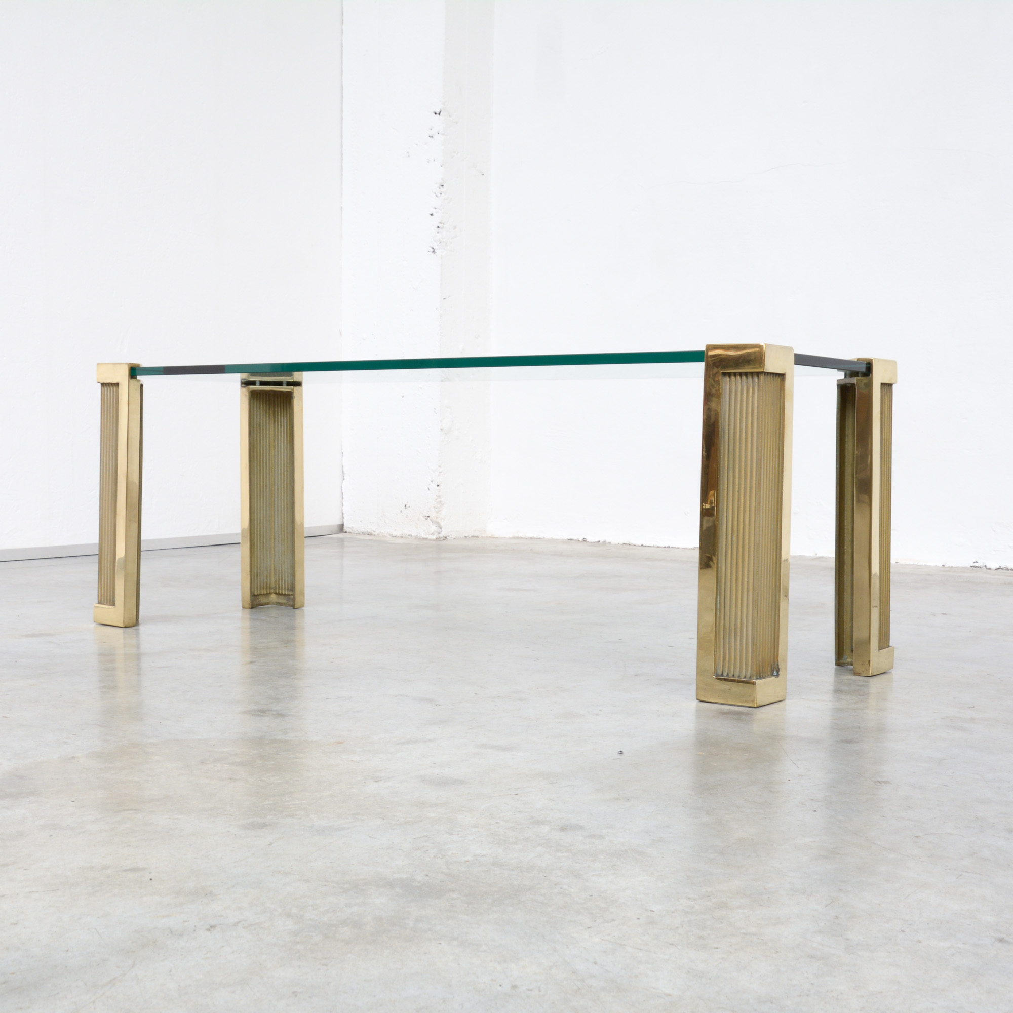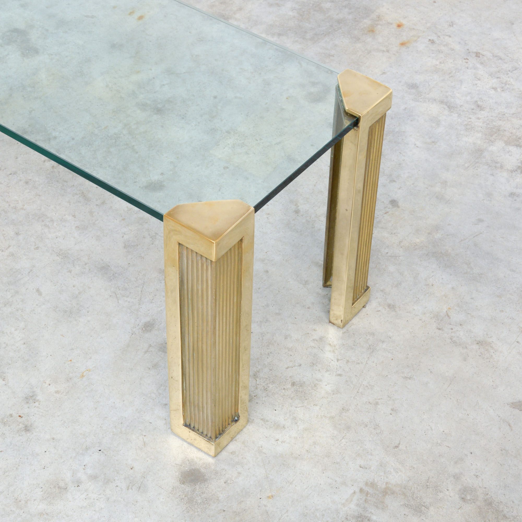 Typical for the sand-casting process, small irregularities may exist, even in the polished surface. This coffee table is in very good vintage condition, the glass top has some minor scratches due to age and use
