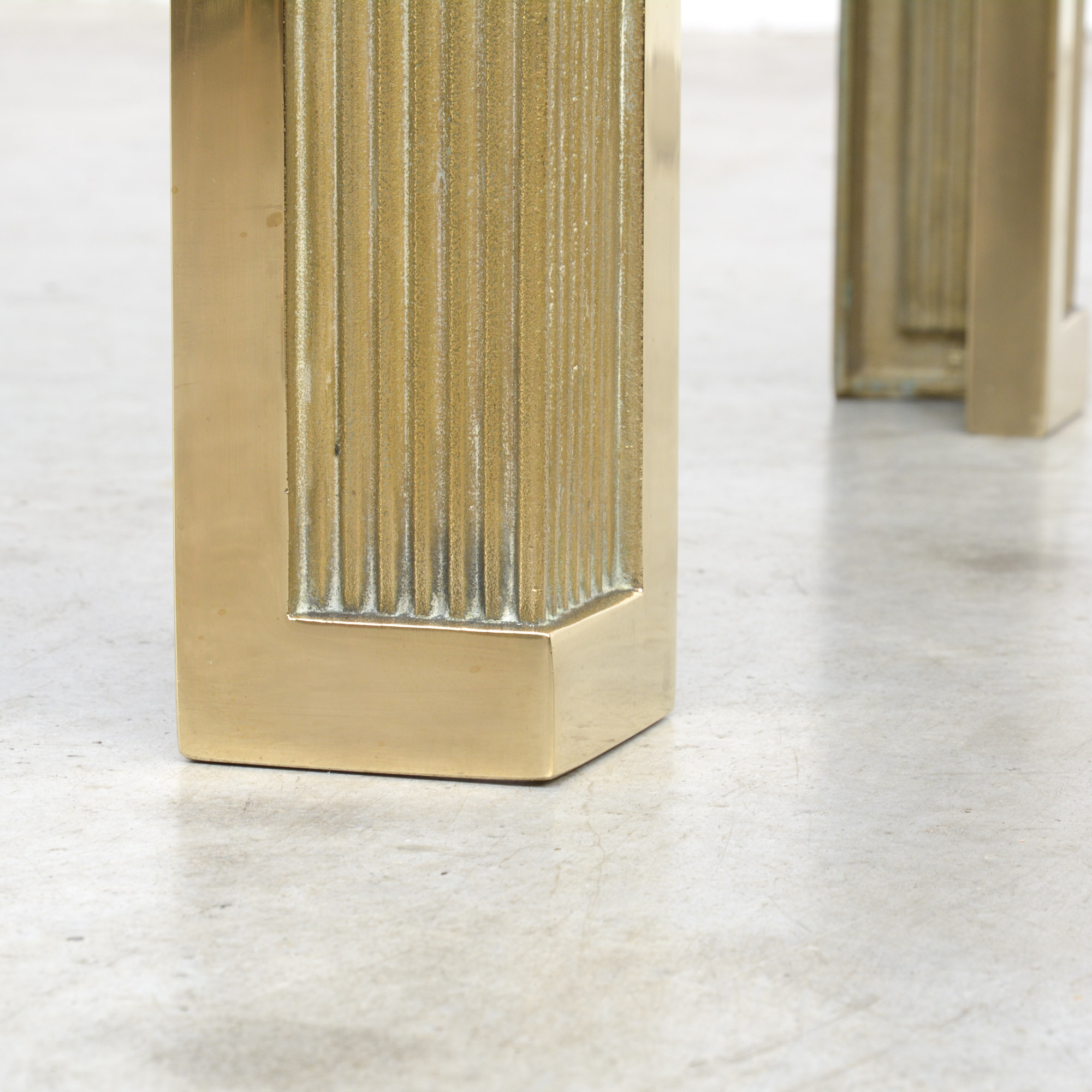 The 4 solitary massive sand cast bronze legs clamp on the thick glass top.