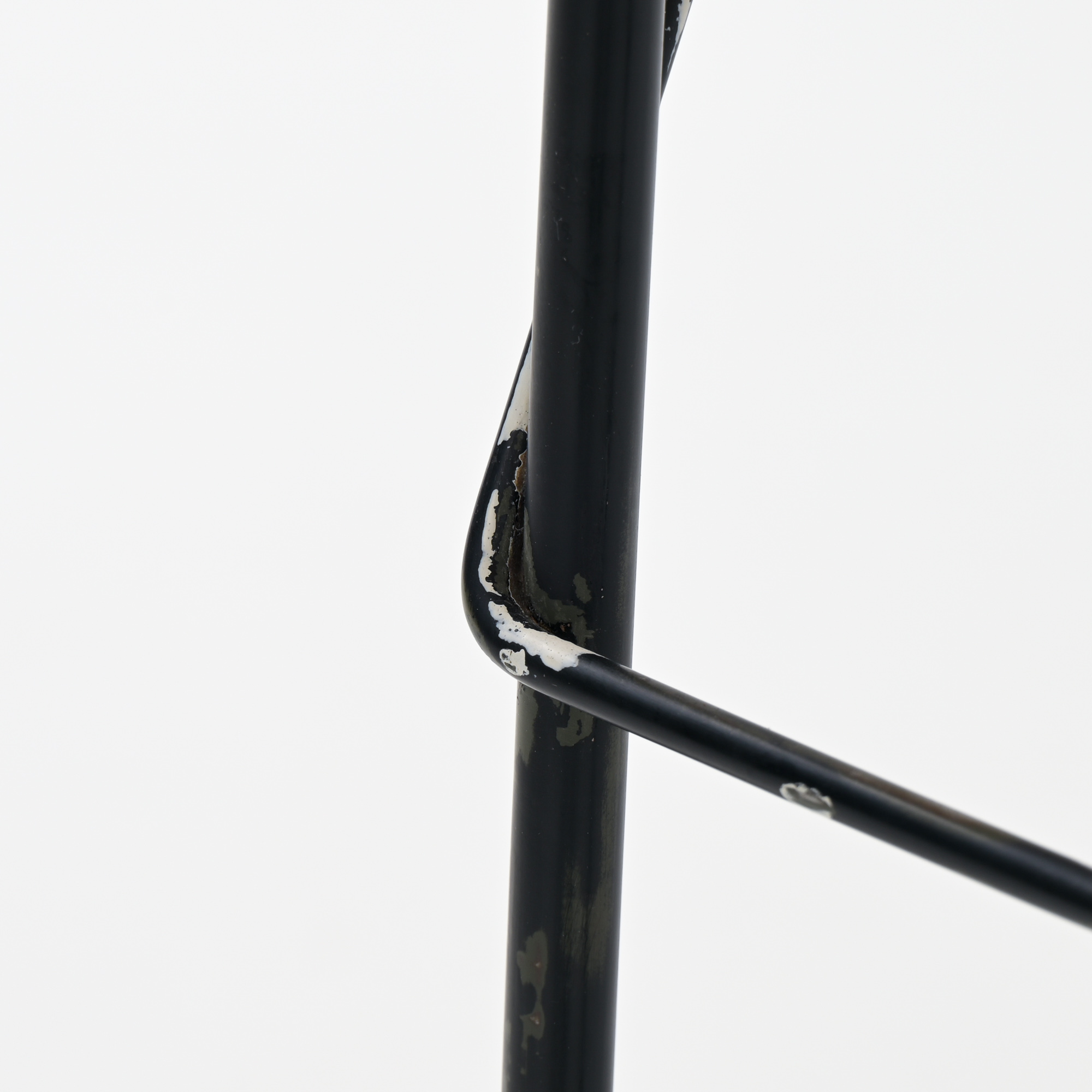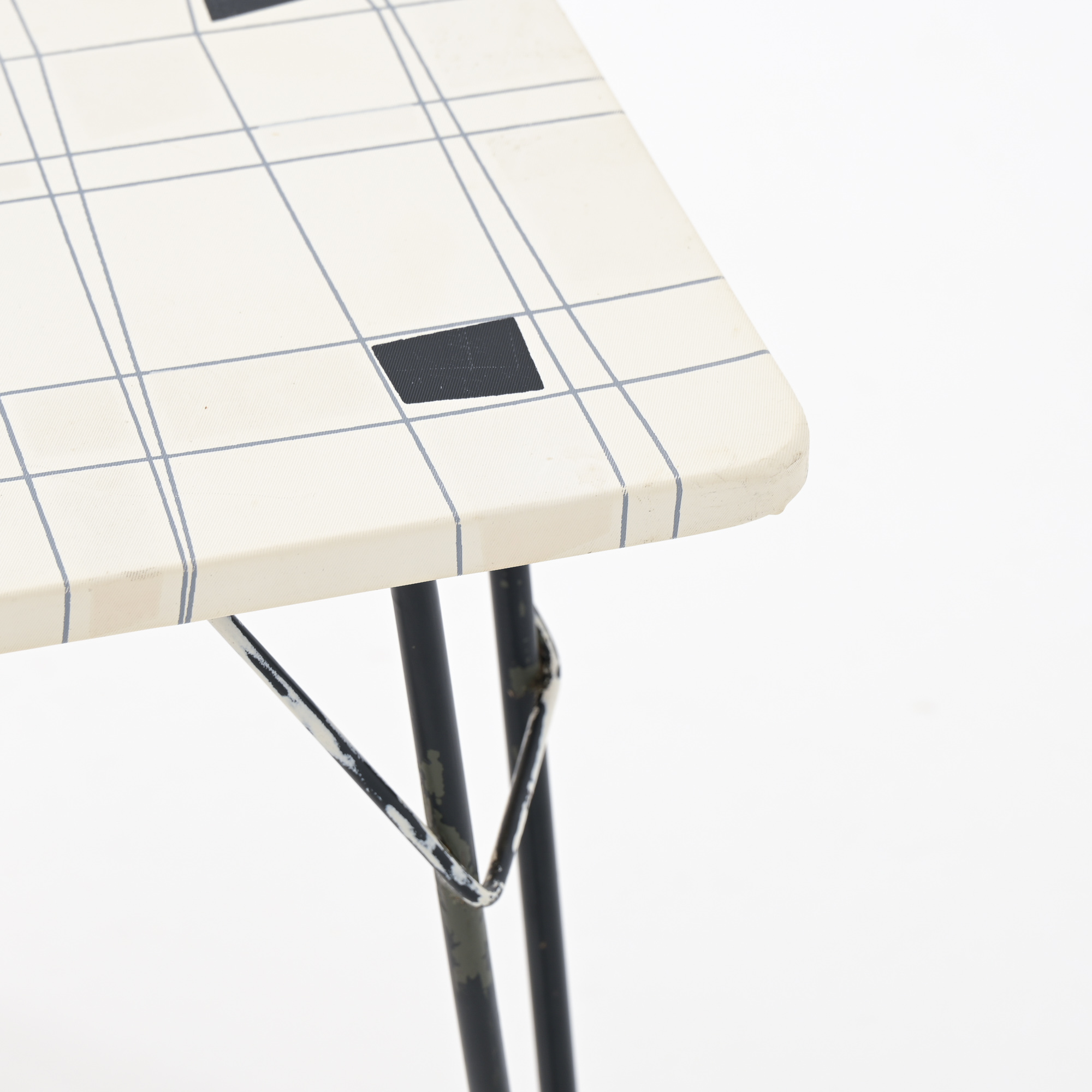 The three-legged frame is made of black painted metal tubes, the top is covered with printed vinyl.