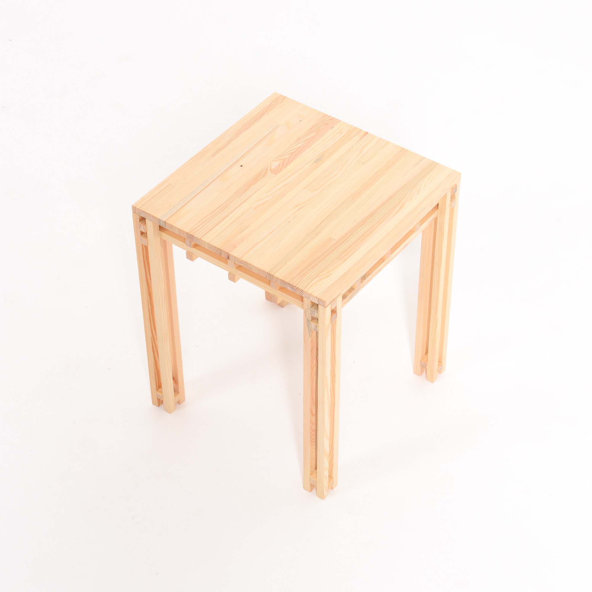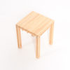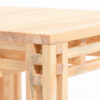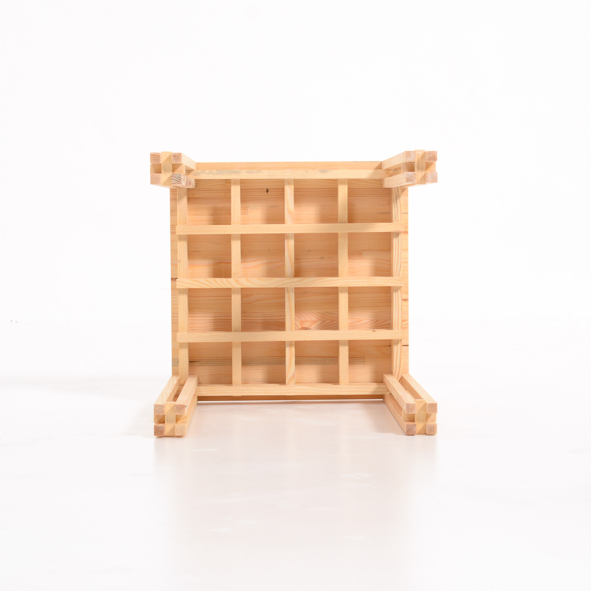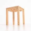 Table 15 is a side table made of 15 mm slats. It is the smaller version of Table 18. The structure of the design is identical to that of Table 18, but smaller, as the name suggests. The wooden tabletop, the grid and the legs have been merged together by all kinds of connections into one solid and integrated whole.