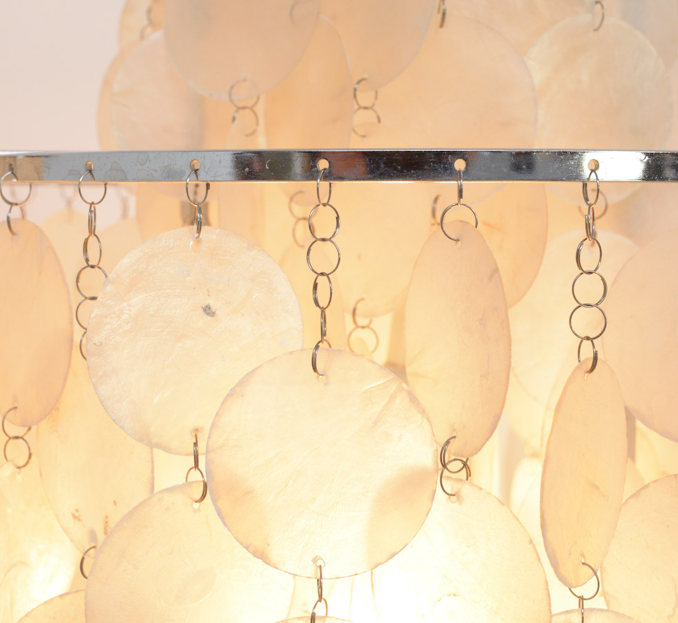 The series of lamps by Verner Panton called Fun, resulted originally from a game with light and silver paper. The shell discs, used in the Orient in ornaments which ring when moved by the wind, have a particularly warm, diffuse lighting effect. The Fun lamp represents the psychedelic athmosphere of the 1960s.