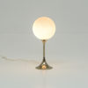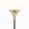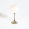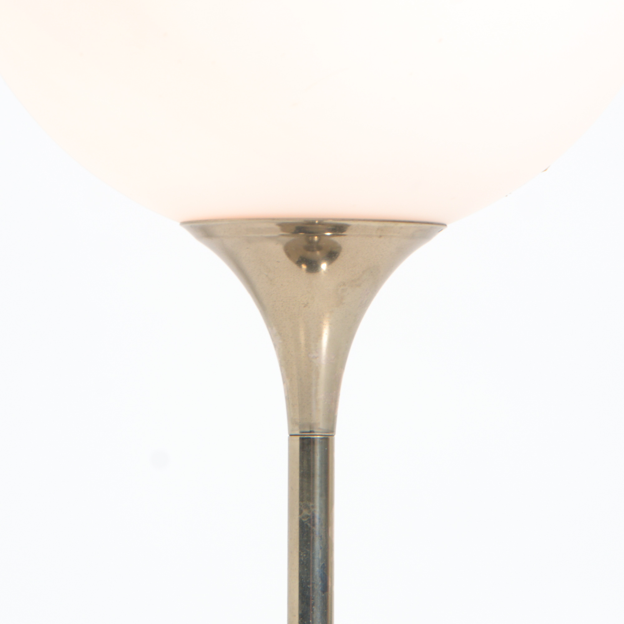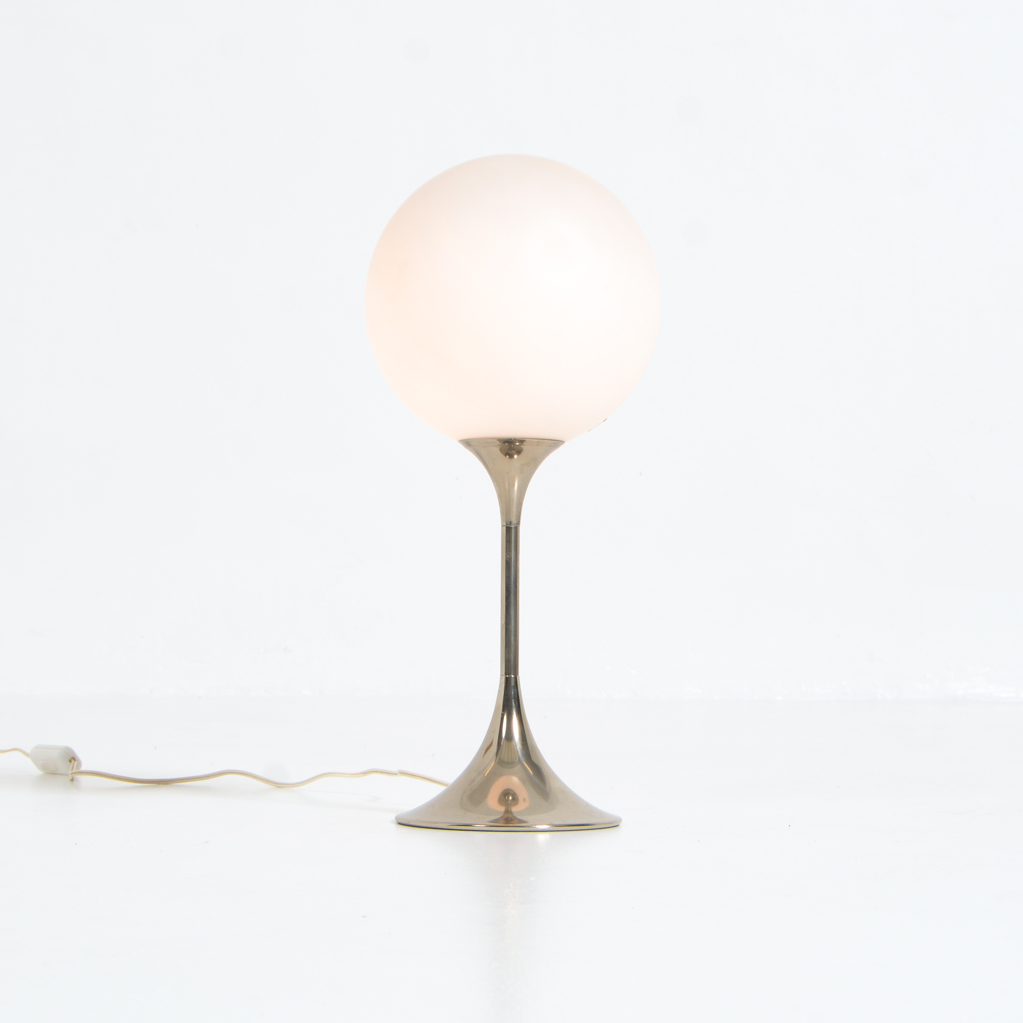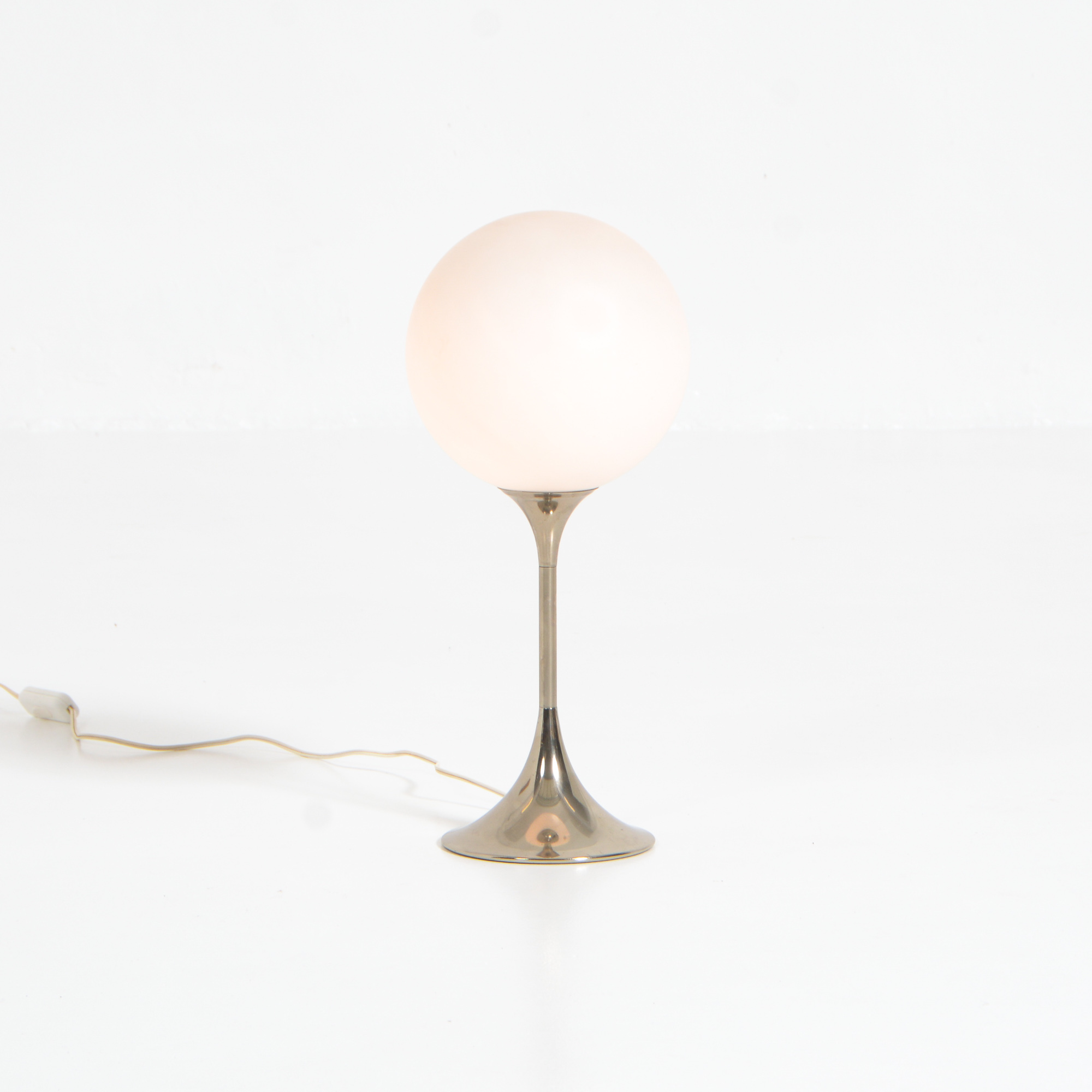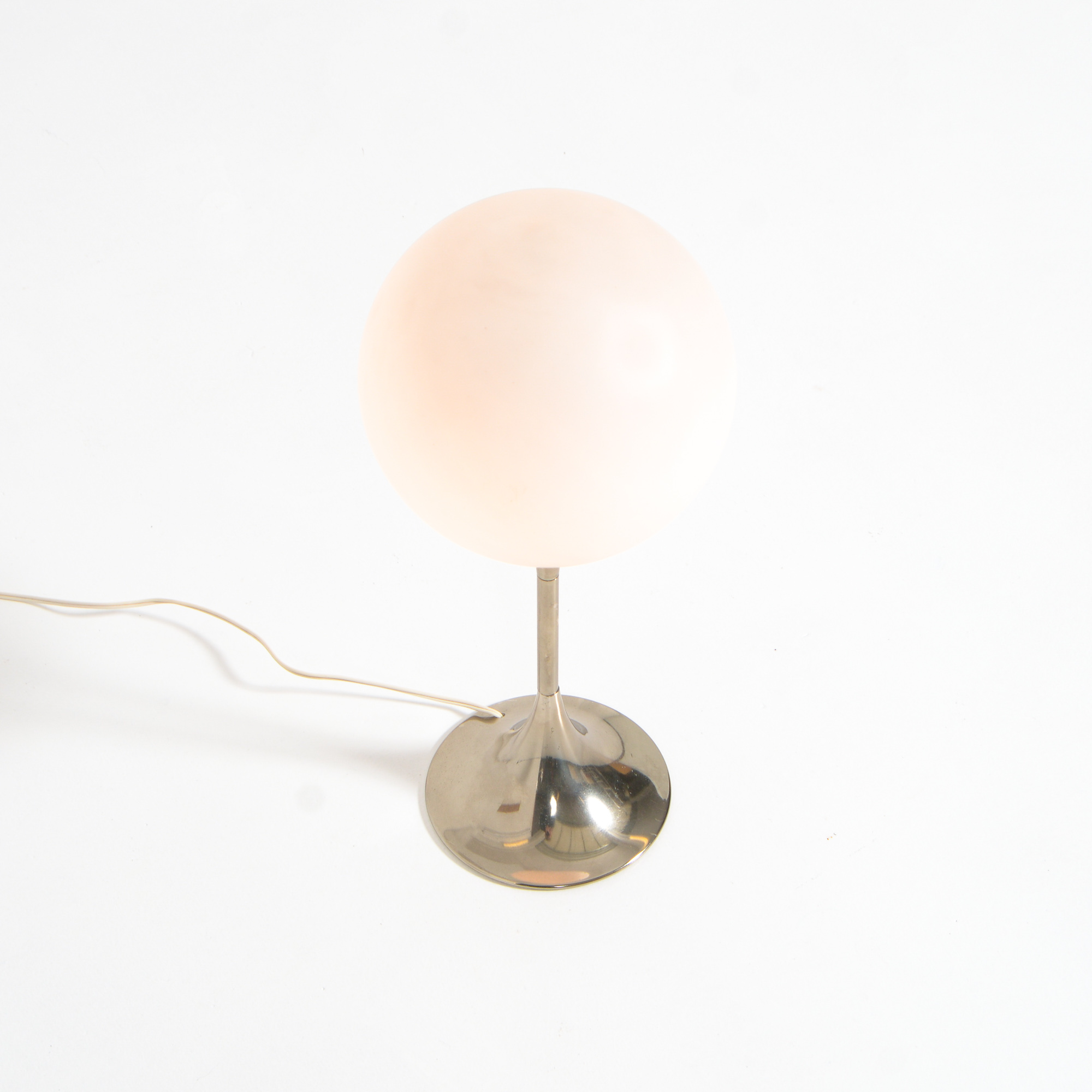 The chrome tulip base holds the white glass globe.