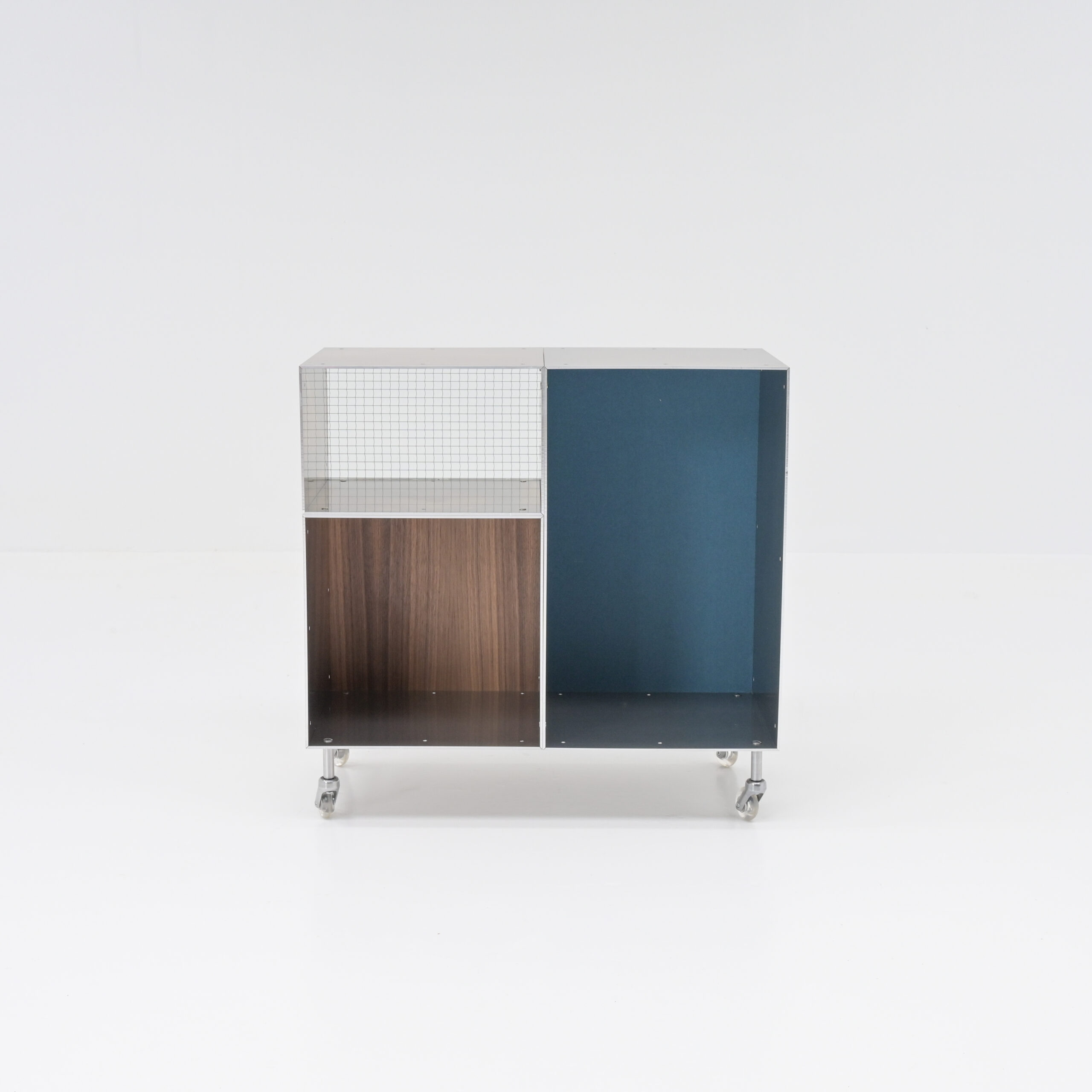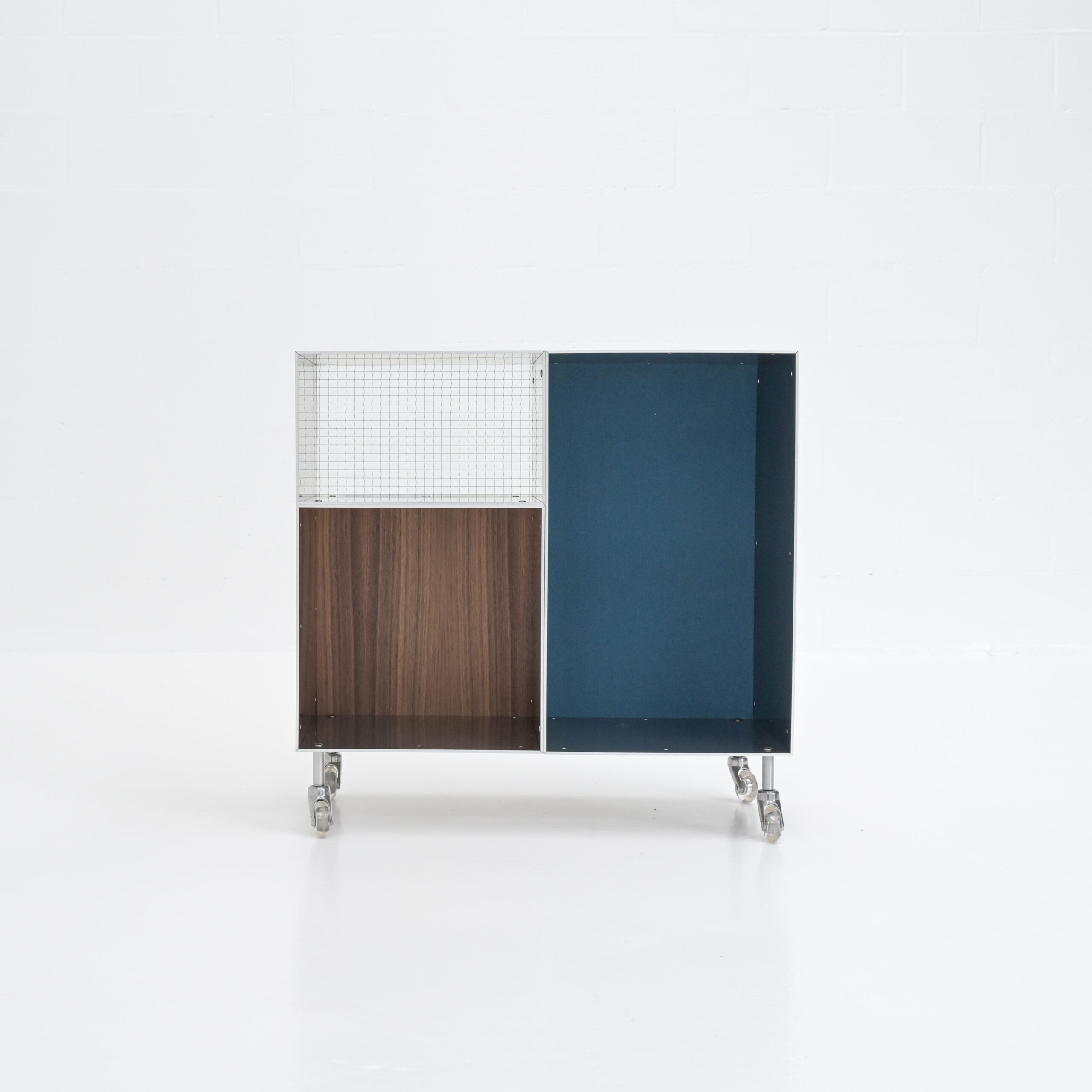 3 modules, perfectly shaped according to the golden ratio, set up the base for an endless range of possibilities. You can use one of them as an independent piece (on its own) or you can combine them in a big set-up: wall mounted, free standing or on wheels. Horizontal or vertical. With doors, shelves and backs in woolfelt, wood or wired glass. The outcome of the totem system is completely hand-made by you and only you.
