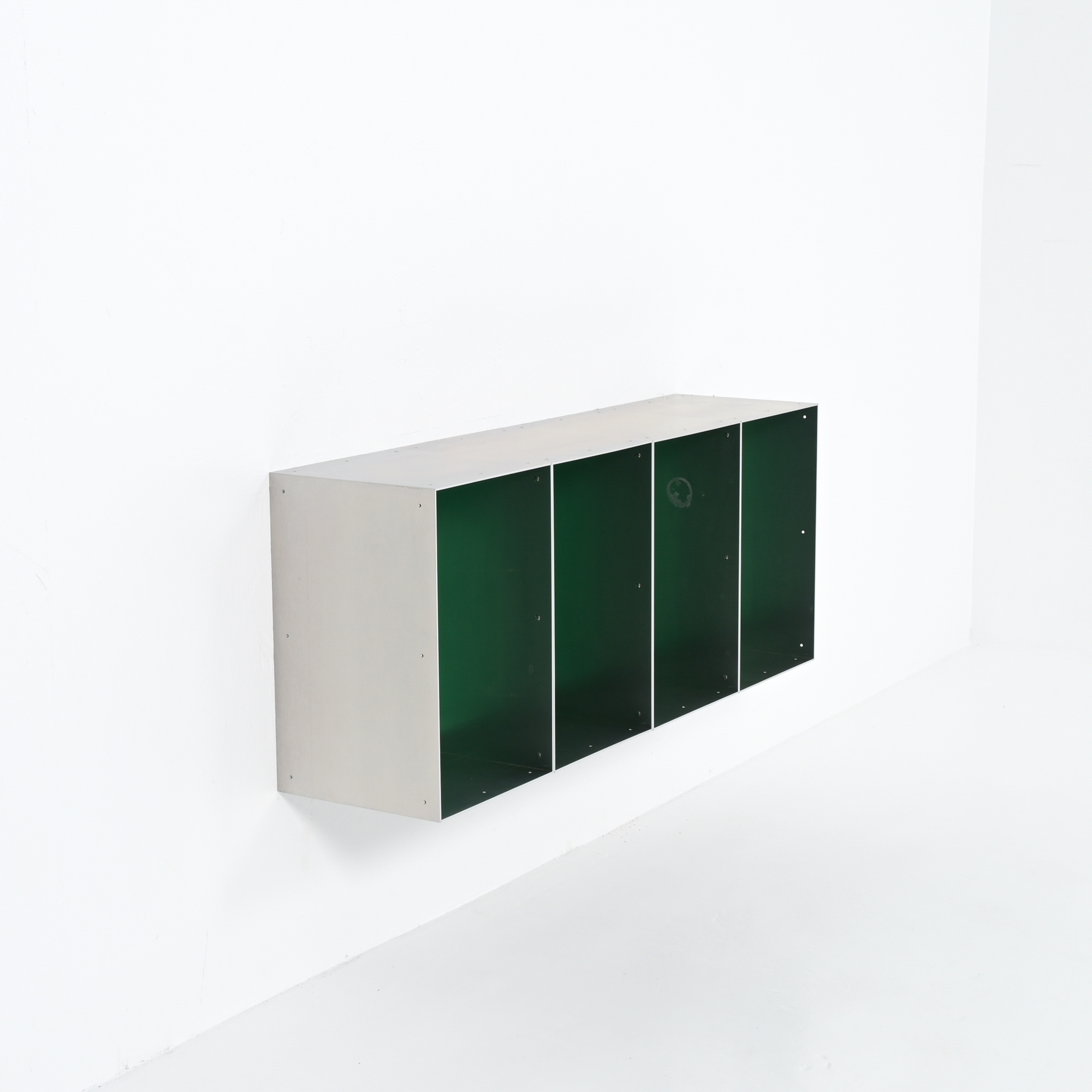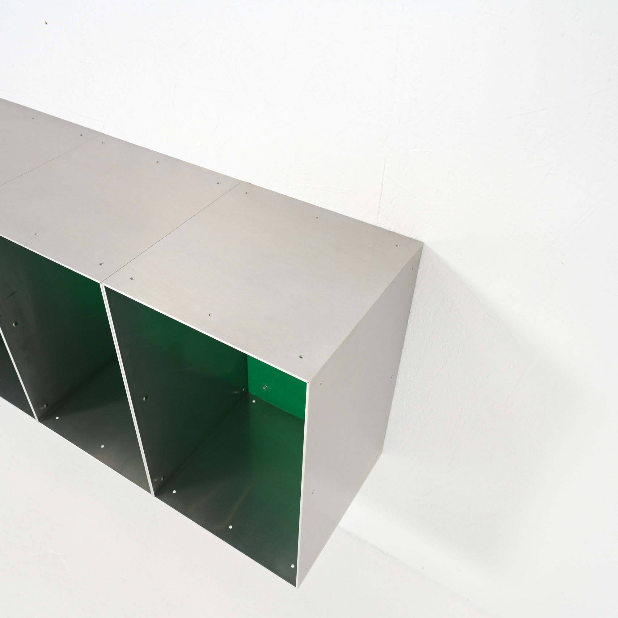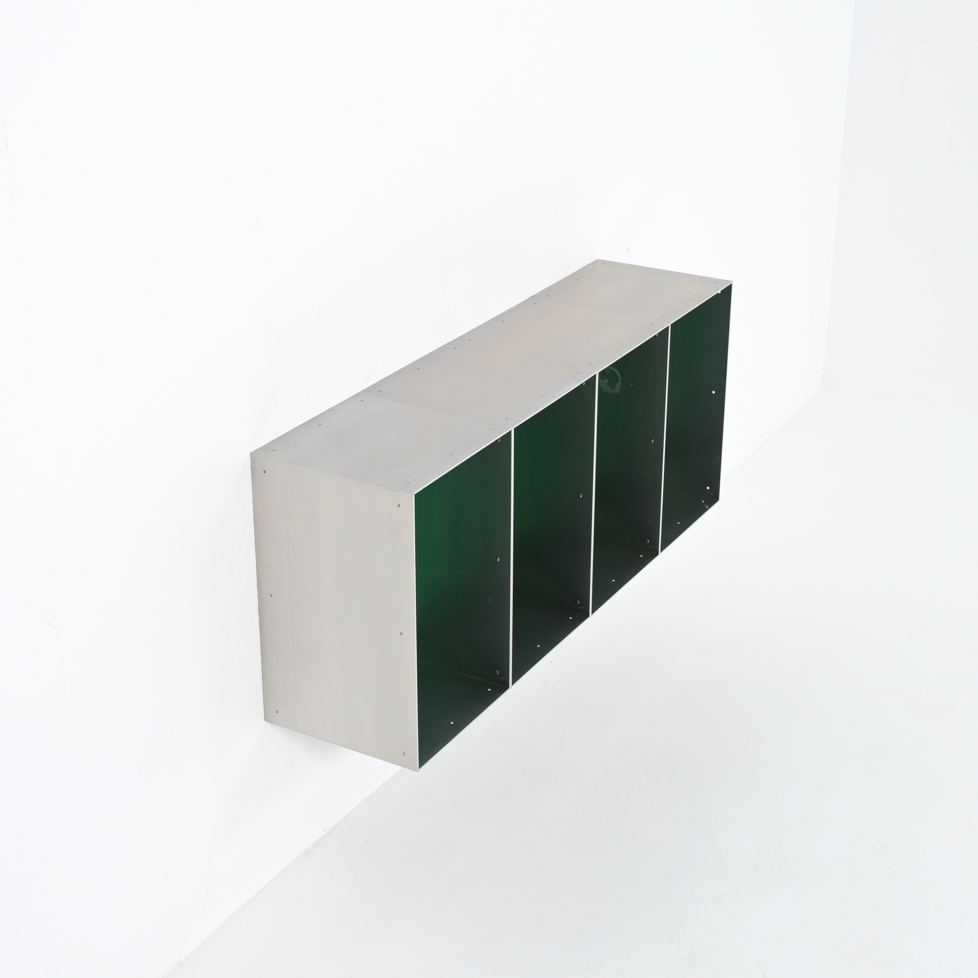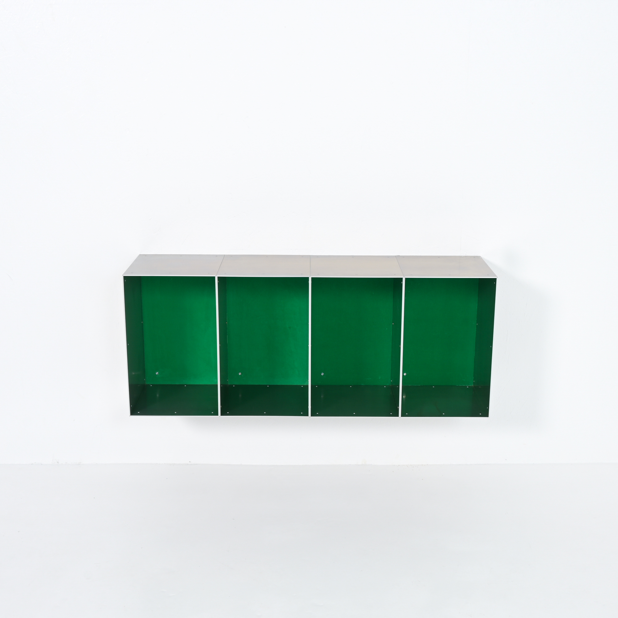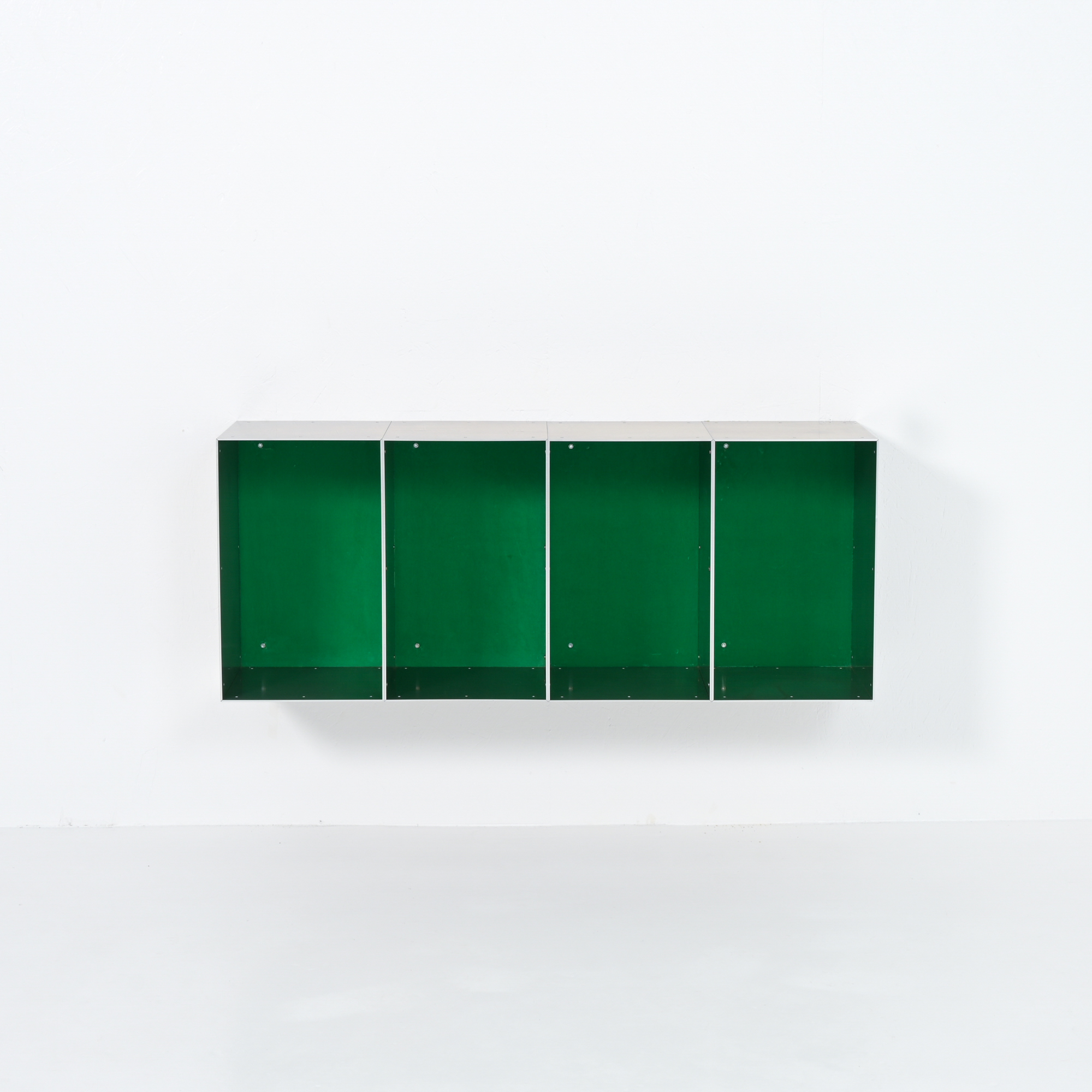 This wall cabinet was developed and made by Atelier Belge. Besides the well-crafted raw aluminum, this piece features a vibrant green velvet interior from Raf Simons. The modular system allows for different configurations.