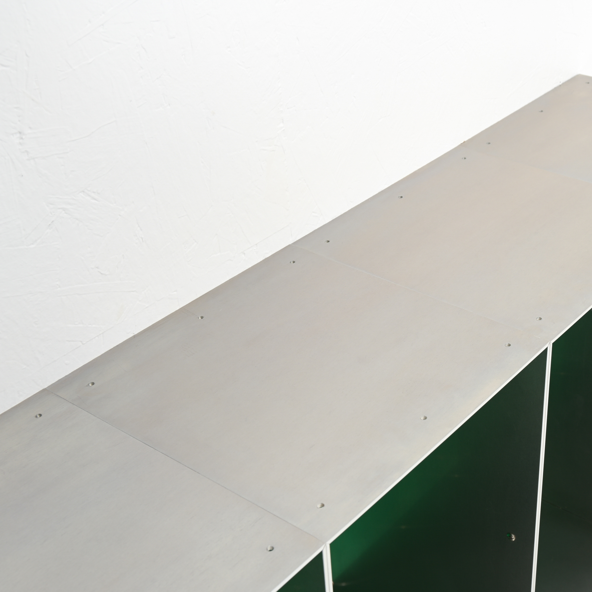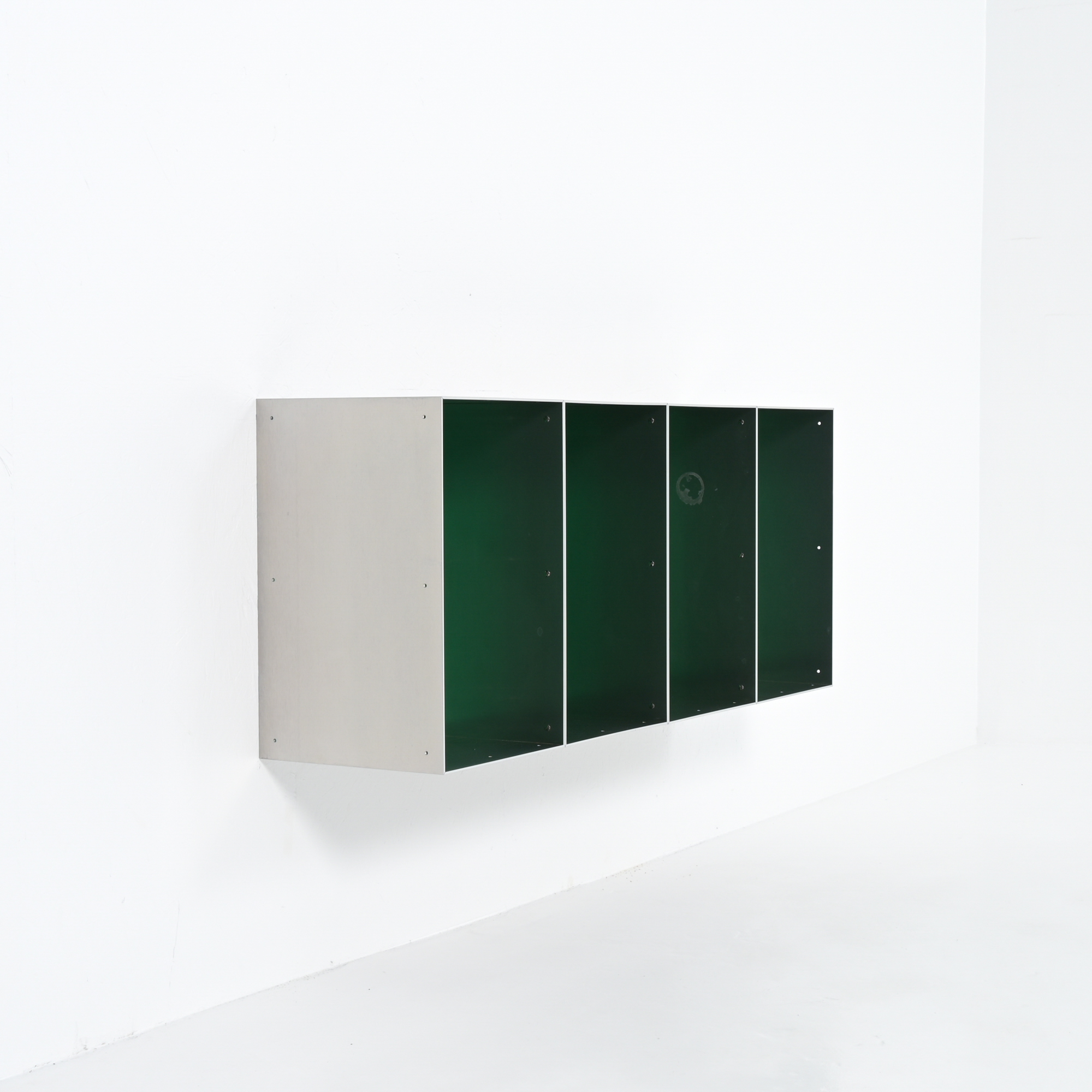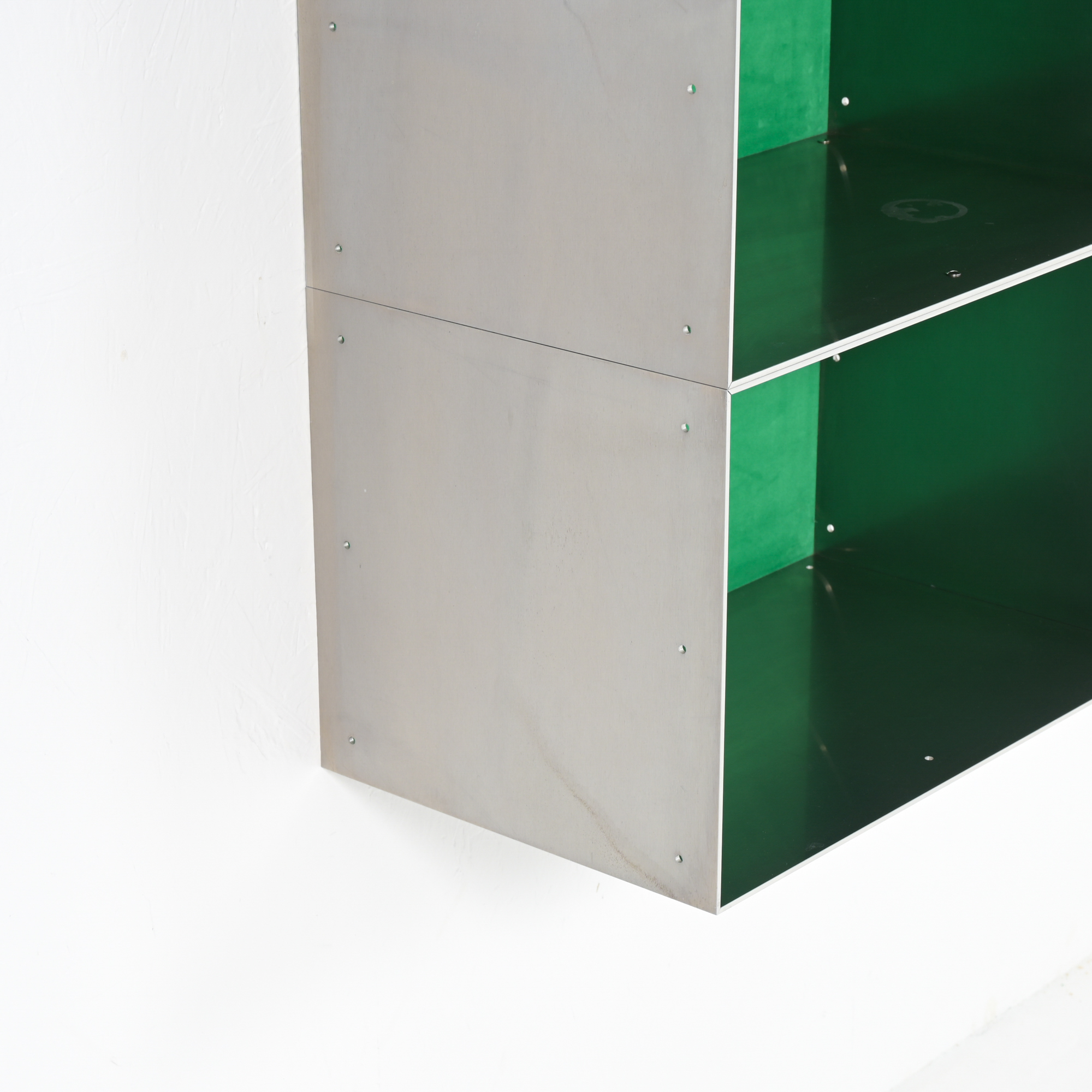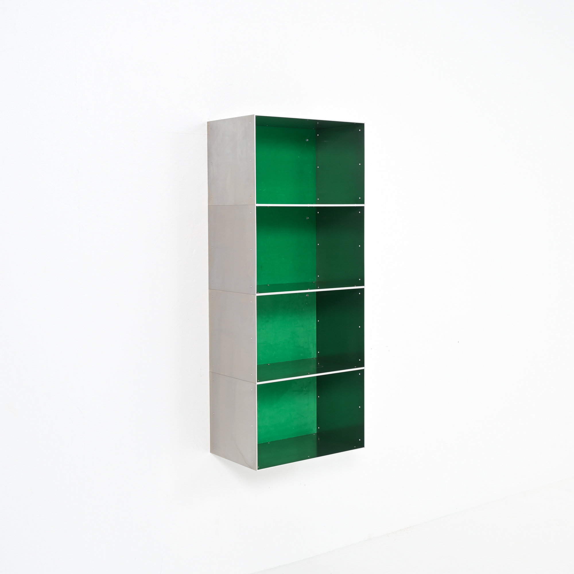 This wall cabinet was developed and made by Atelier Belge. Besides the well-crafted raw aluminum, this piece features a vibrant green velvet interior from Raf Simons. The modular system allows for different configurations.