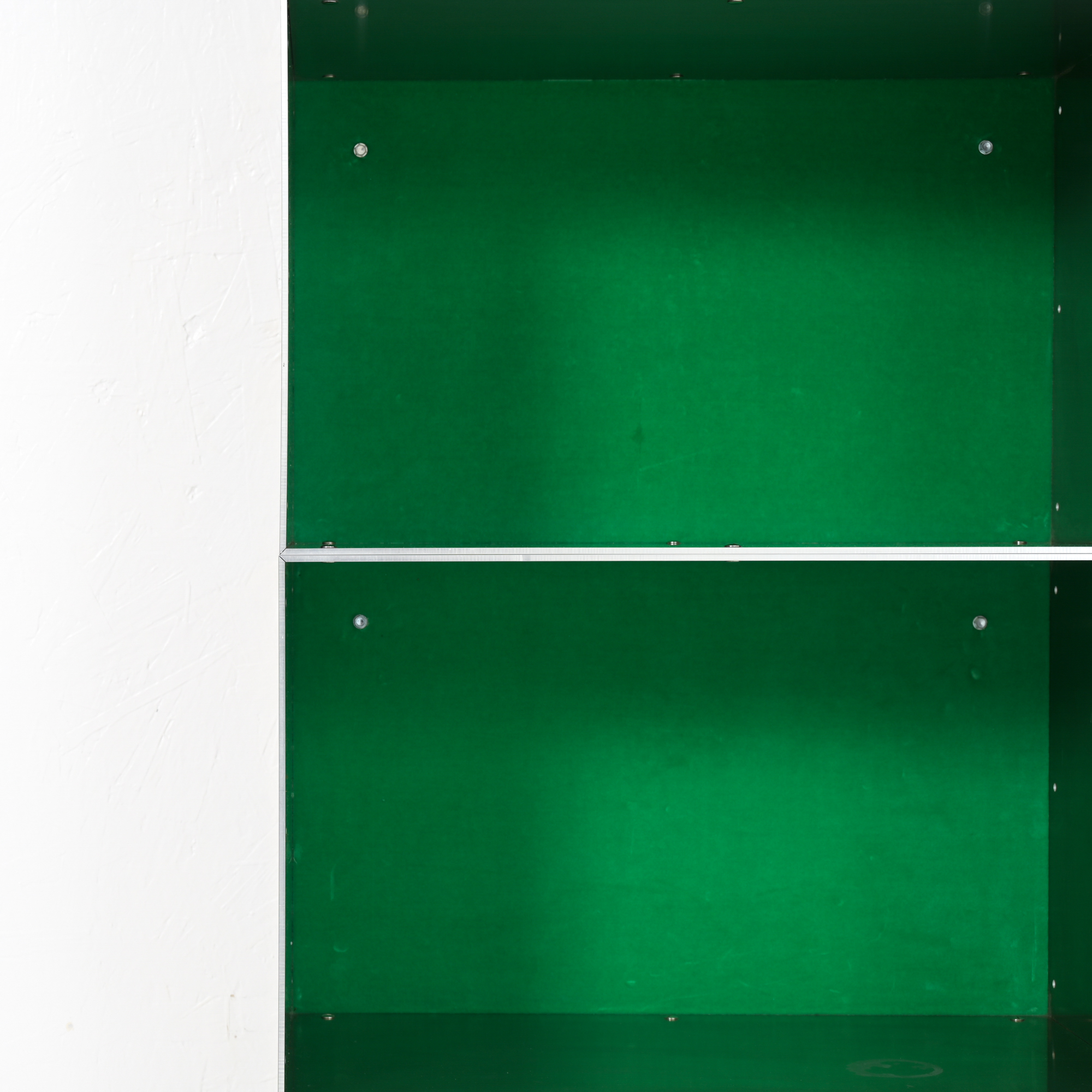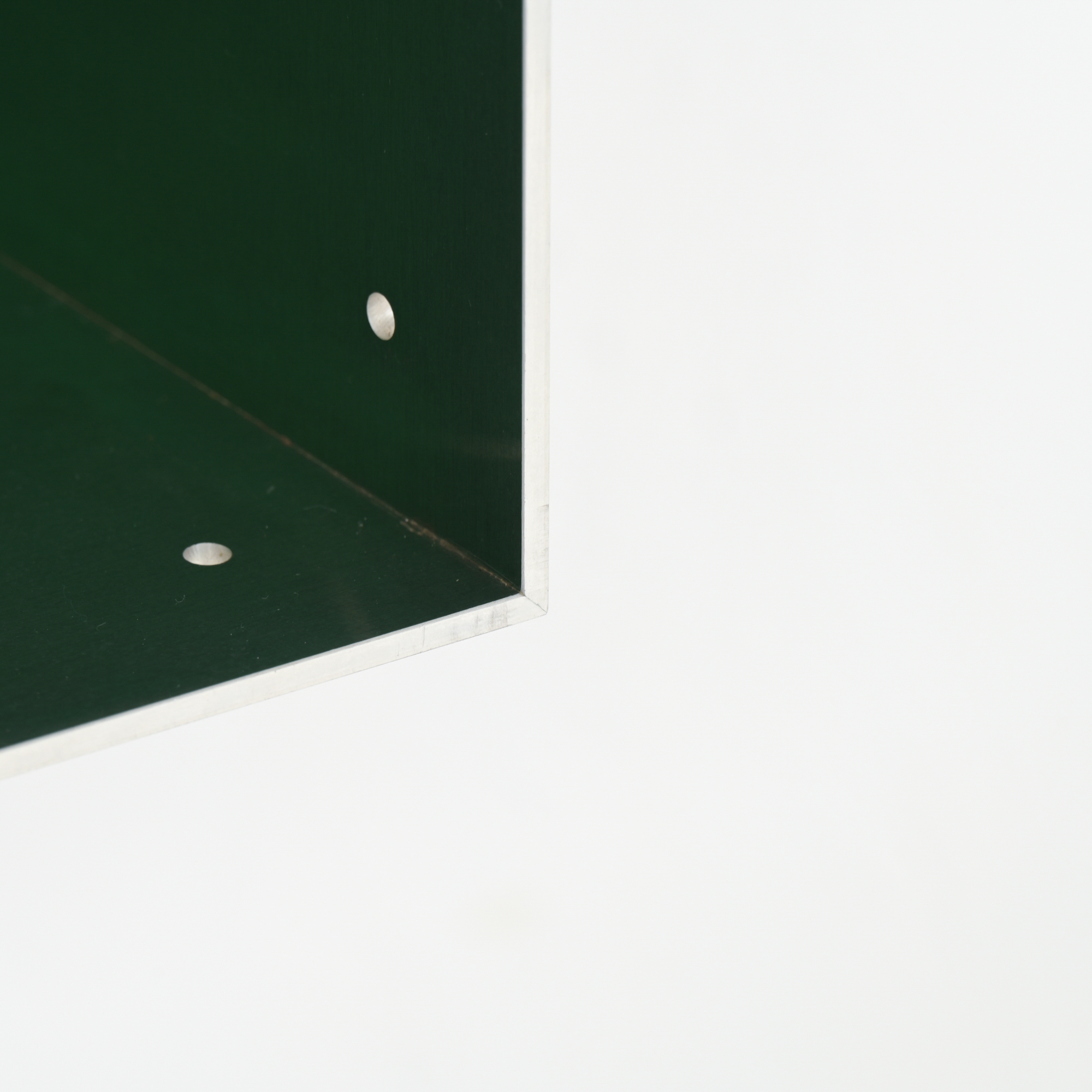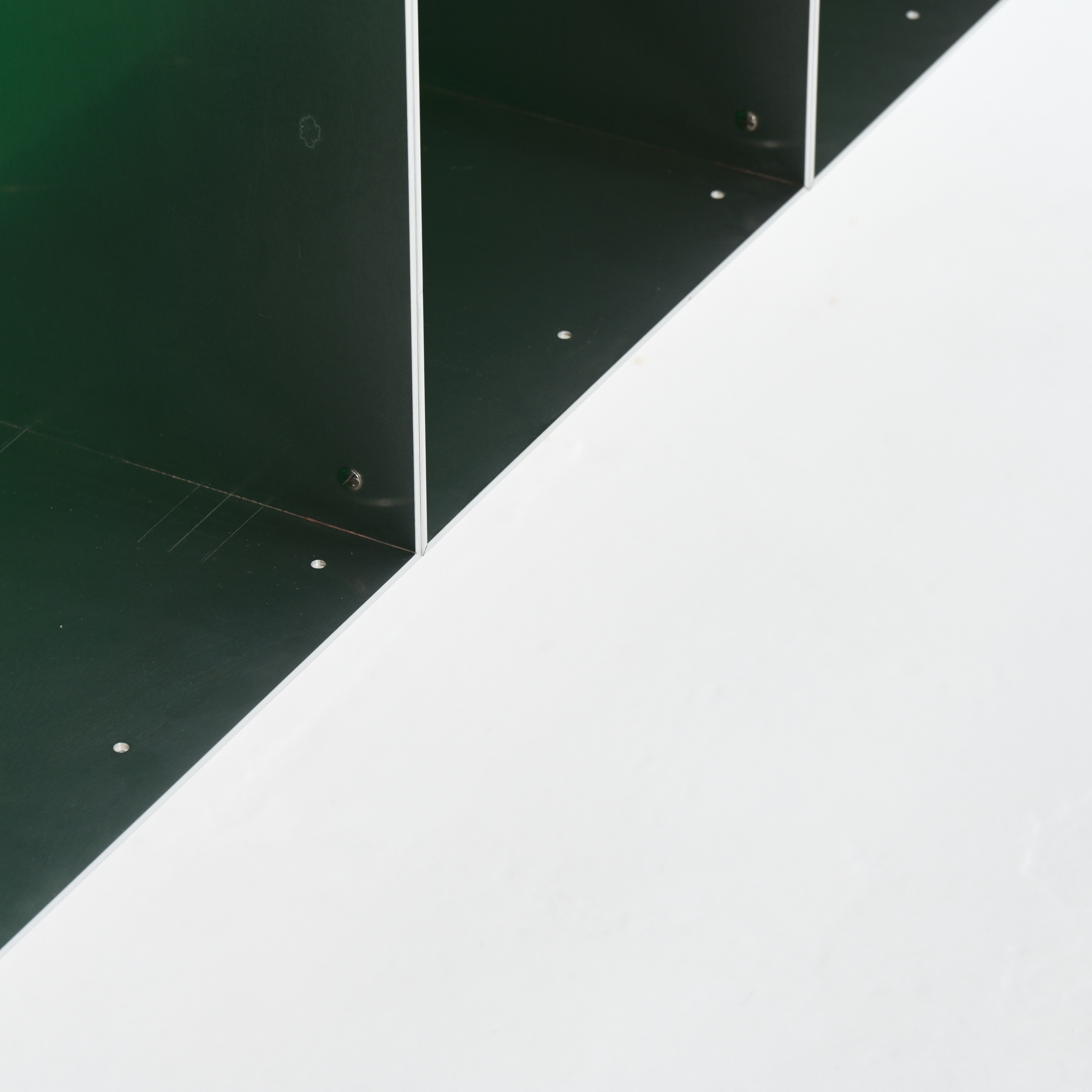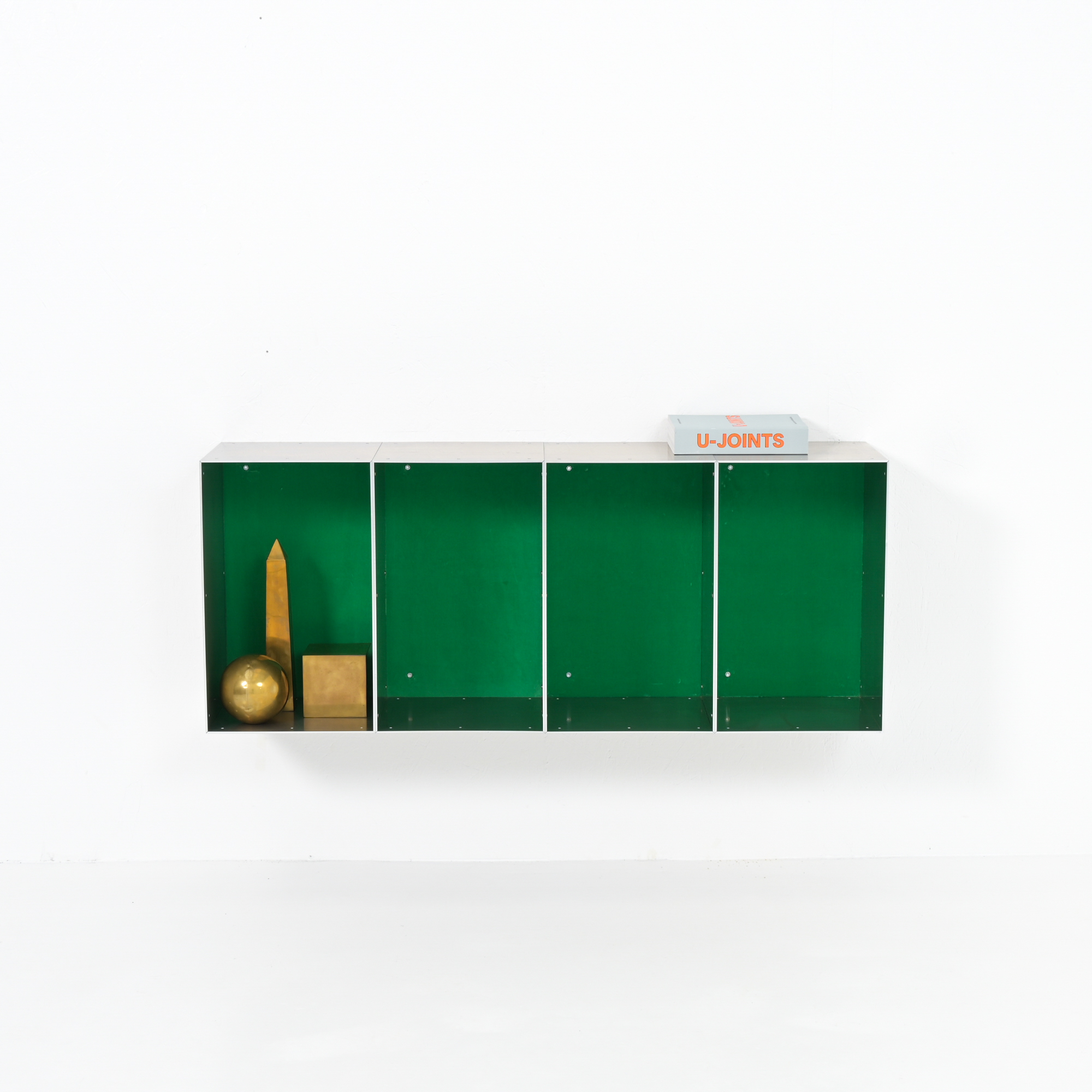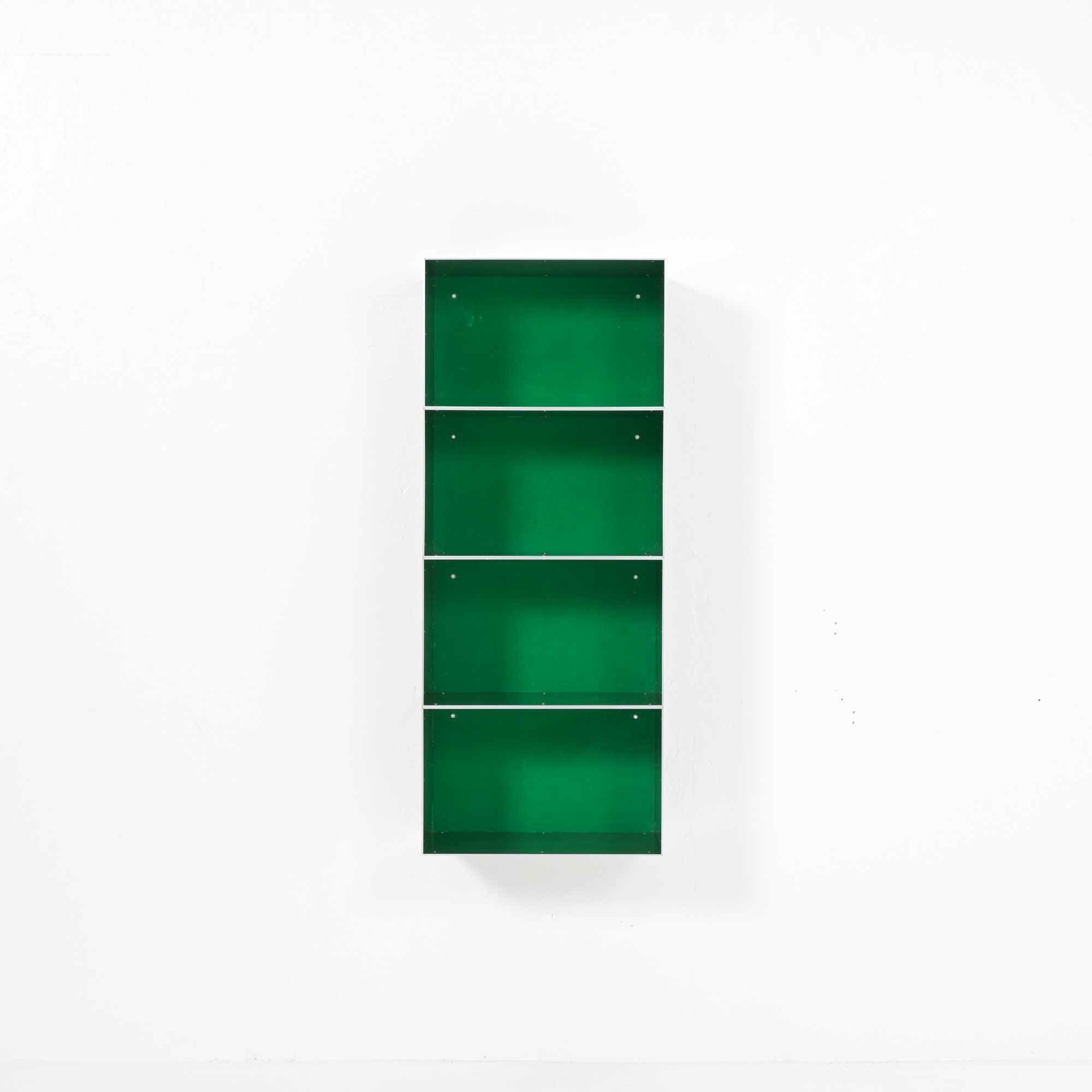 This wall cabinet was developed and made by Atelier Belge. Besides the well-crafted raw aluminum, this piece features a vibrant green velvet interior from Raf Simons. The modular system allows for different configurations.