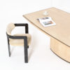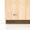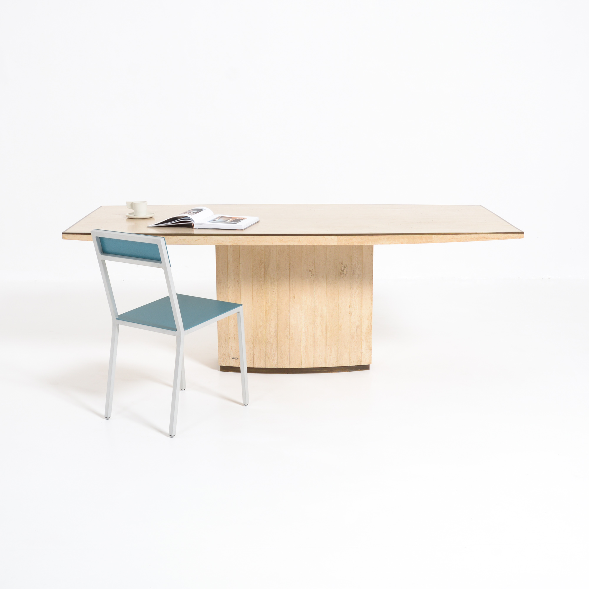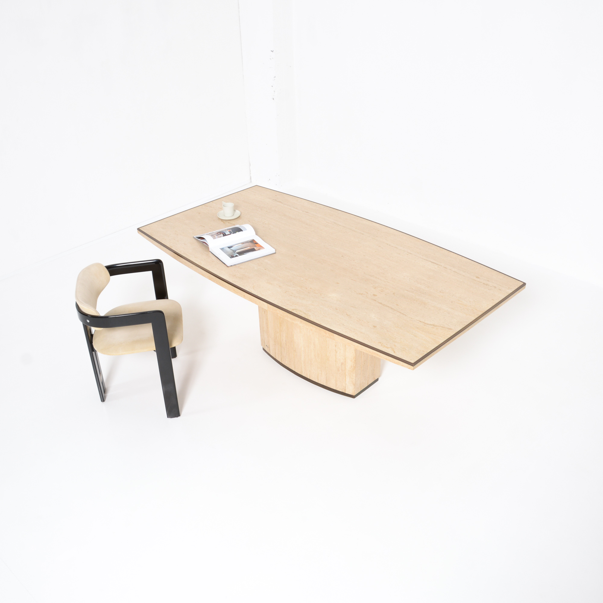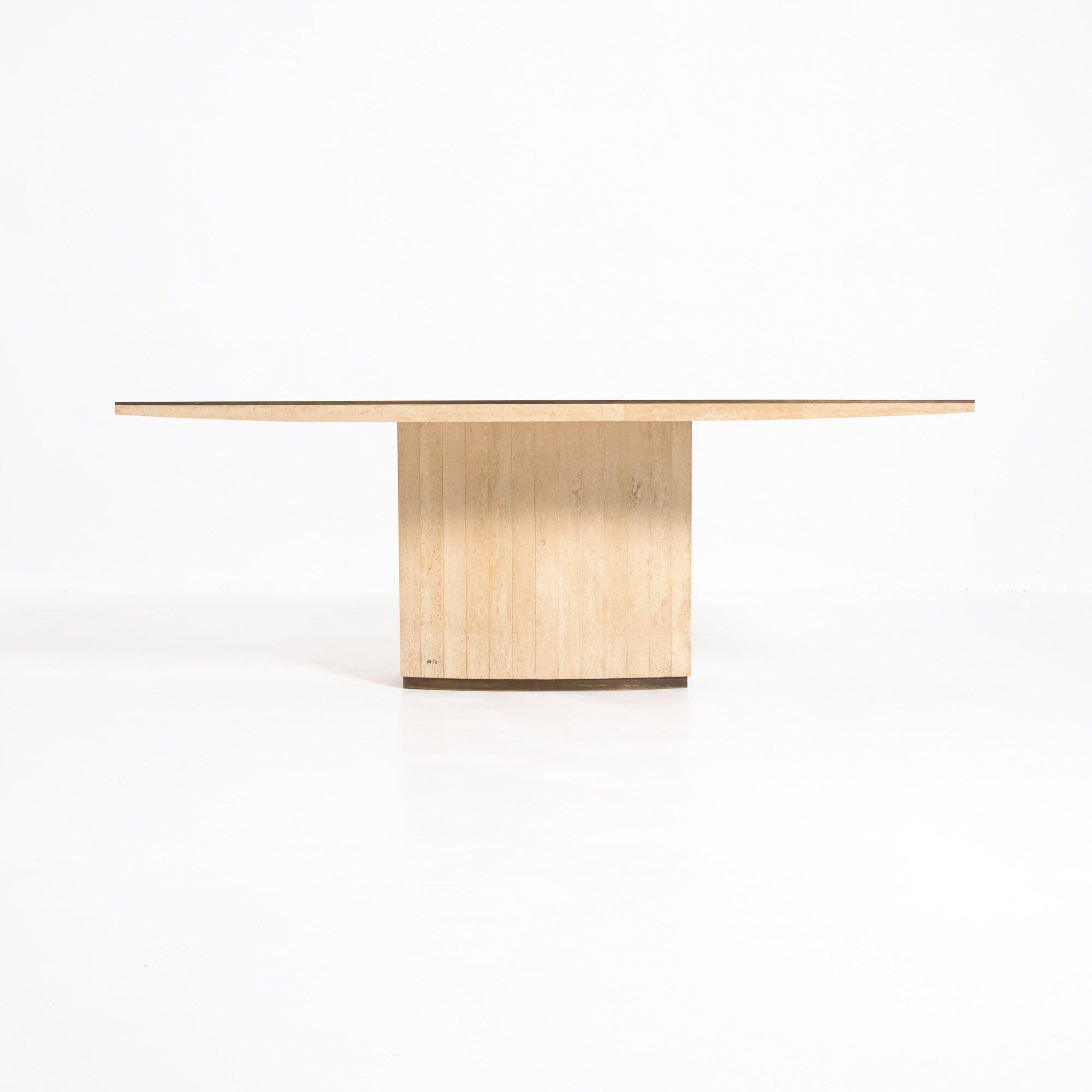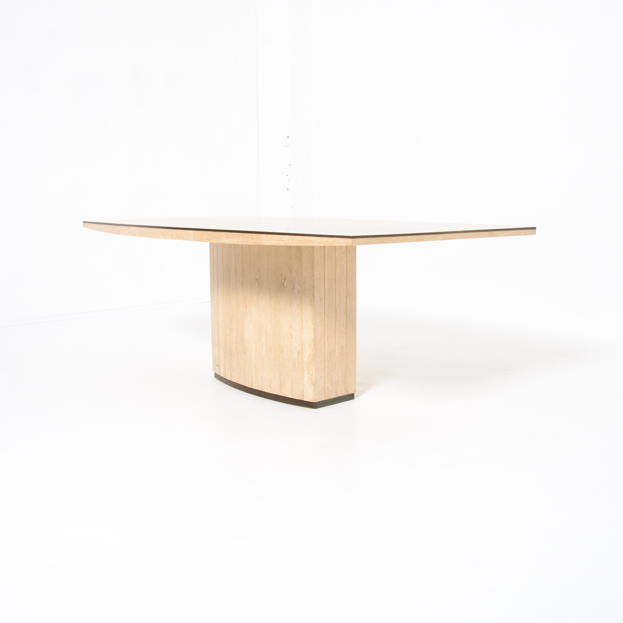 The dining table has a solid travertine top with brass edges. The base is also made of travertine and finished with brass.
