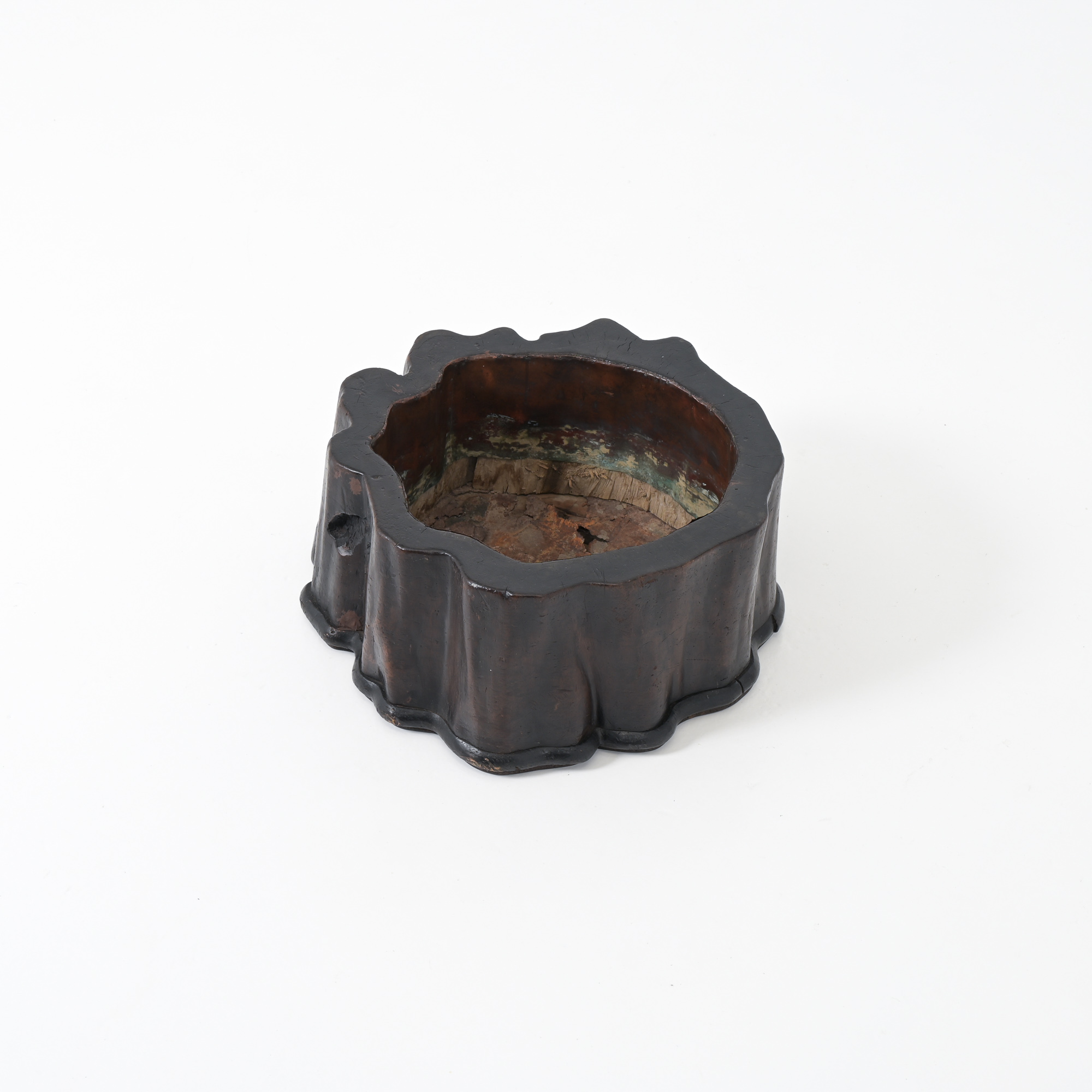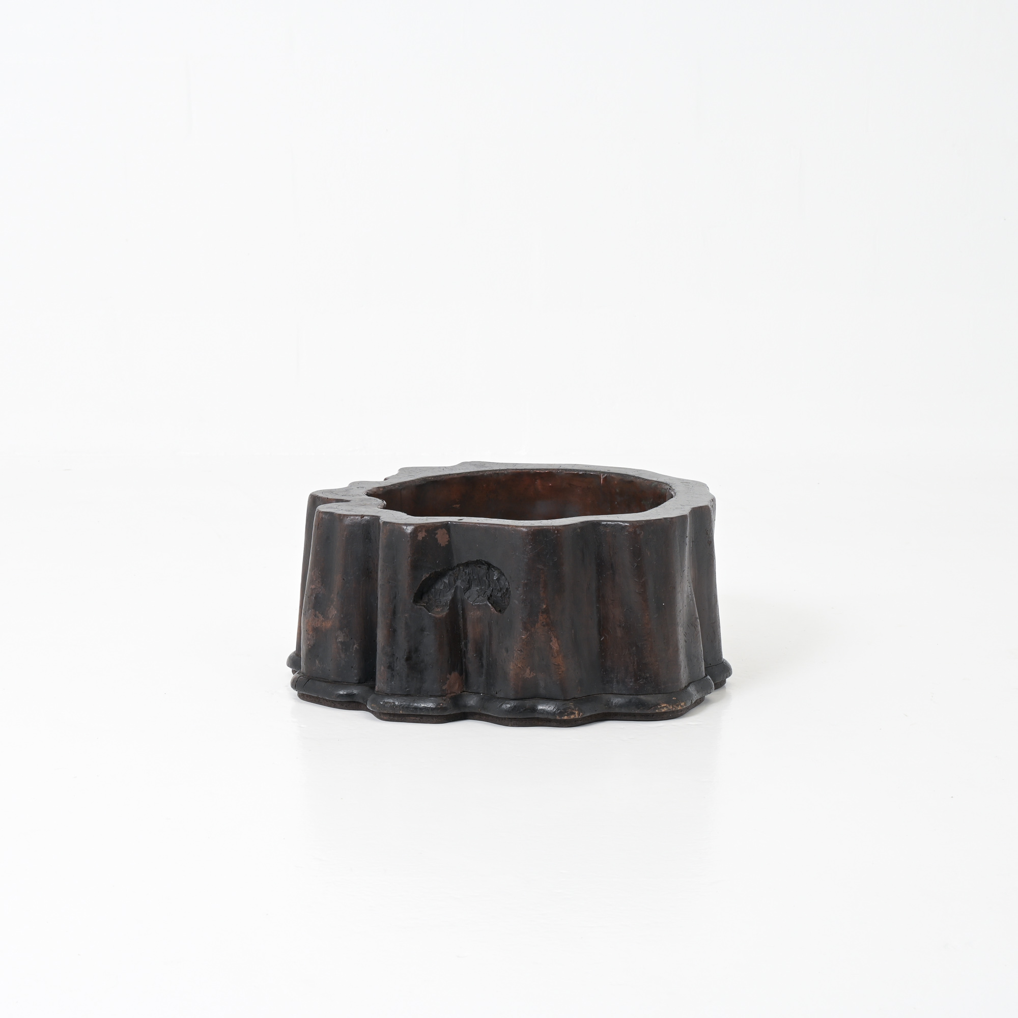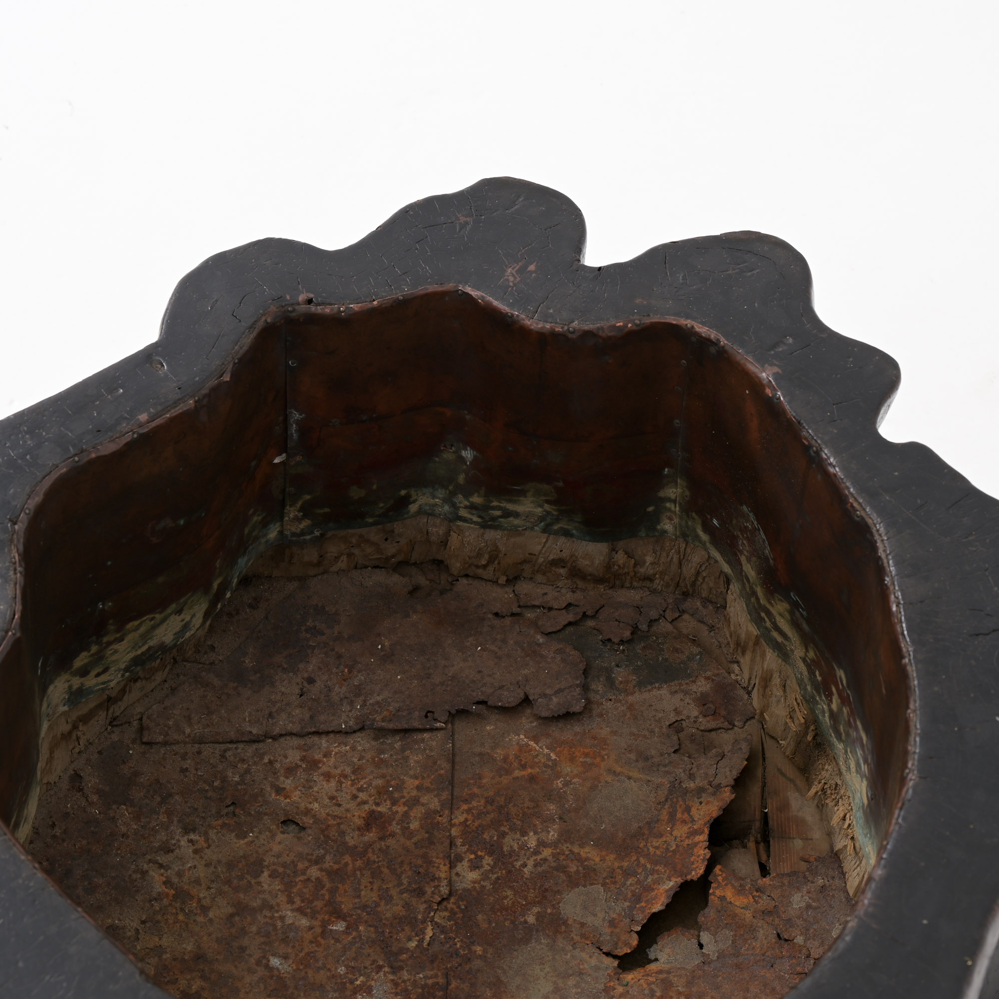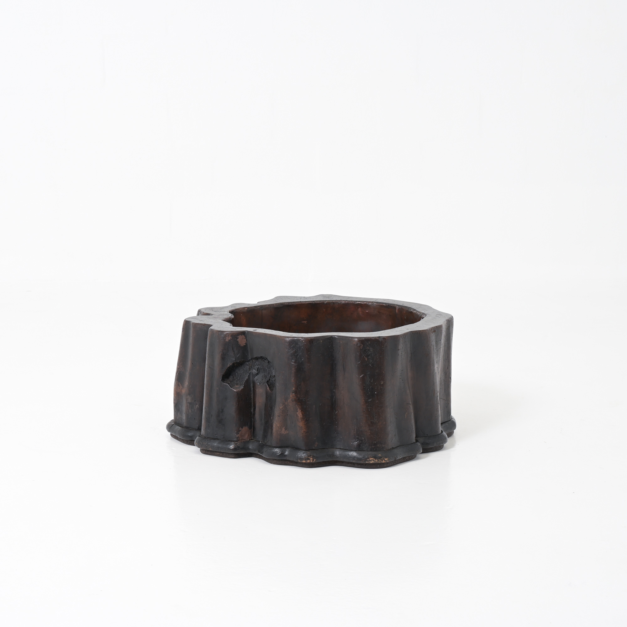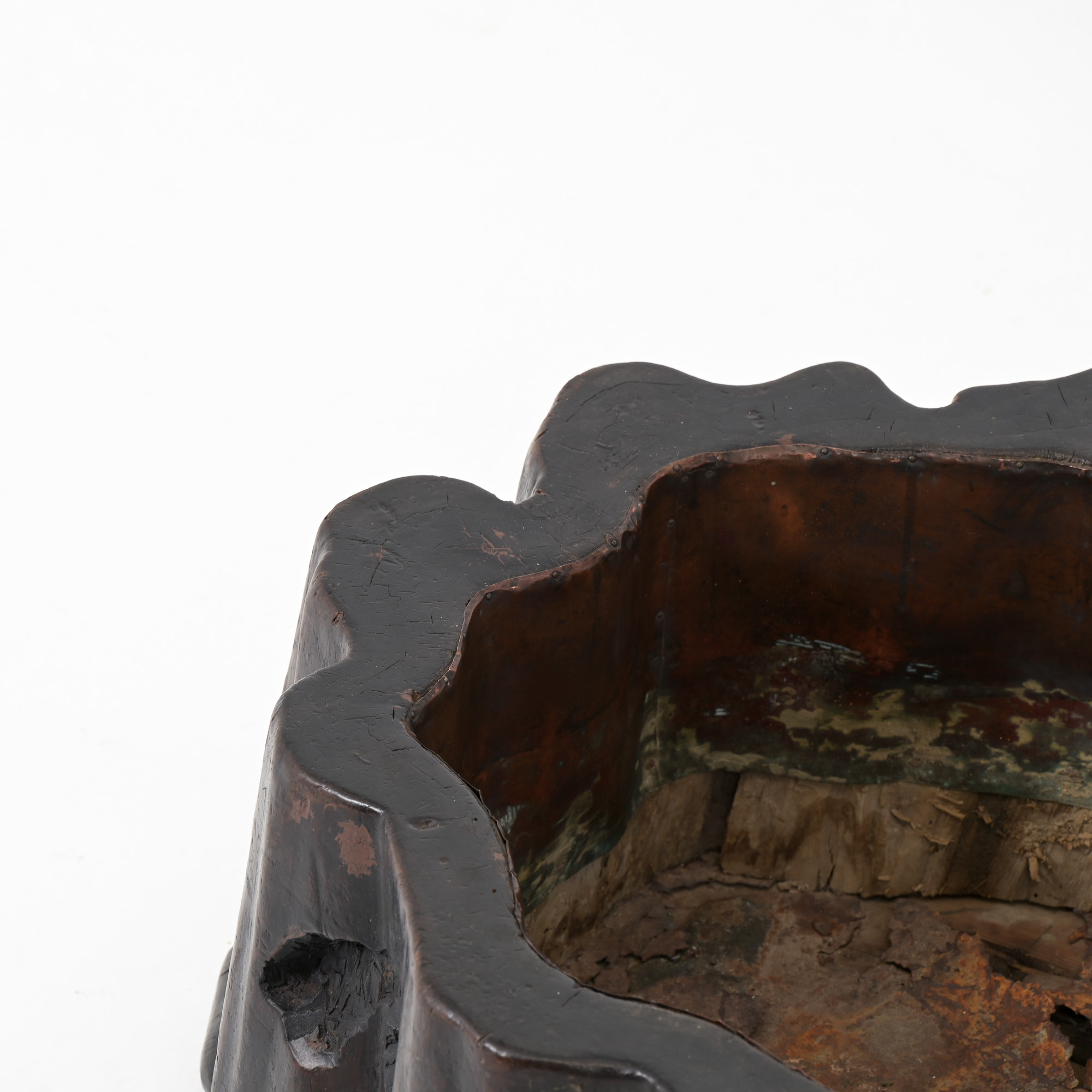 Made from the root of a tree and lined with copper, it boasts a warm patina and features an interesting curved shape, making it a great addition to any home.