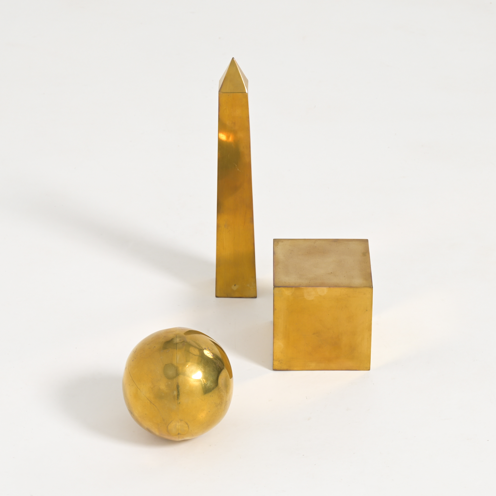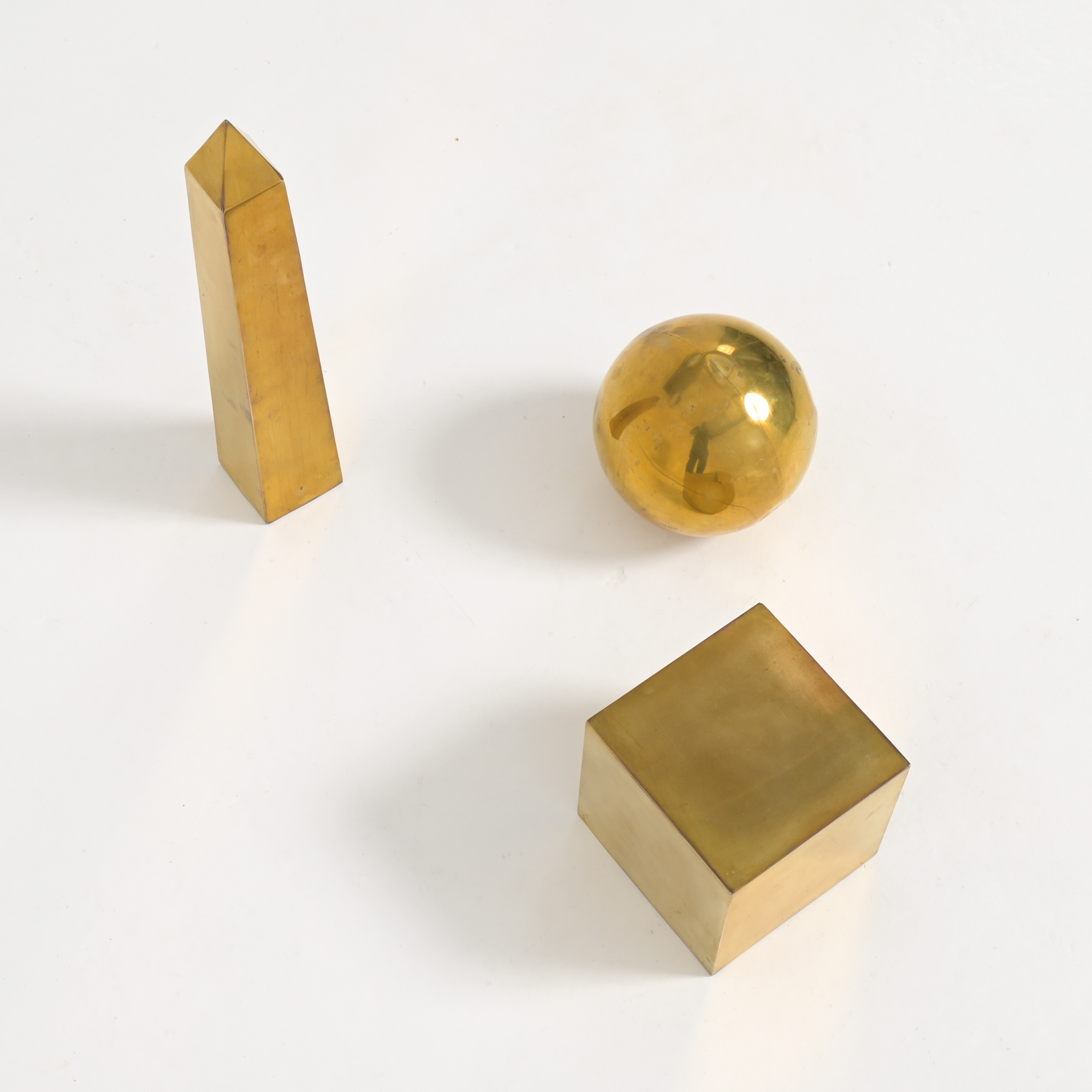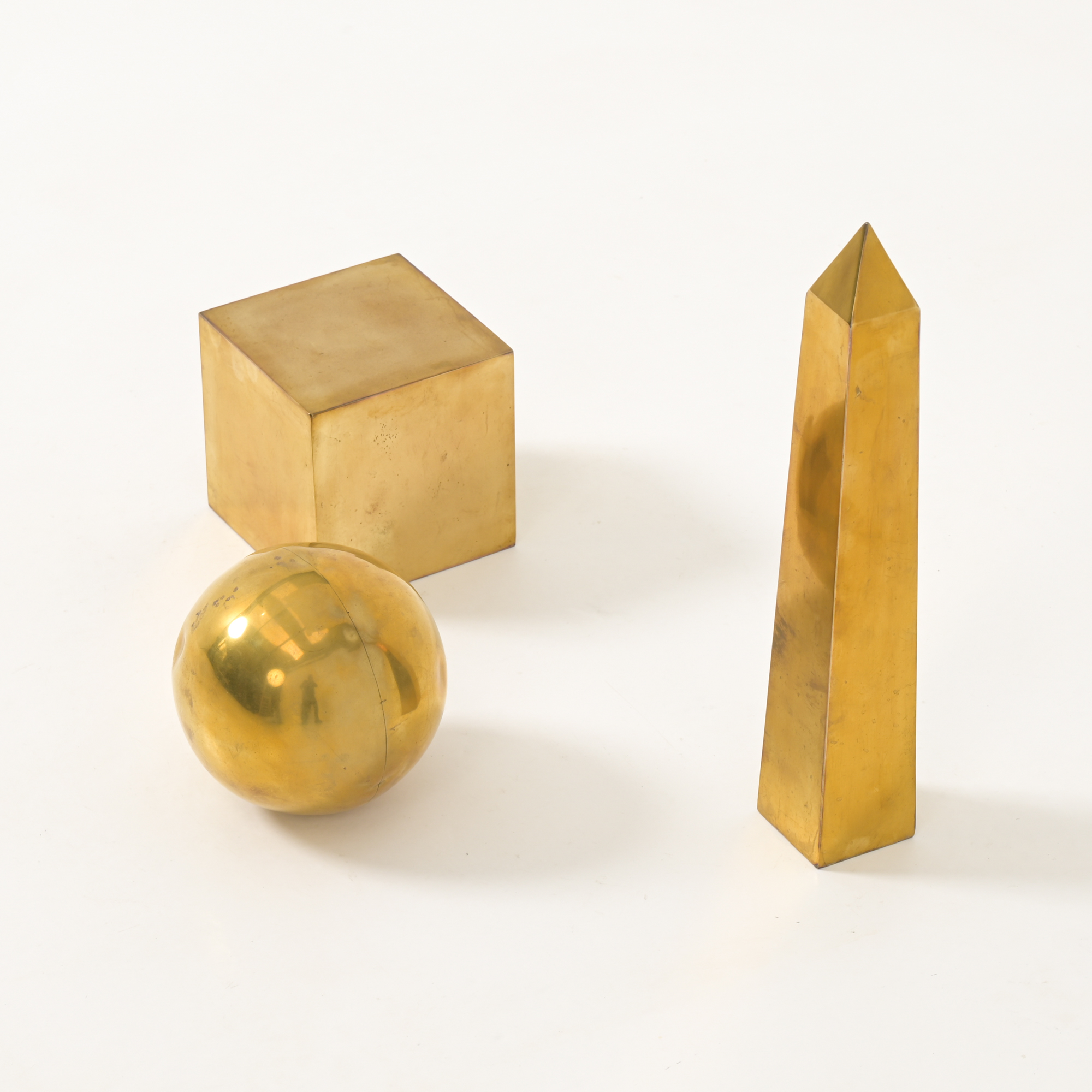 This set of brass sculptures consists out of three geometric shapes, one of which is stamped by the Spanish manufacturer Sarreid.