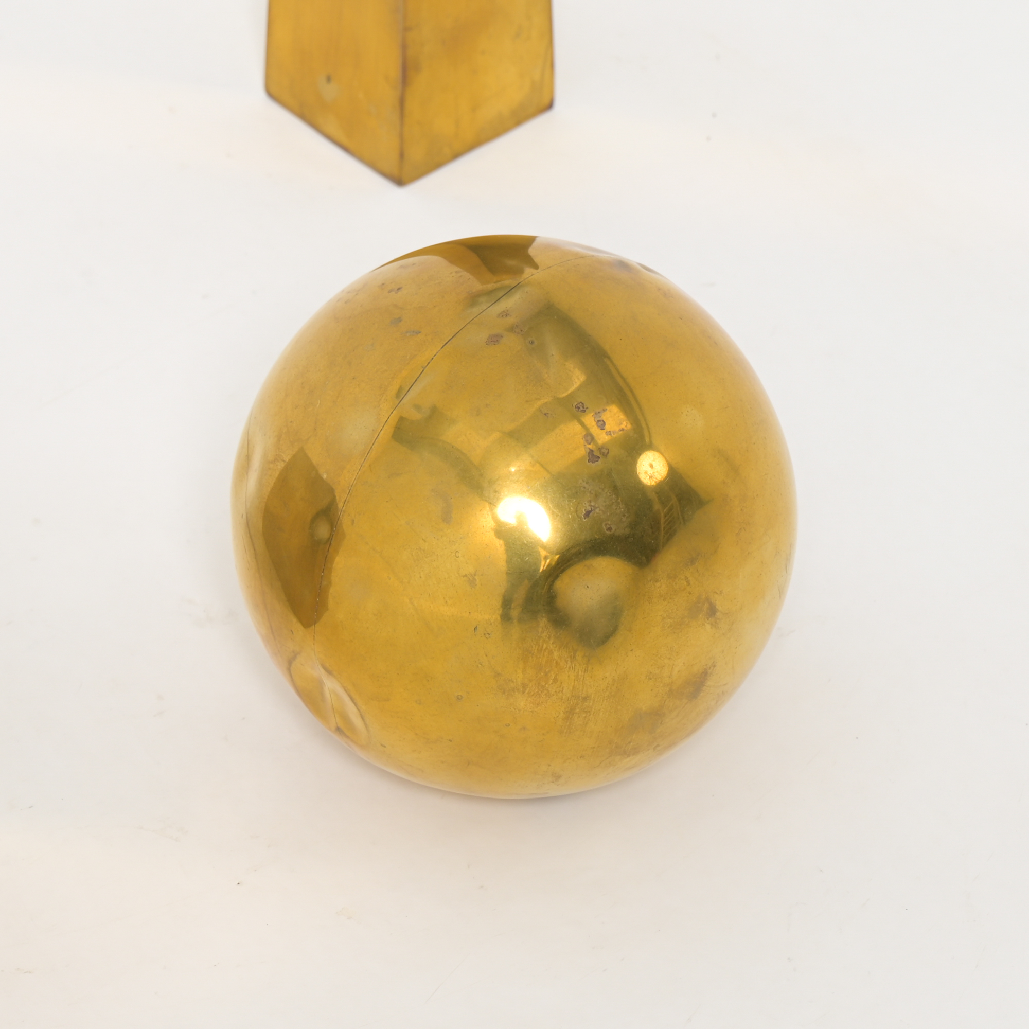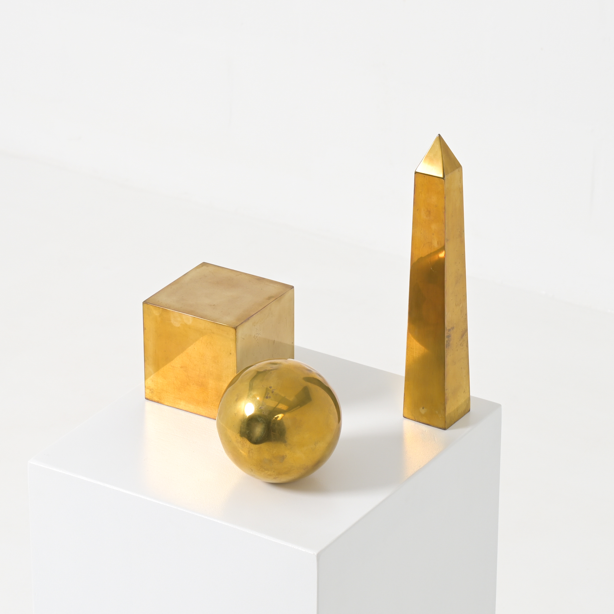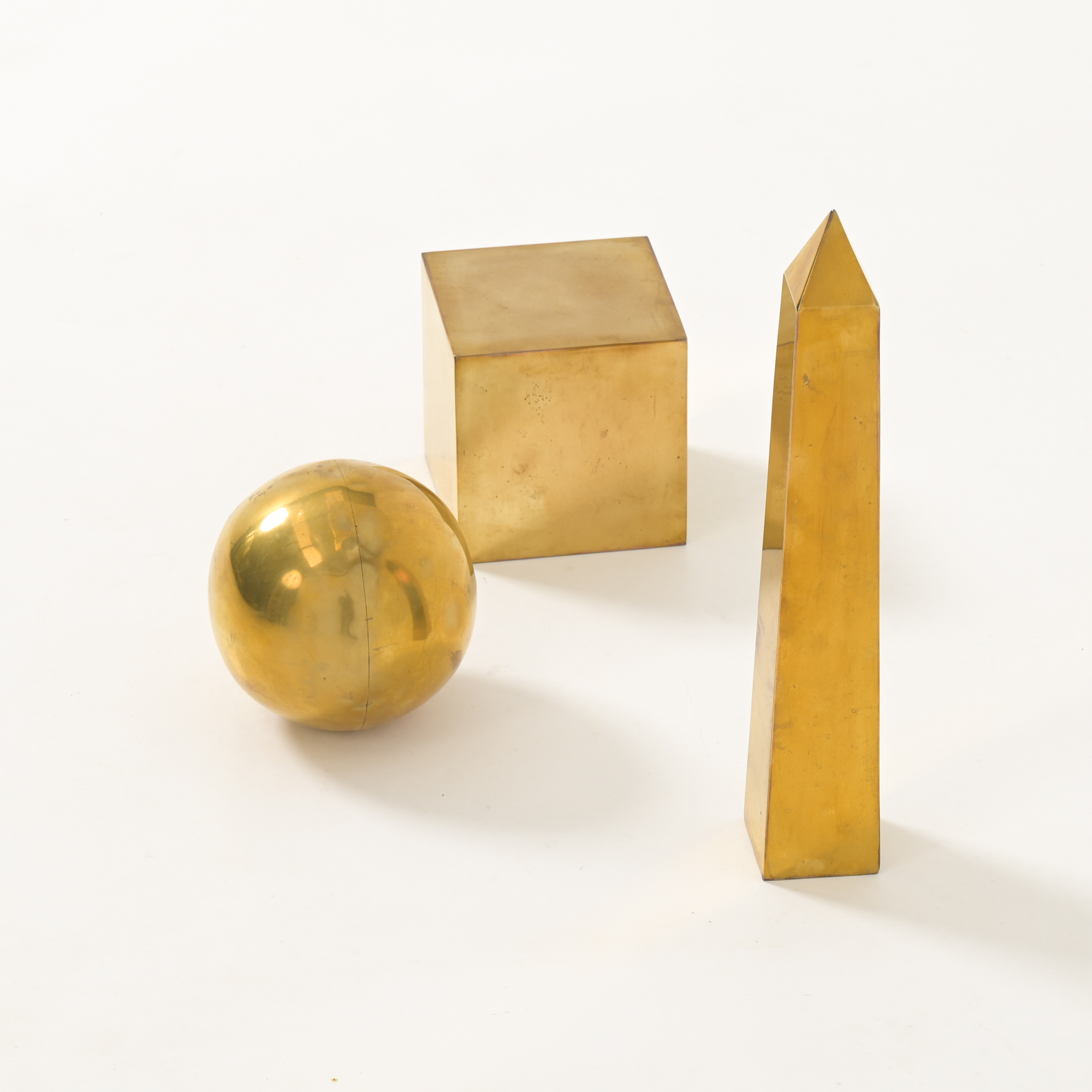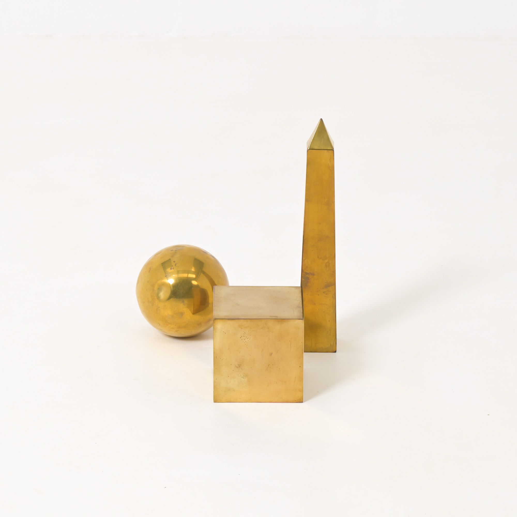 This set of brass sculptures consists out of three geometric shapes, one of which is stamped by the Spanish manufacturer Sarreid.