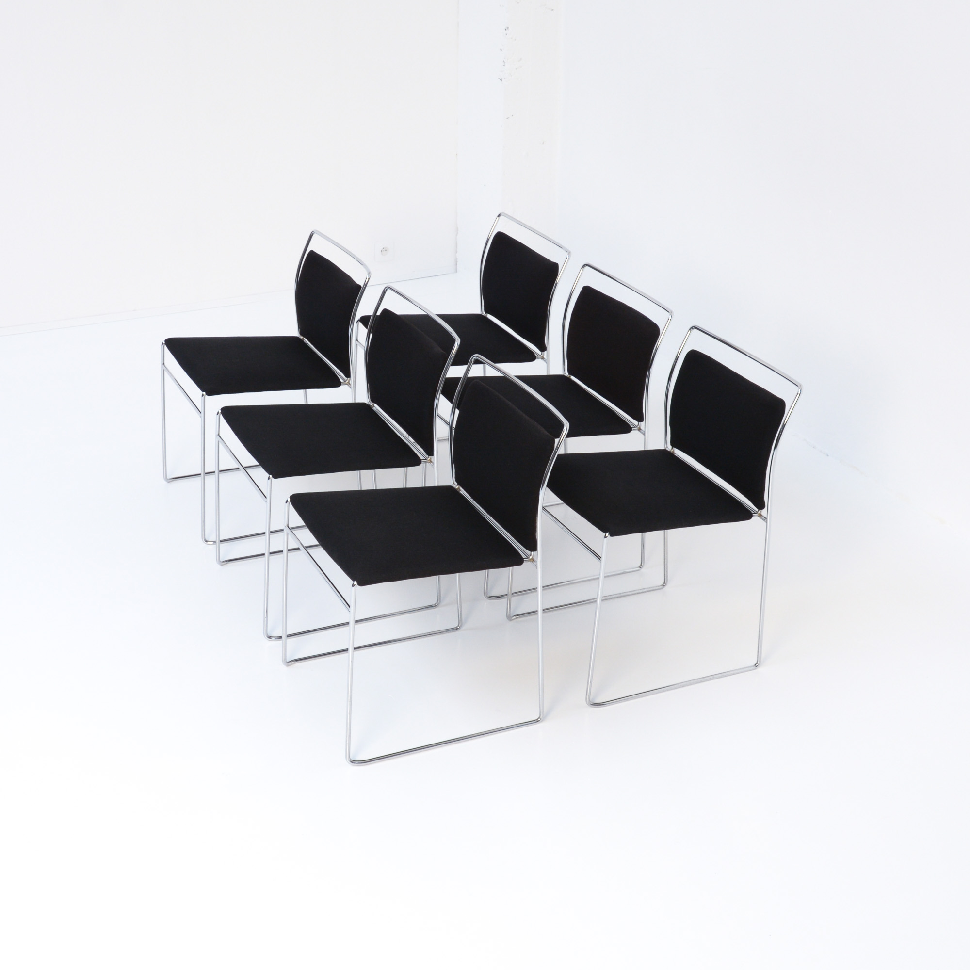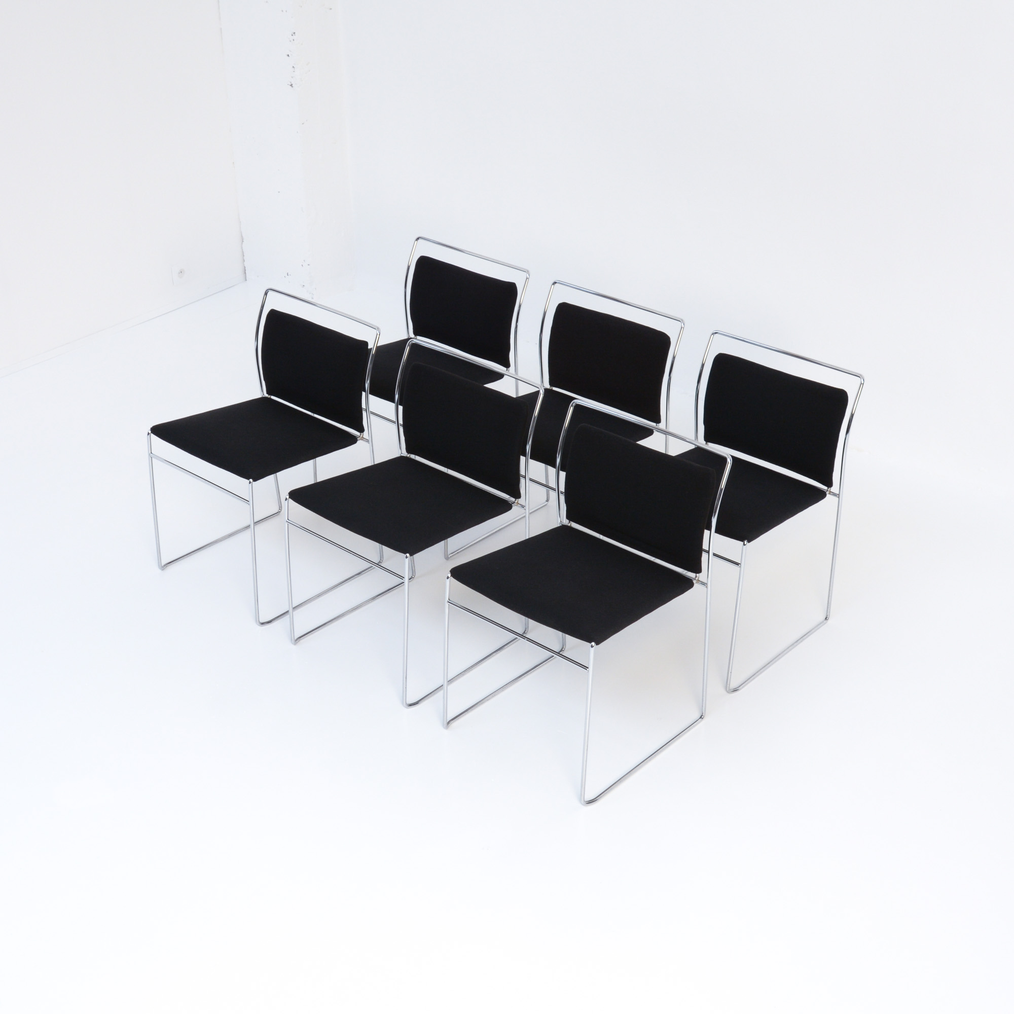 These elegant chairs are in very good authentic condition. They are an early production of Simon International and marked with a label and a ‘S’ in the chromed metal. The black upholstery is cleaned and in good condition, with normal signs of age and use.