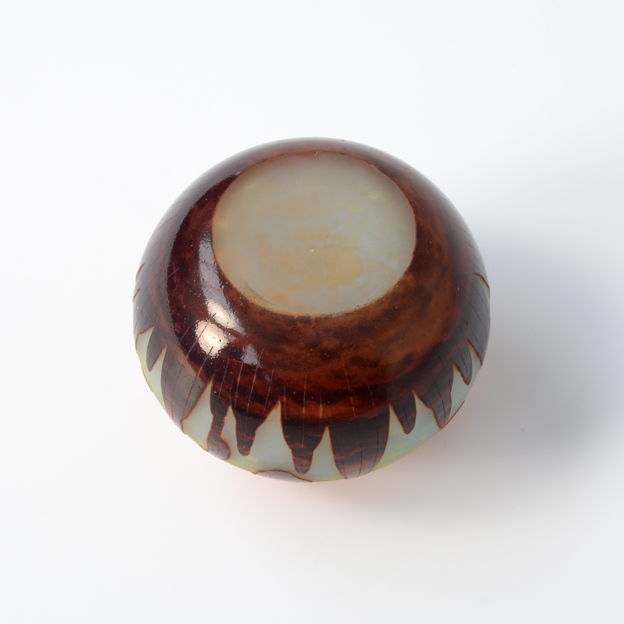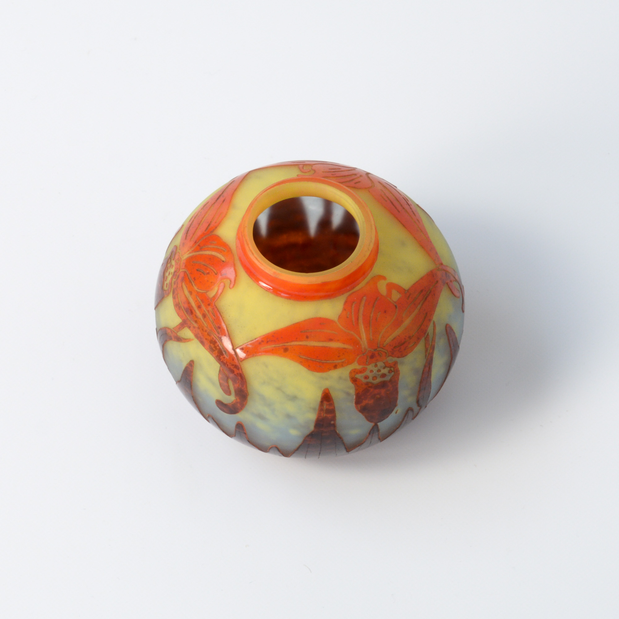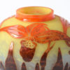 This Art Deco glass vase can be dated in the late 1920s. The white and yellow powdered glass  was overlaid in orange and brown. It is acid etched and wheel carved in floral motifs by Le Verre Français.