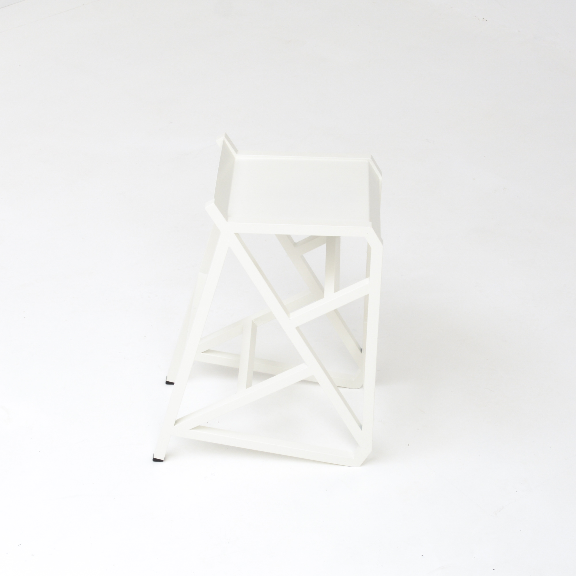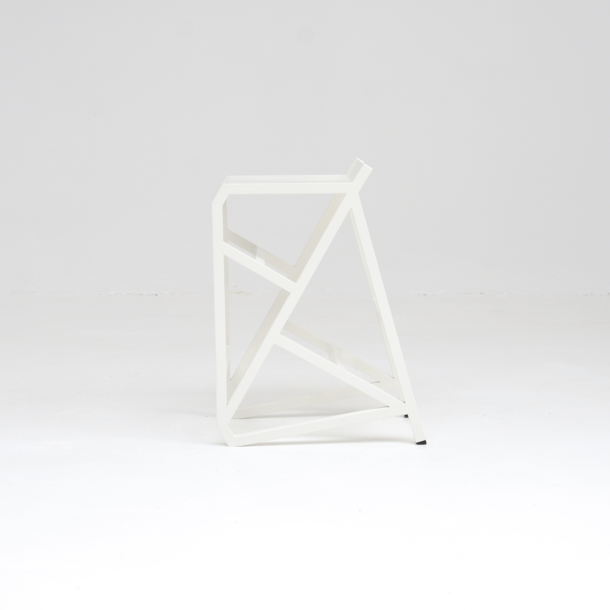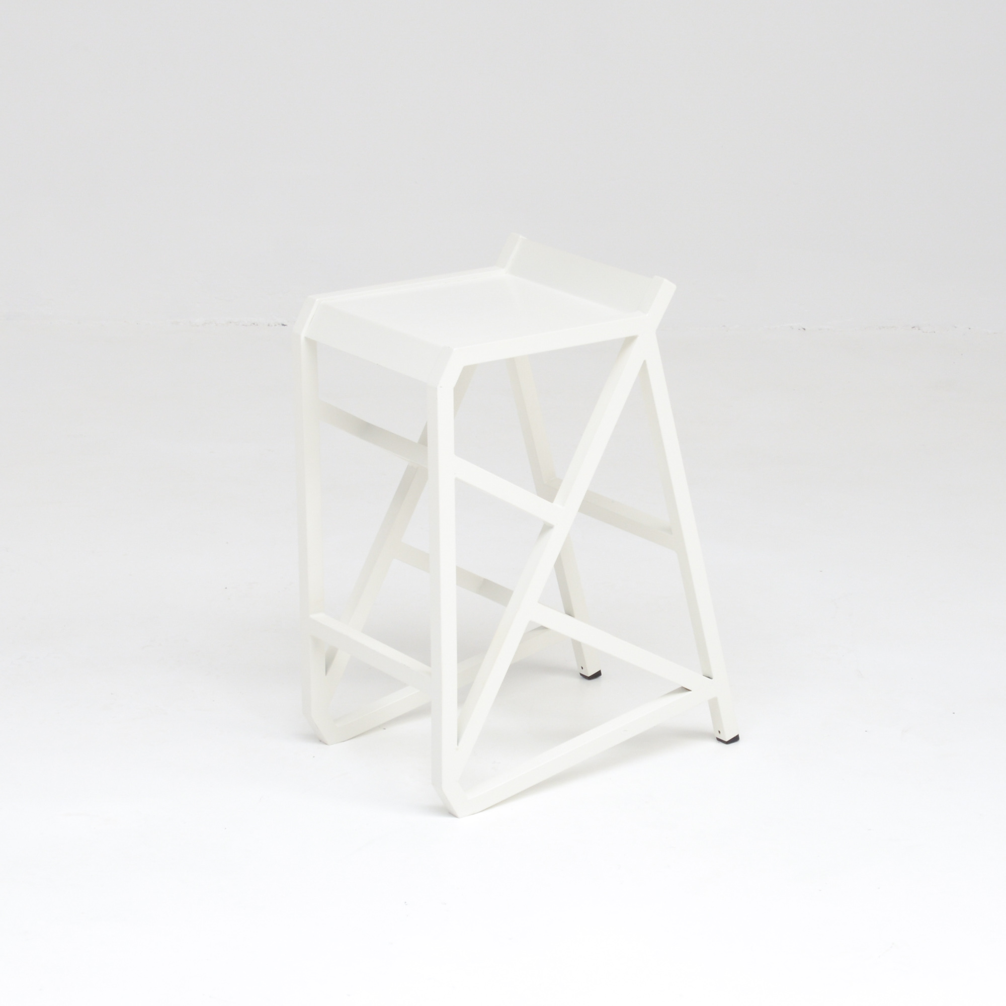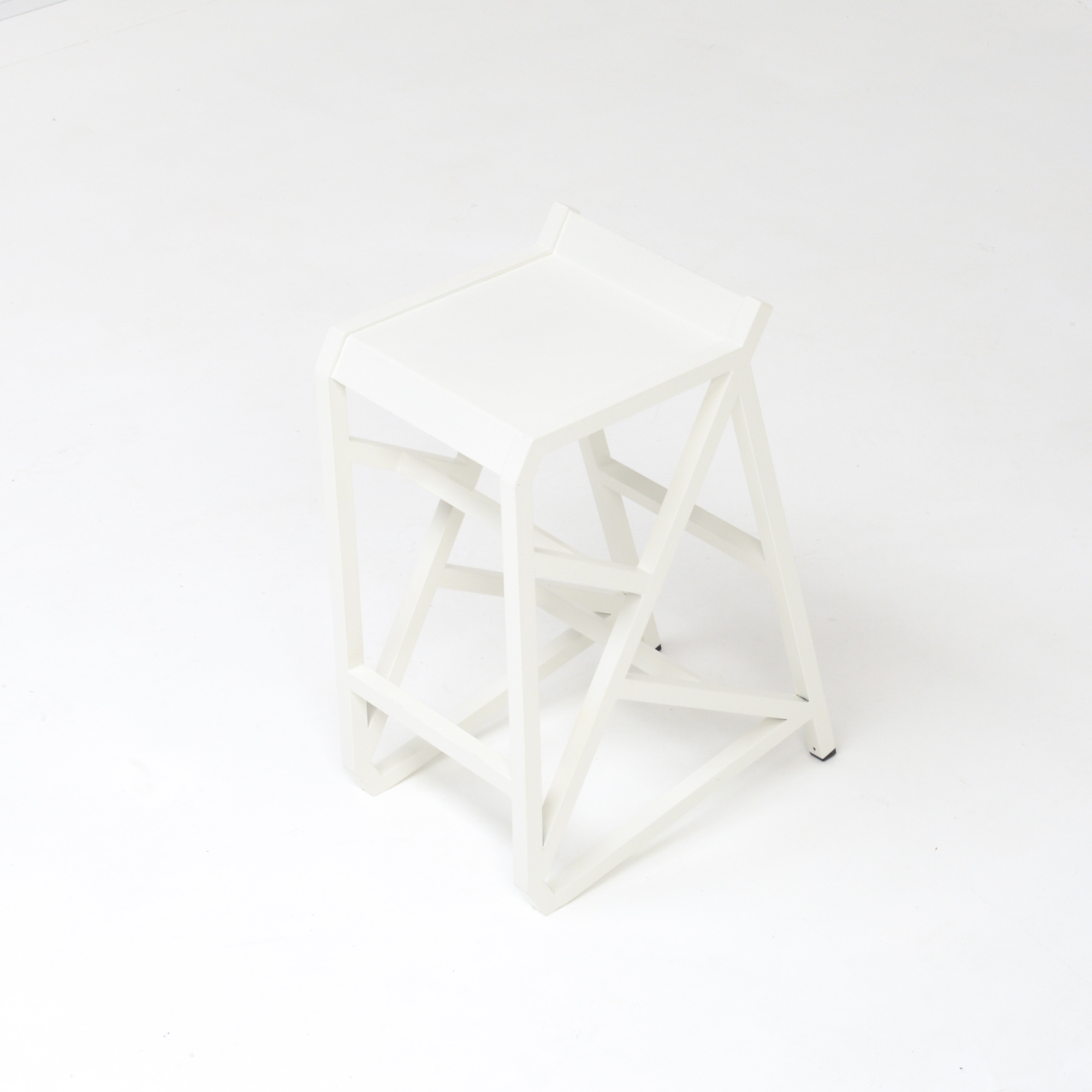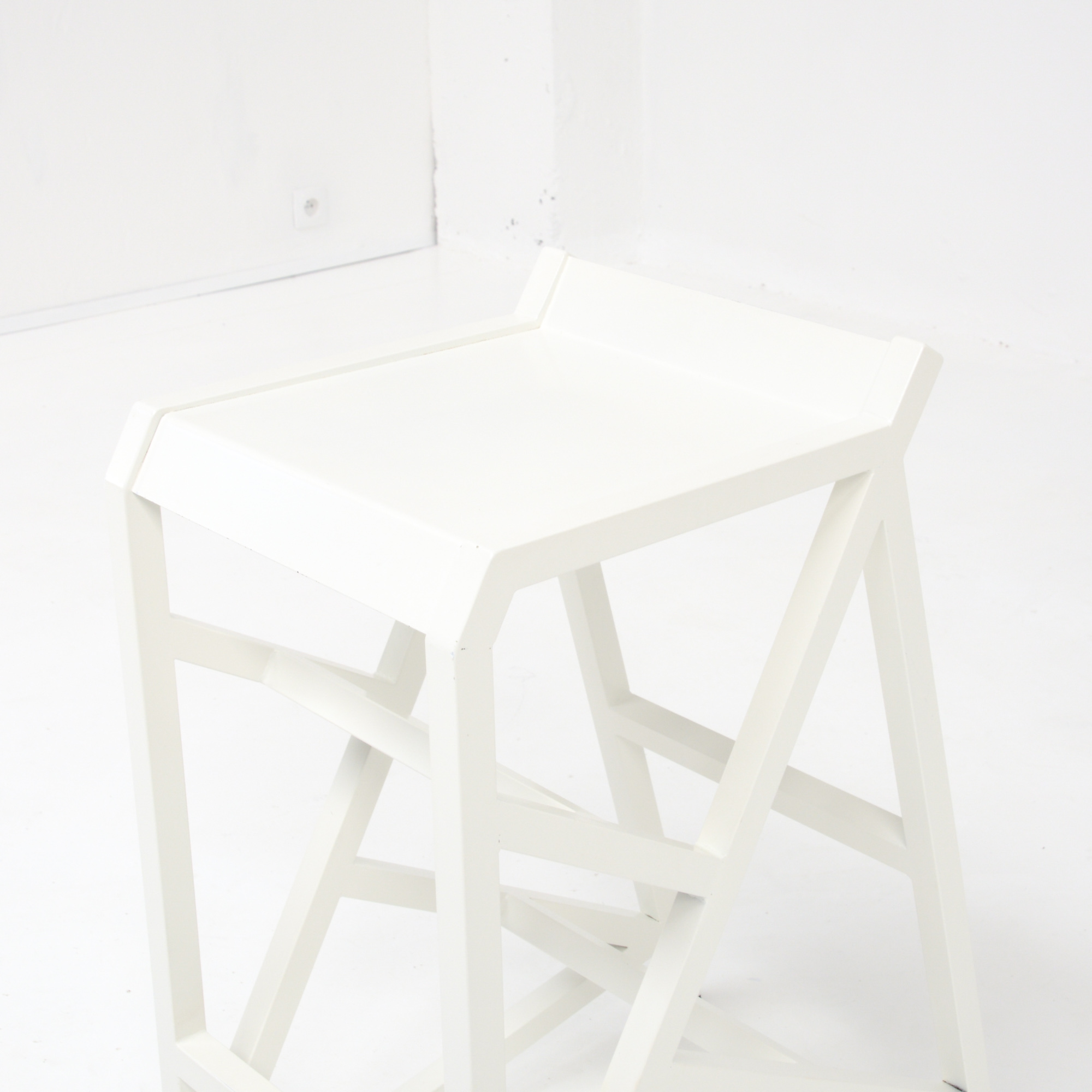 The stool is a unique piece made of white lacquered metal.