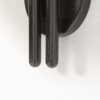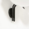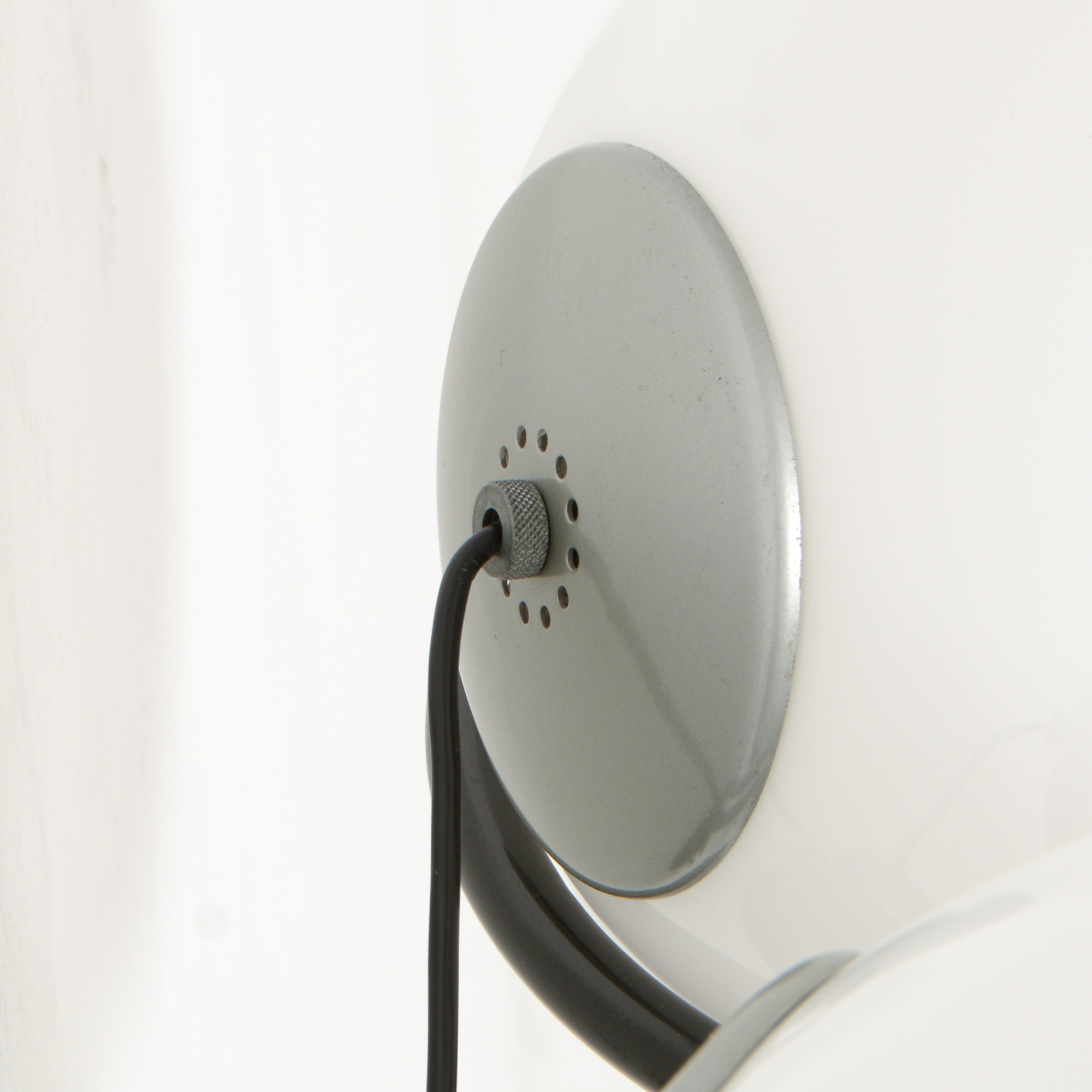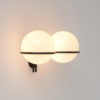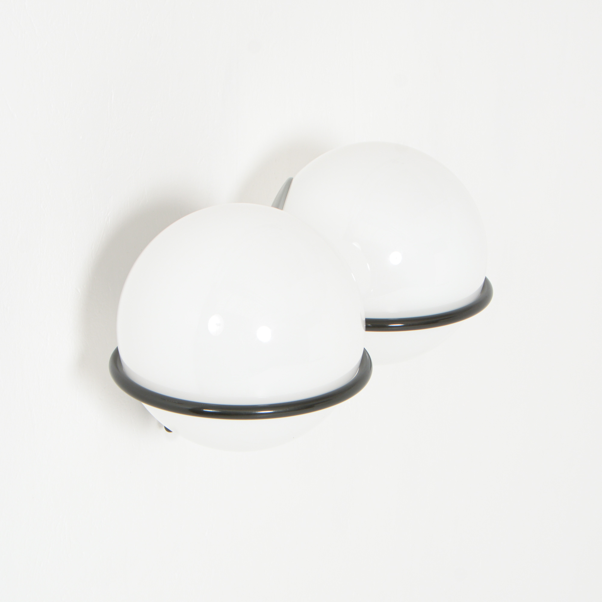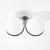 The black lacquered metal frame holds 2 white glass spheres, 30 cm diameter.