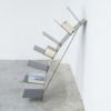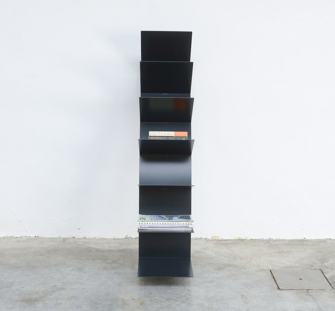 It is made of dark bluish grey metal, finished with wooden slats to place it against the wall. This bookshelf does not have to be attached to the wall.