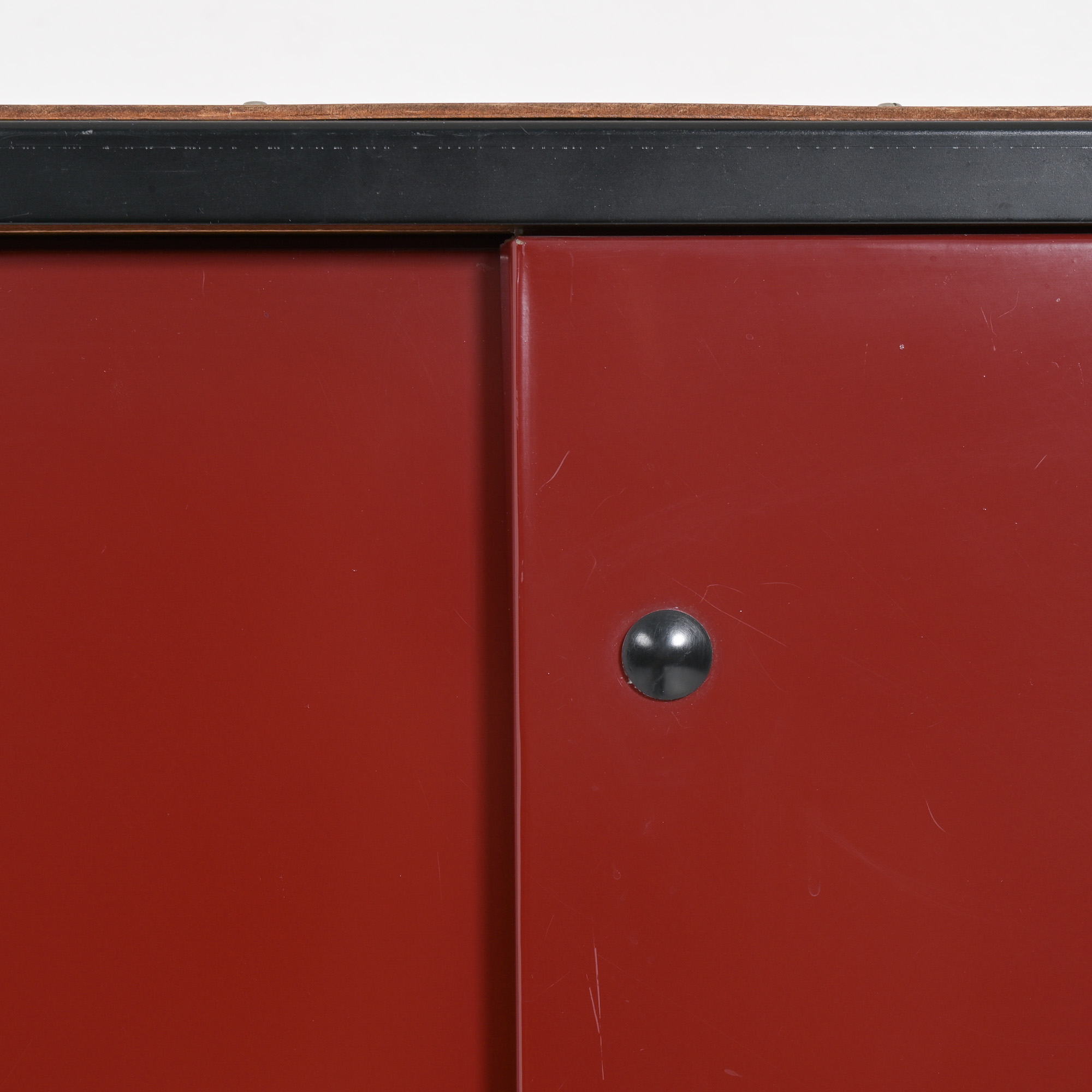 This medium-sized wardrobe has 2 dark red lacquered metal sliding doors with elegant wooden handles.