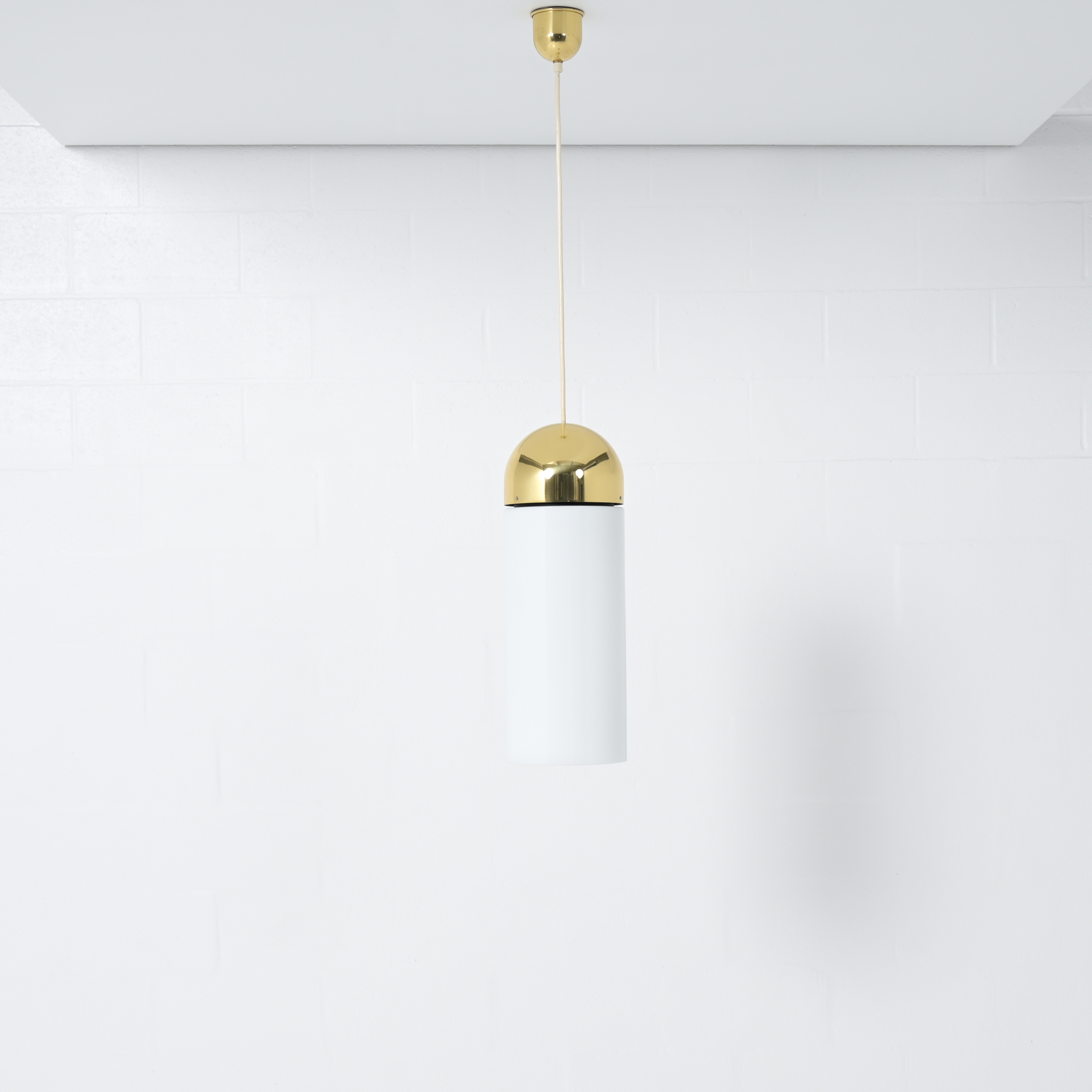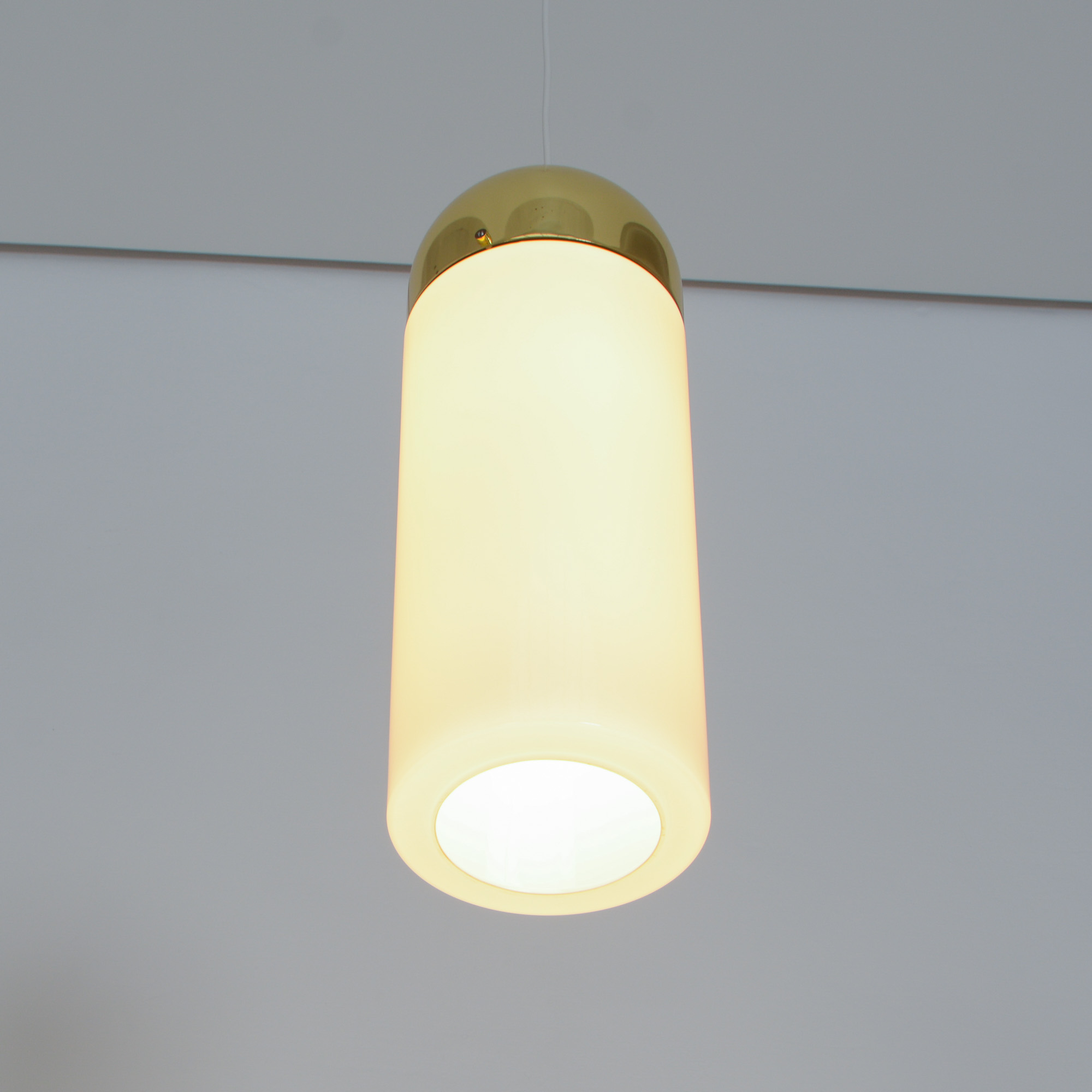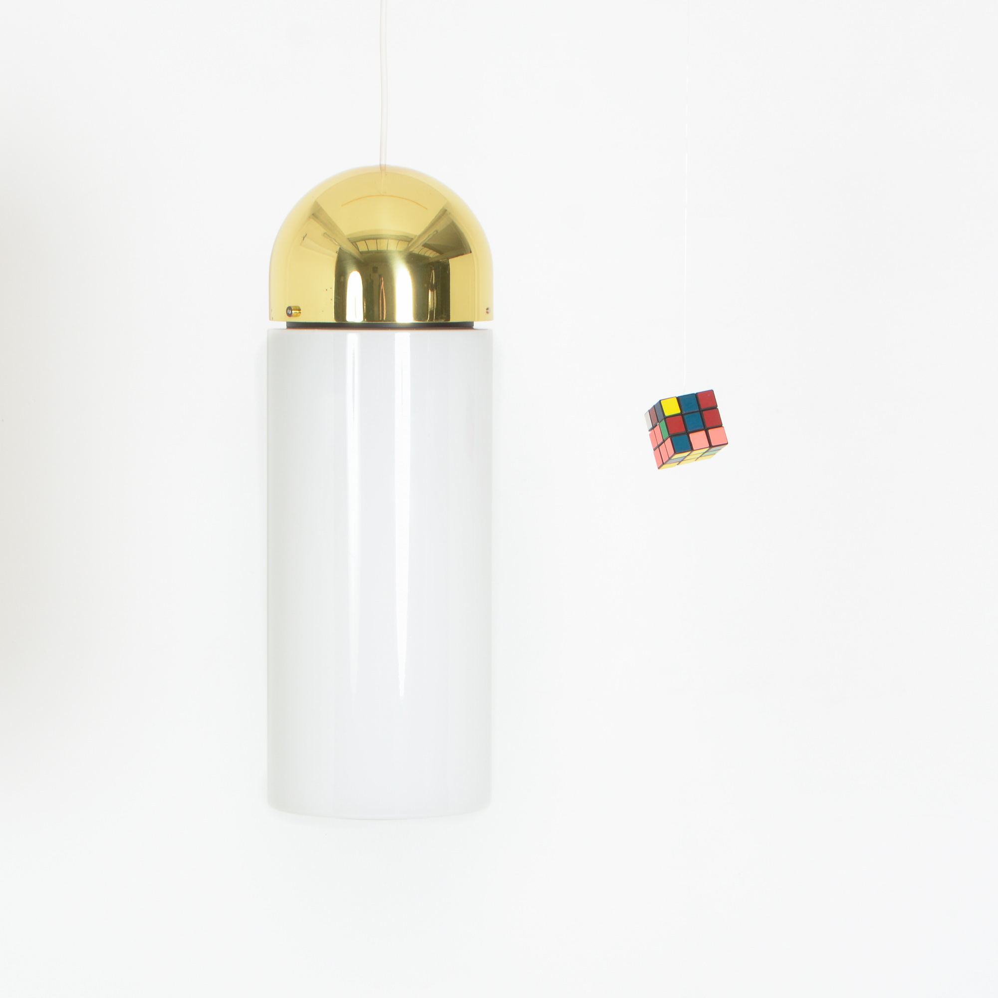 This large cylindrical pendant lamp was created by Glashütte Limburg in the 1980s. This stylish lamp is made of white glass and brass.