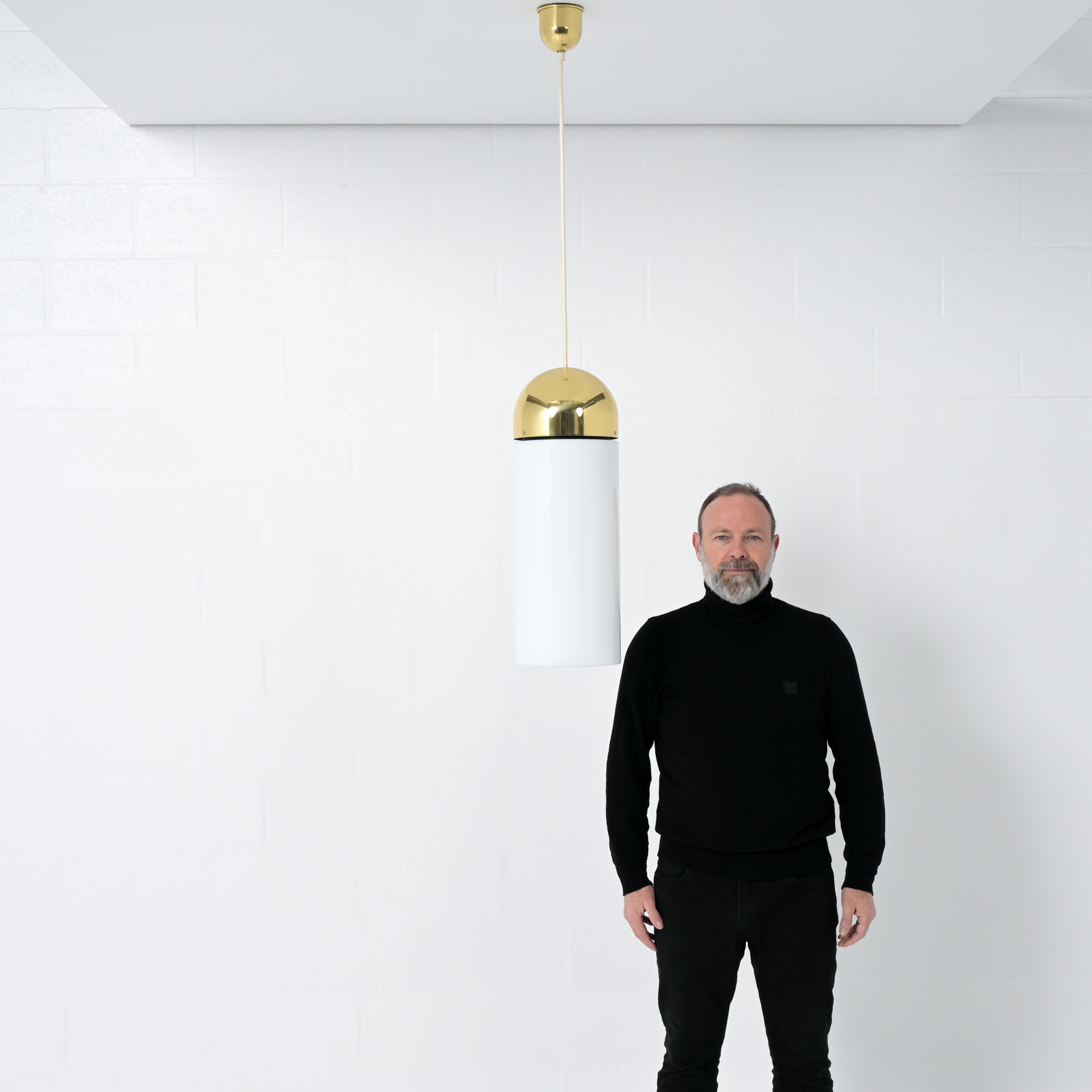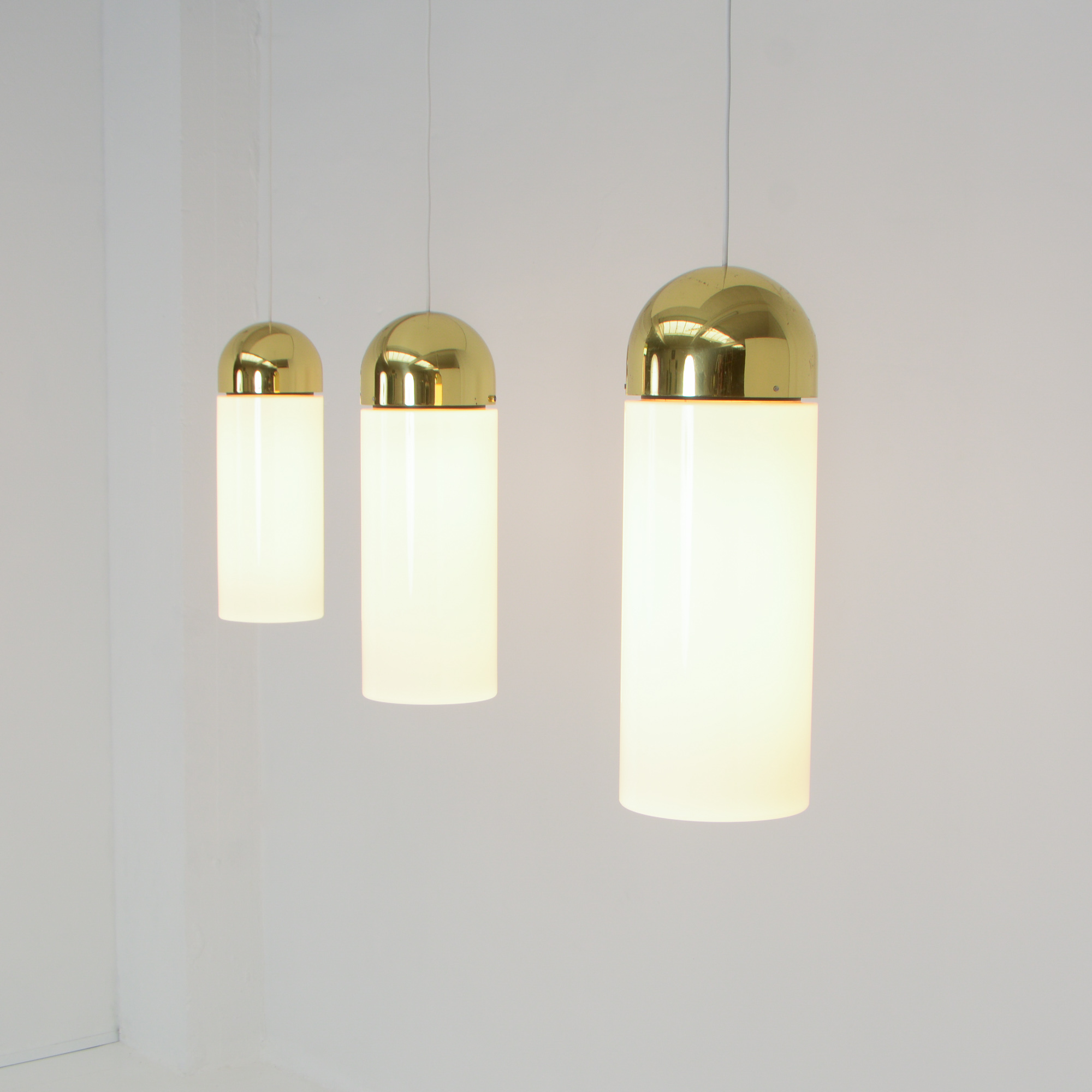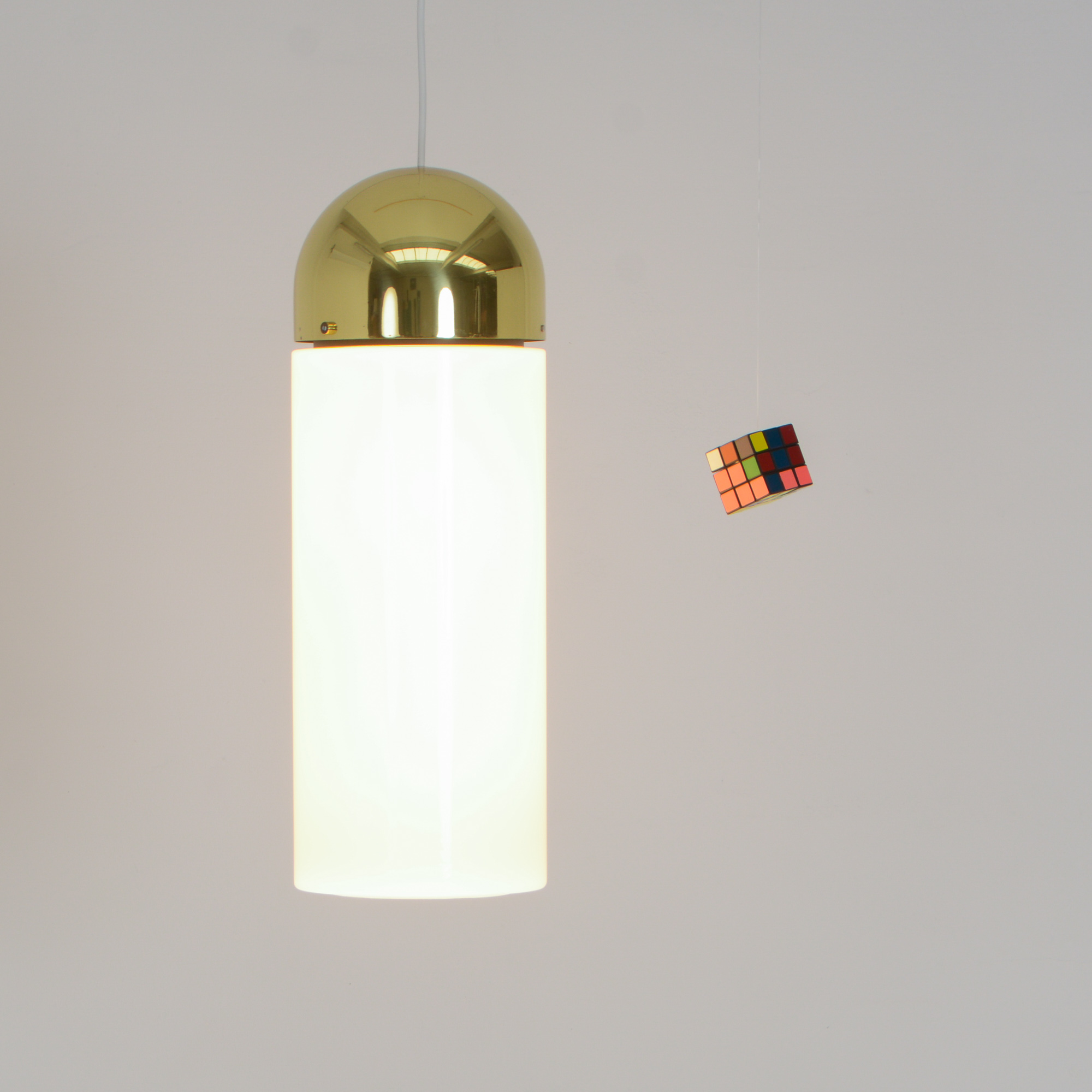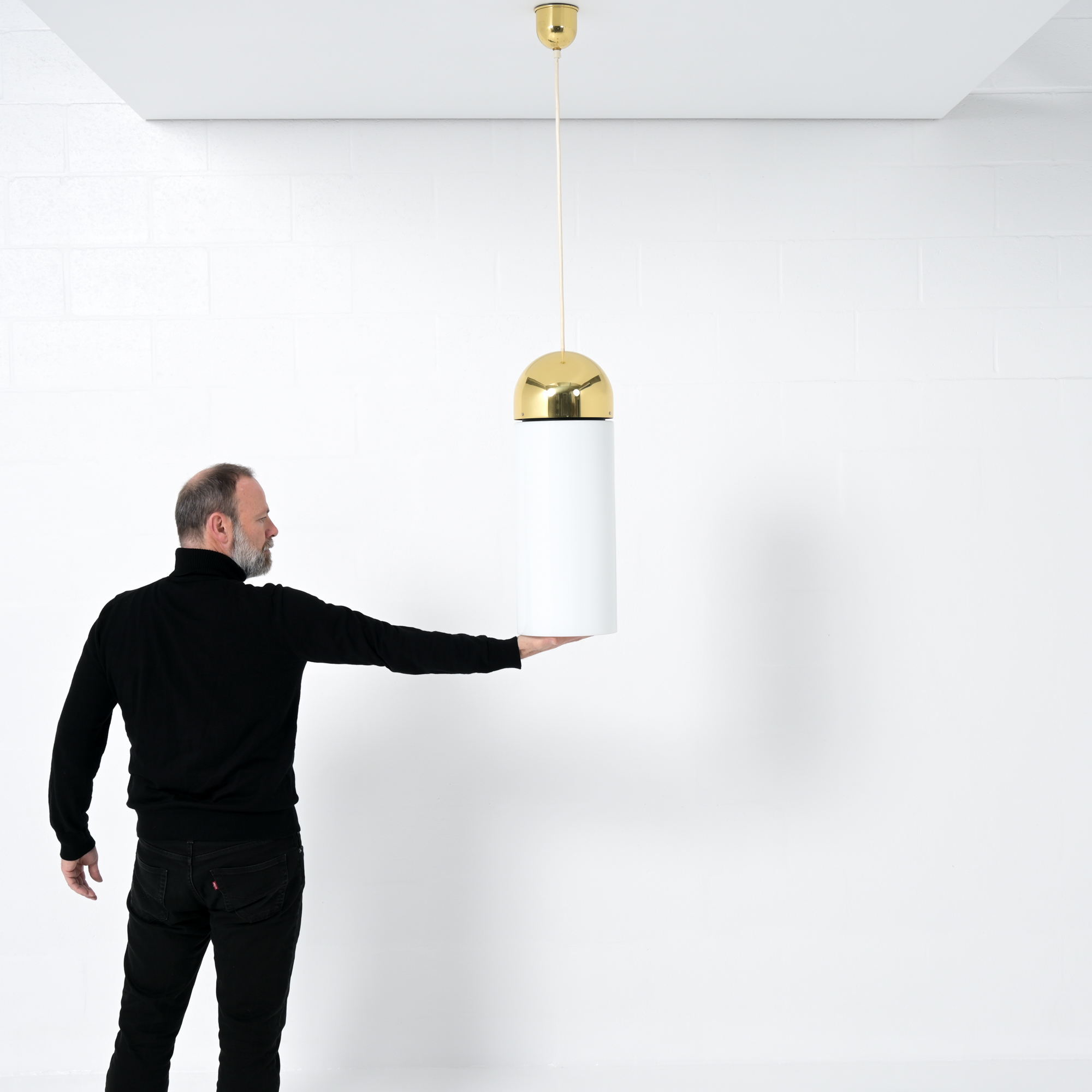 This large cylindrical pendant lamp was created by Glashütte Limburg in the 1980s. This stylish lamp is made of white glass and brass.
