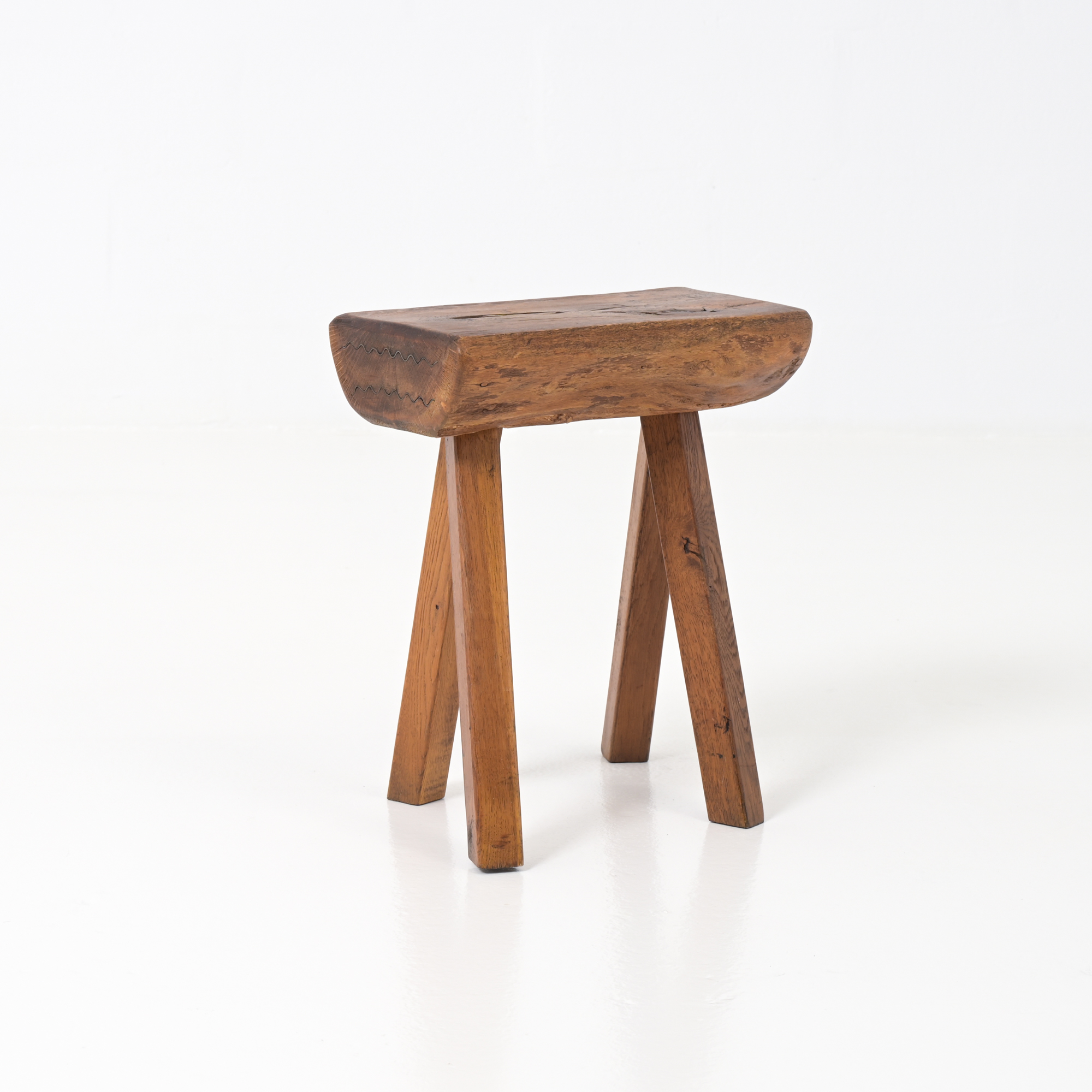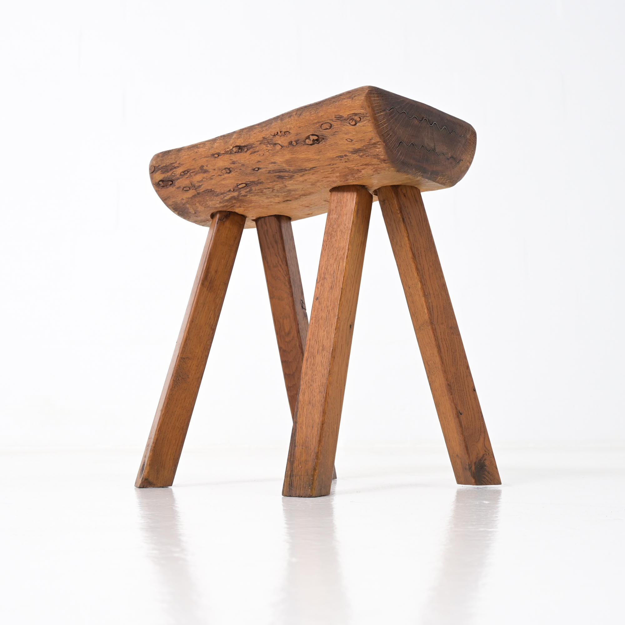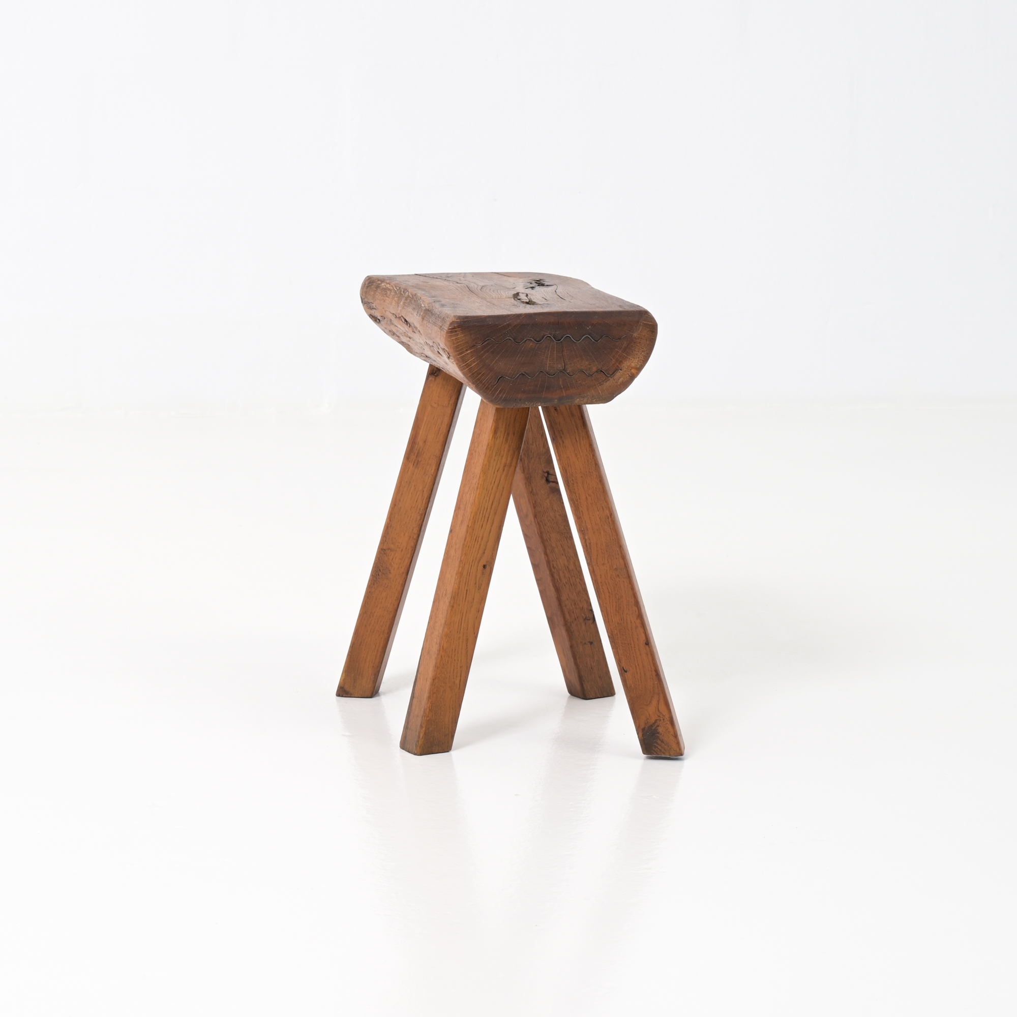 This authentic wooden stool is old and completely made of wood. It was made by Mobichalet and can be dated in the 1950s.