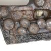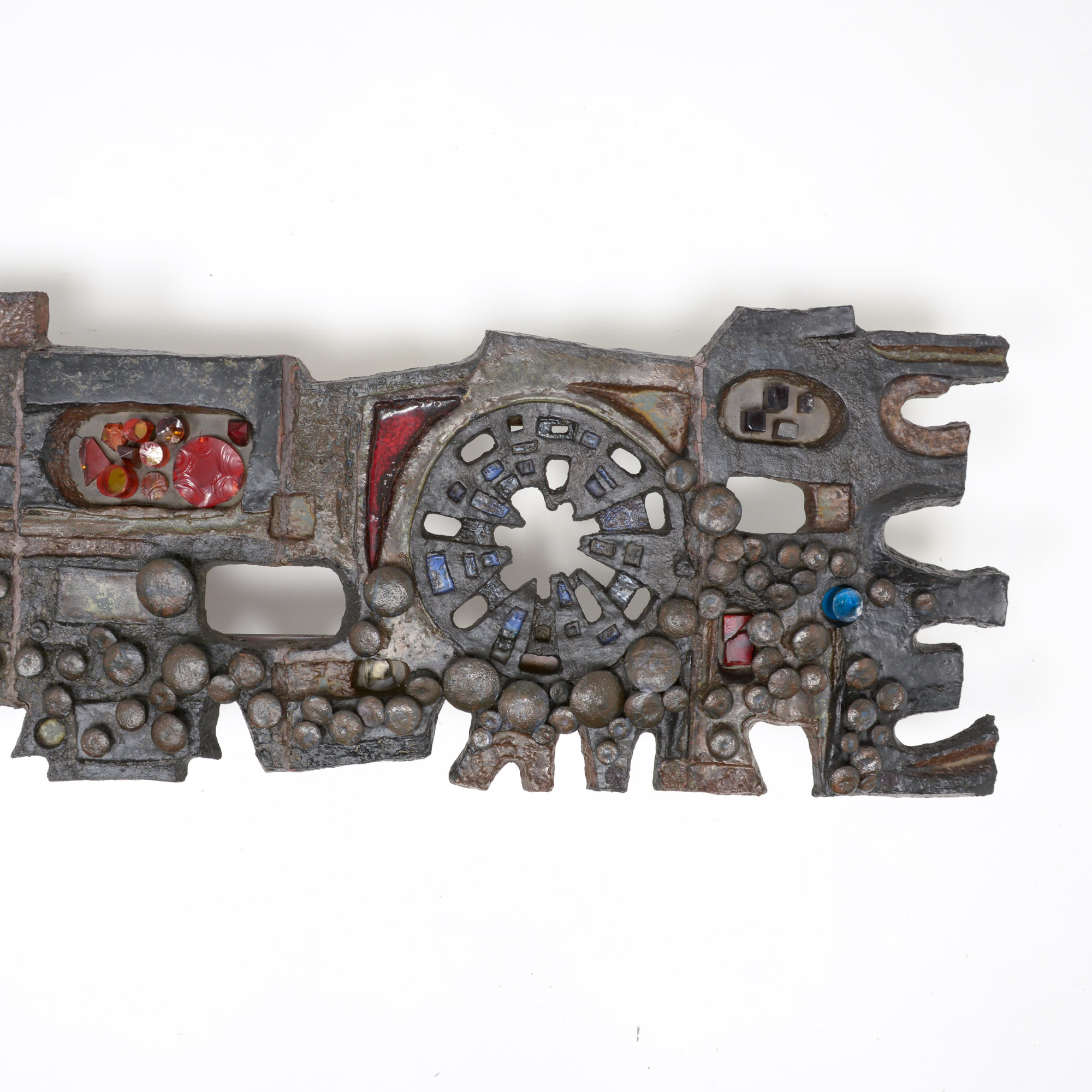 This brutalist artwork is a great example of craftsmanship. The design is extraordinary with the special glaze, the openwork and the glass details in blue and red.