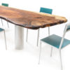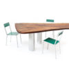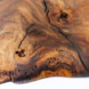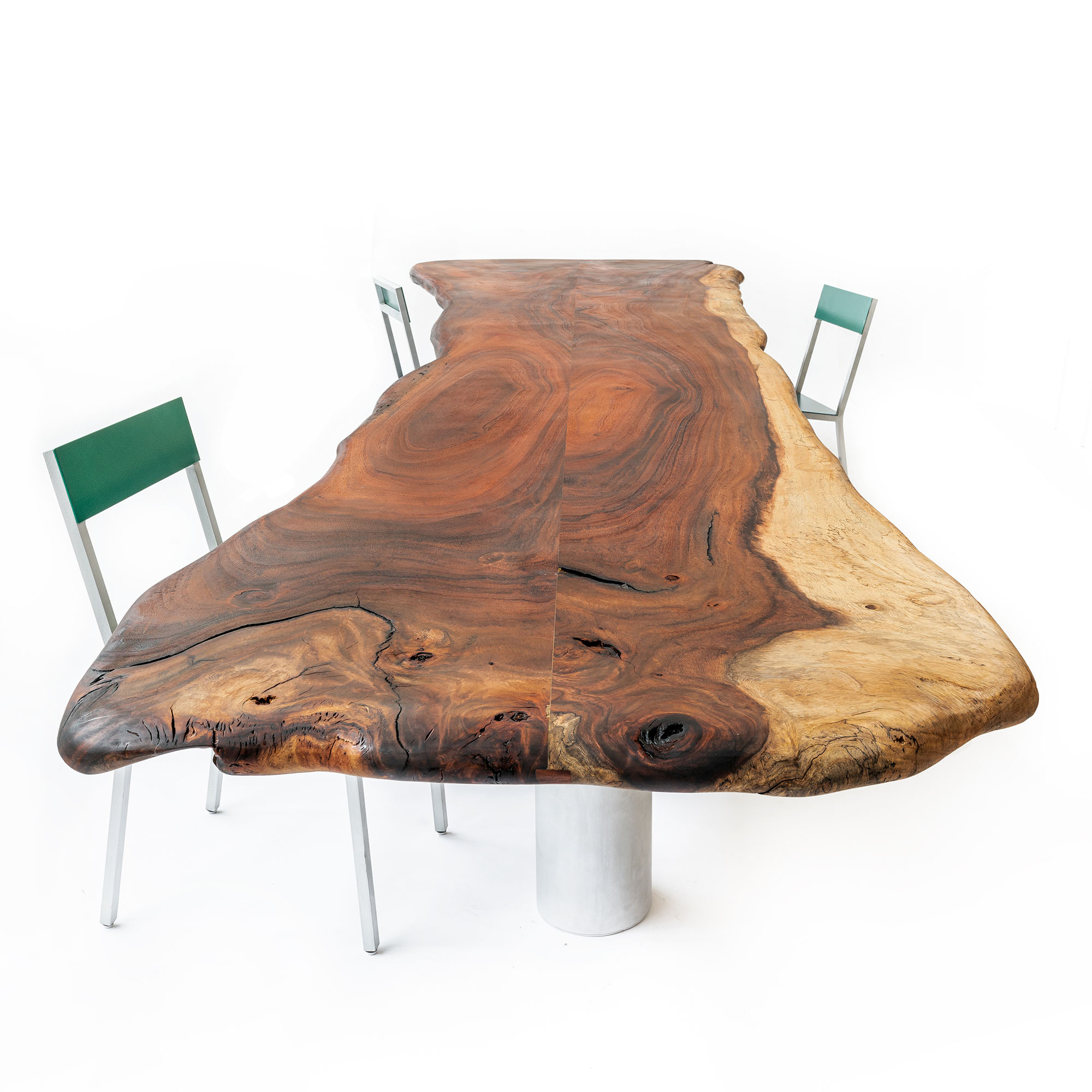 The Parota wooden top rests on 3 sanded aluminum adjustable cylindric bases. Inherent to the wood there are crevices in the table top.