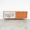 This high quality sideboard is still in very good vintage condition, complete original, with 2 sliding doors, 6 inside drawers and 6 brass feet. There is a little crack in one tile caused by the baking process.