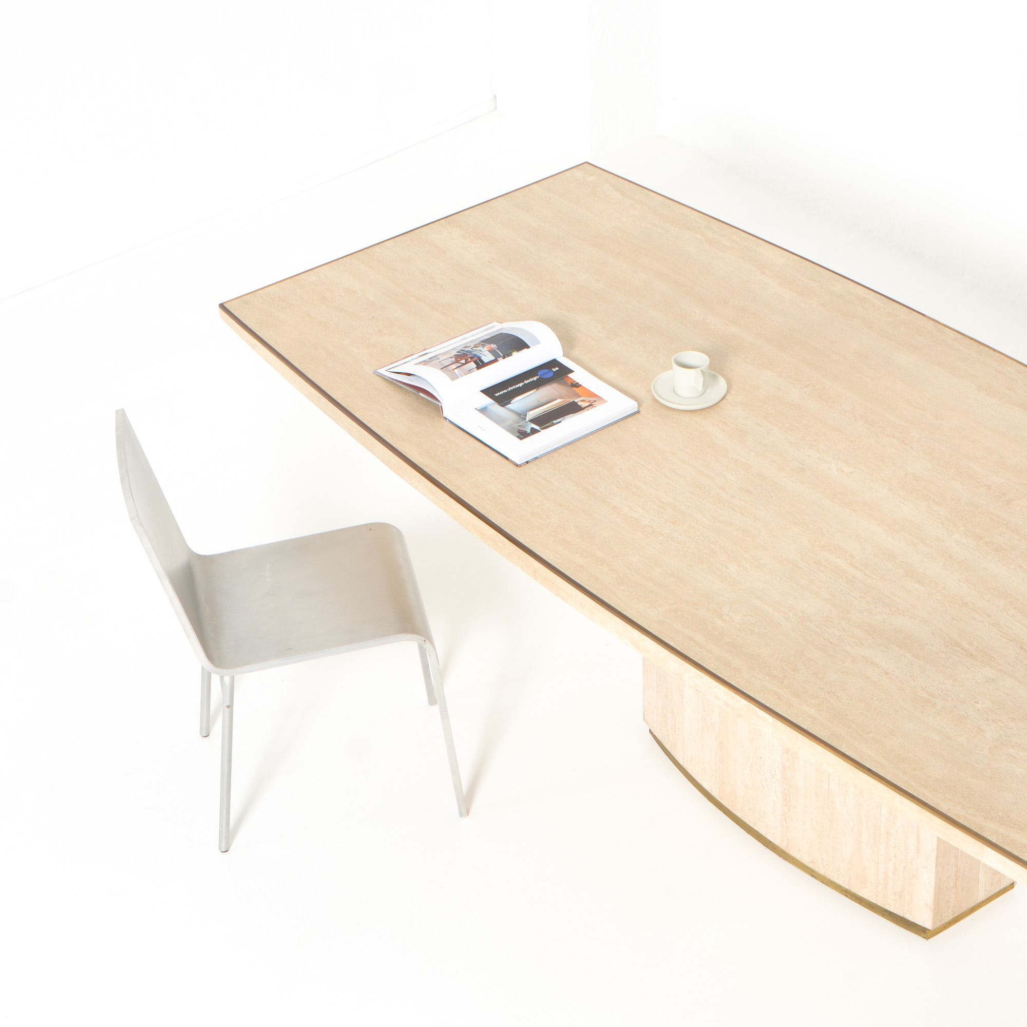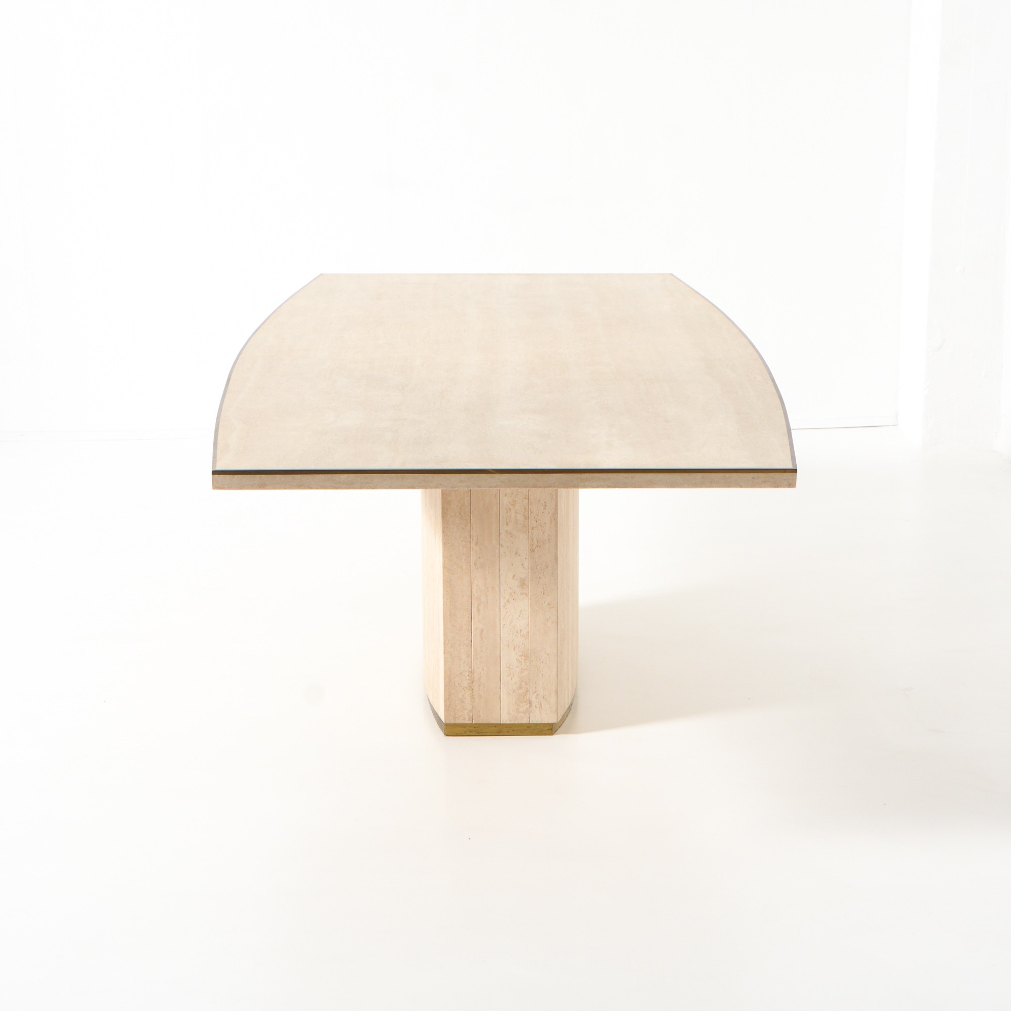 The dining table has a solid travertine top with brass edges. The base is also made of travertine and finished with brass.